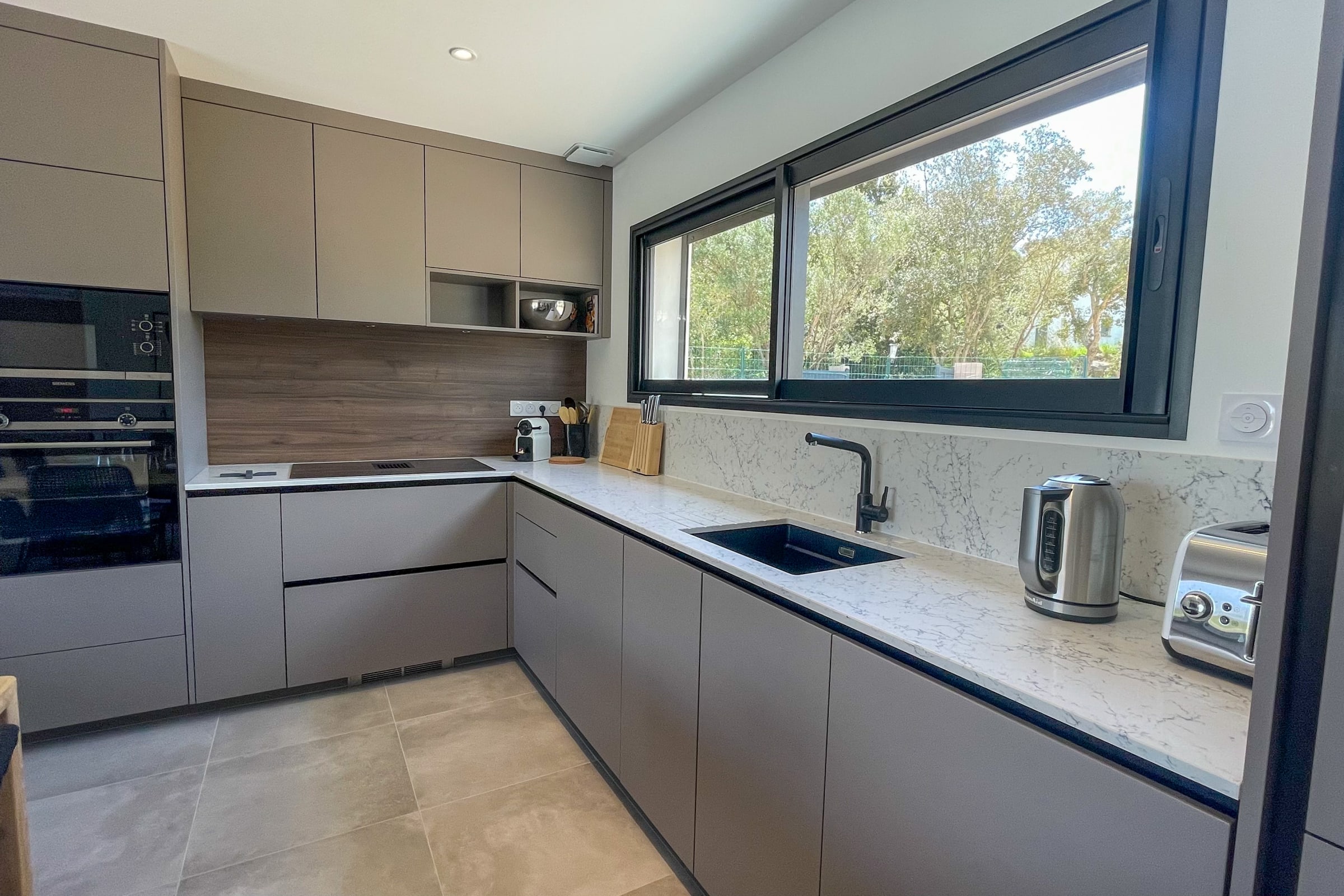 Very bright single-storey villa, with access to the terrace and the garden, by large windows with glazing.