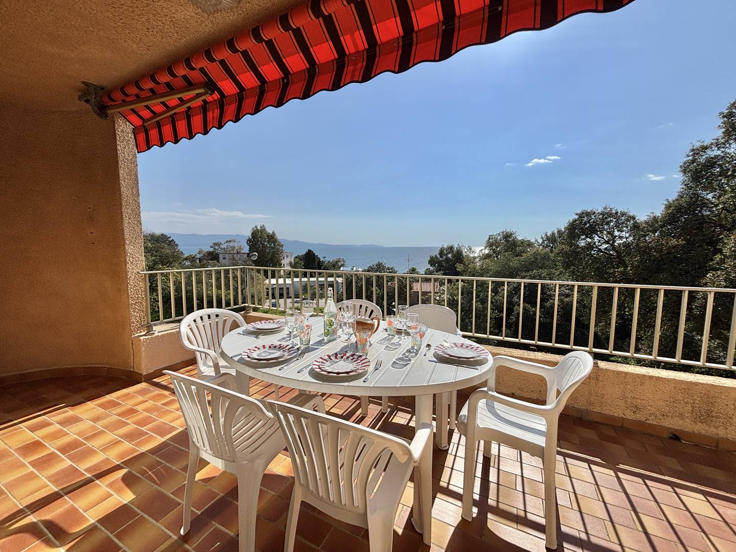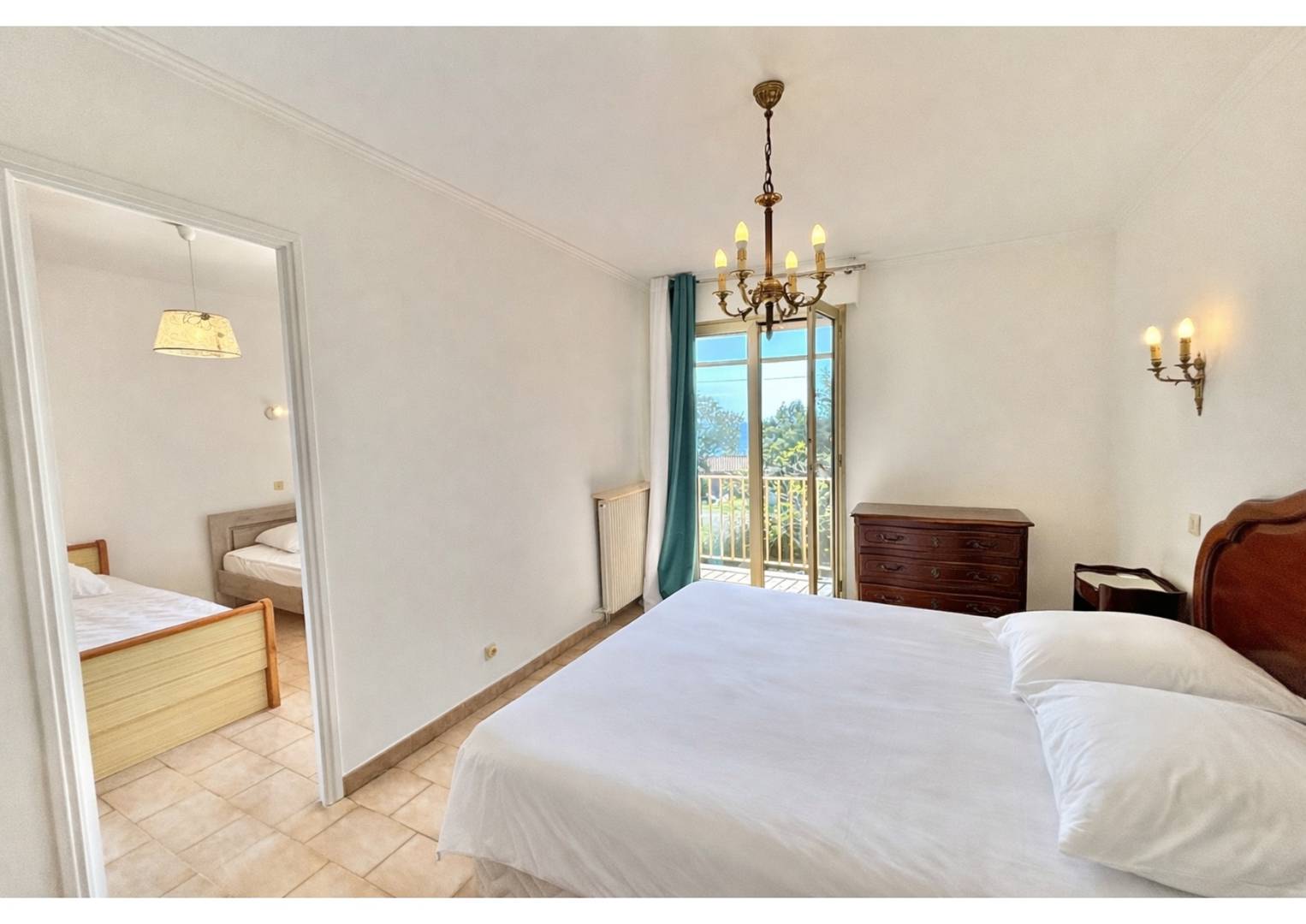 An entrance hall, a separate kitchen opening onto the veranda, a bedroom with a double bed and en-suite bathroom, a separate WC, and a spacious, air-conditioned living room opening onto a terrace with sea views. On the lower floor, there are two bedrooms opening onto a terrace leading to the garden, a bathroom, and a separate WC.