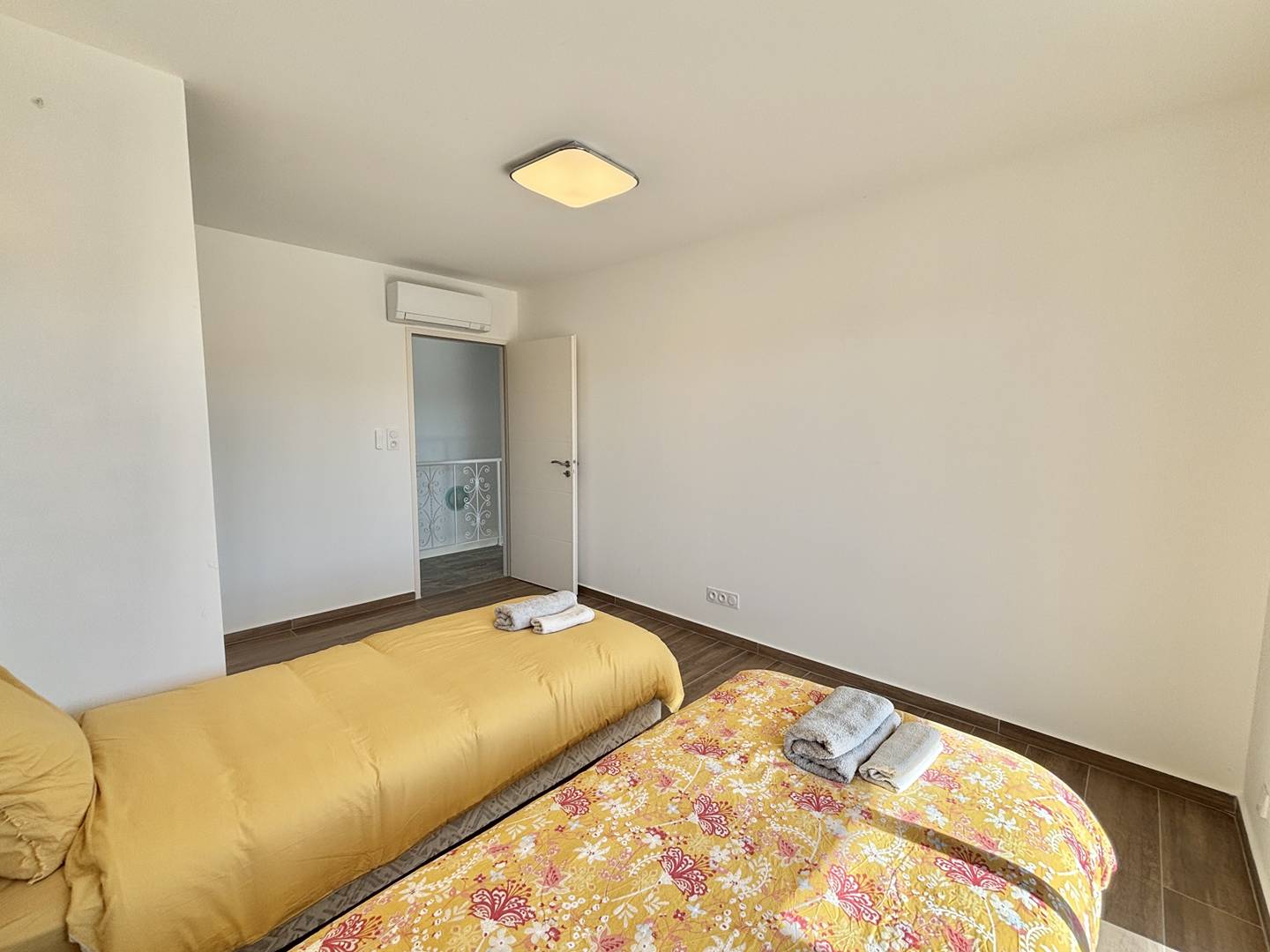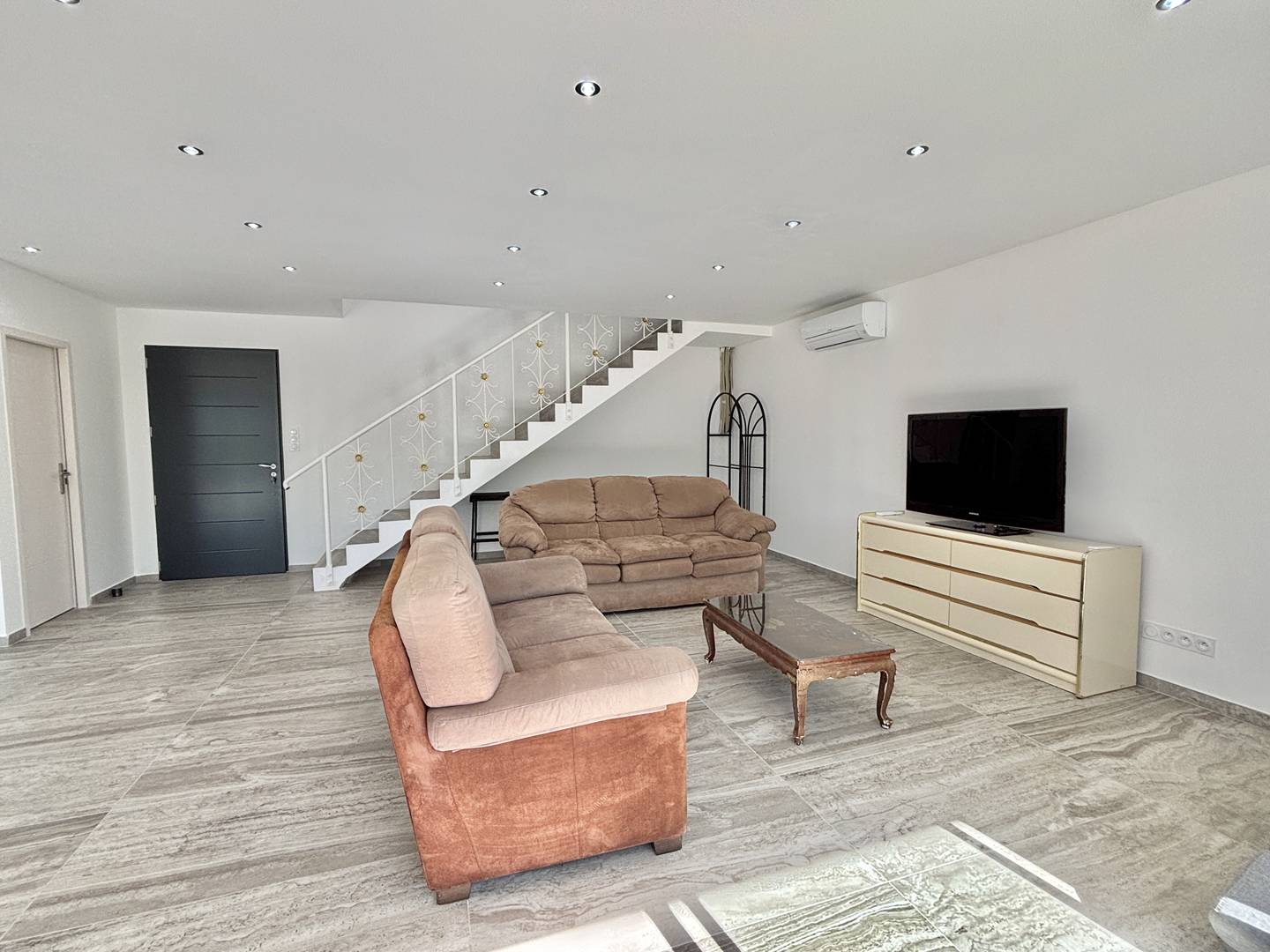 It comprises: an entrance leading to a spacious, air-conditioned living room/kitchen, a separate WC, and a laundry area. Upstairs, there are three lovely air-conditioned bedrooms opening onto a balcony, a shower room, and a separate WC.