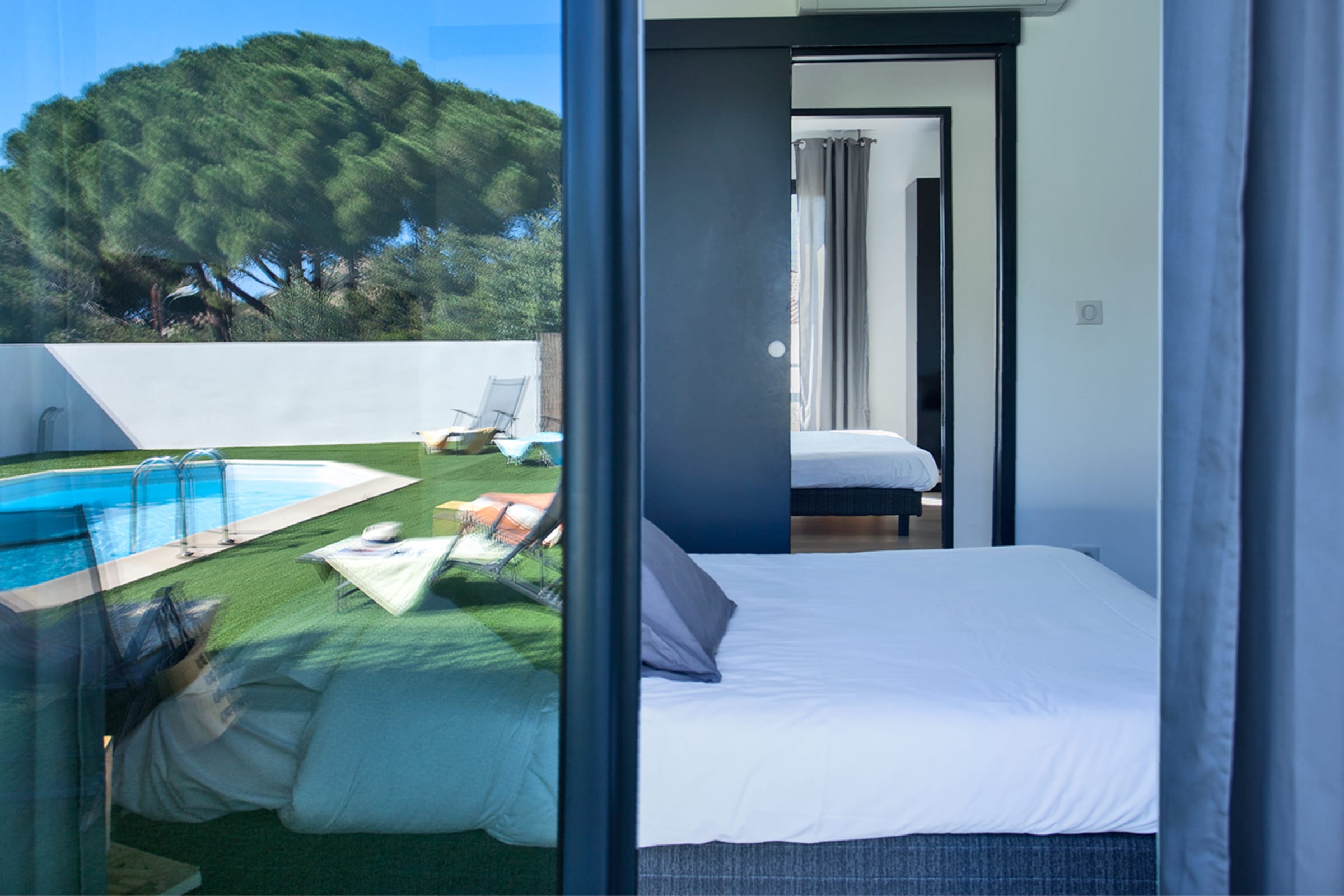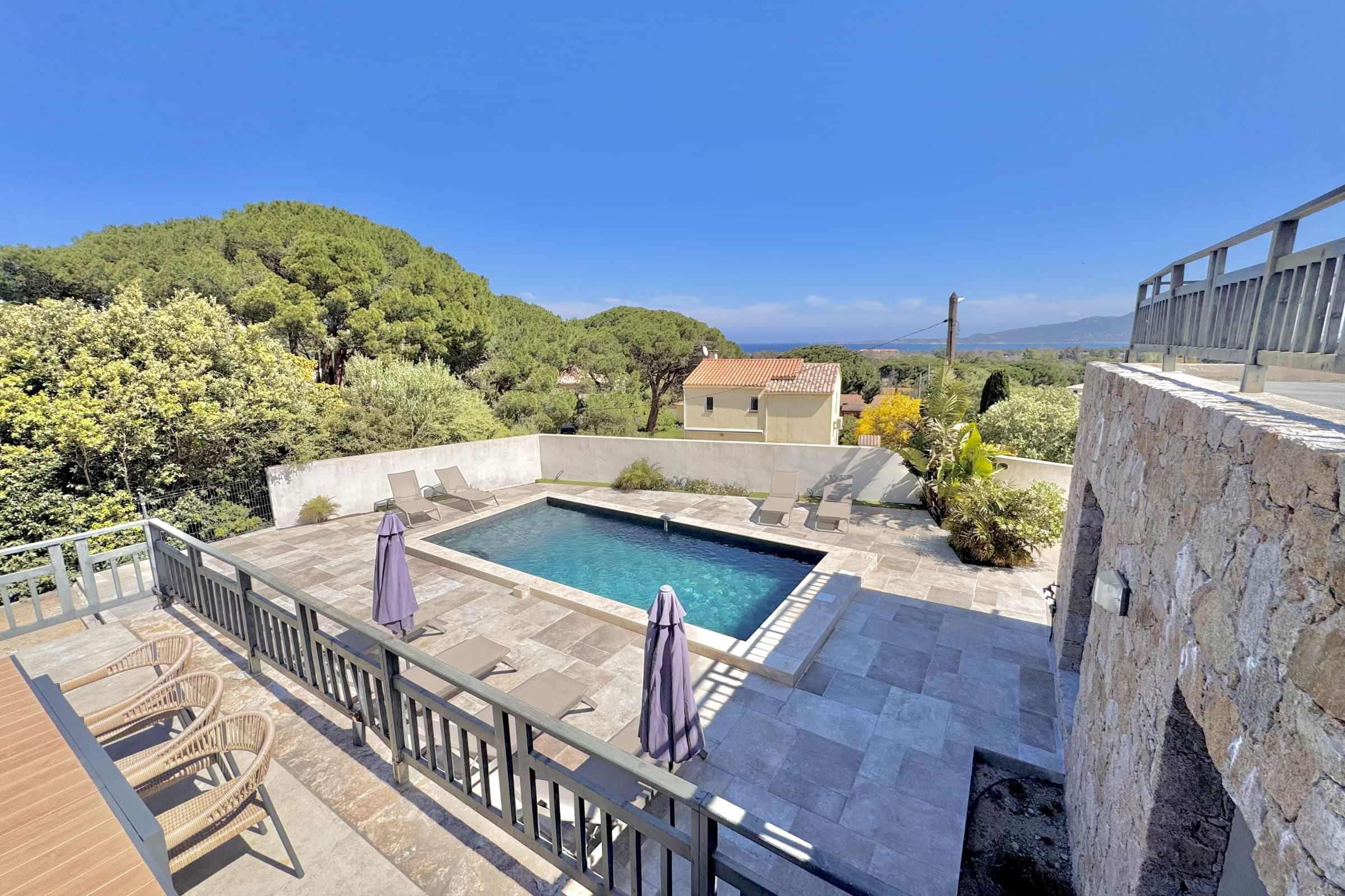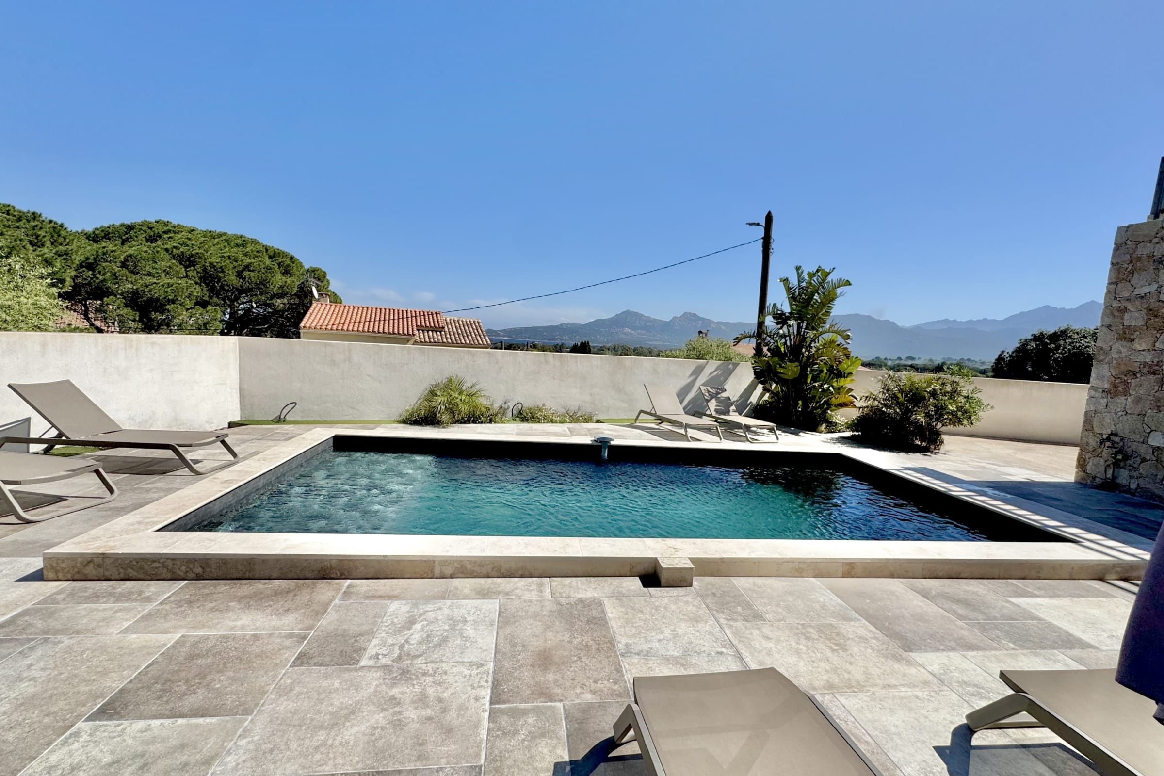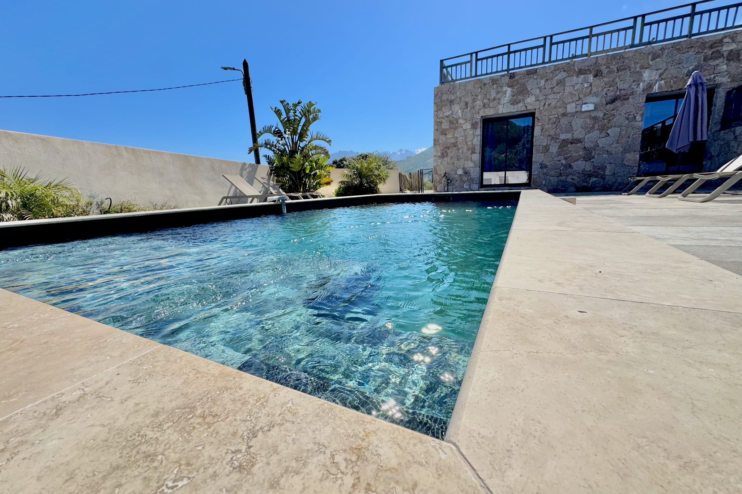The swimming pool located below the villa is accessible from the living room and the bedrooms.