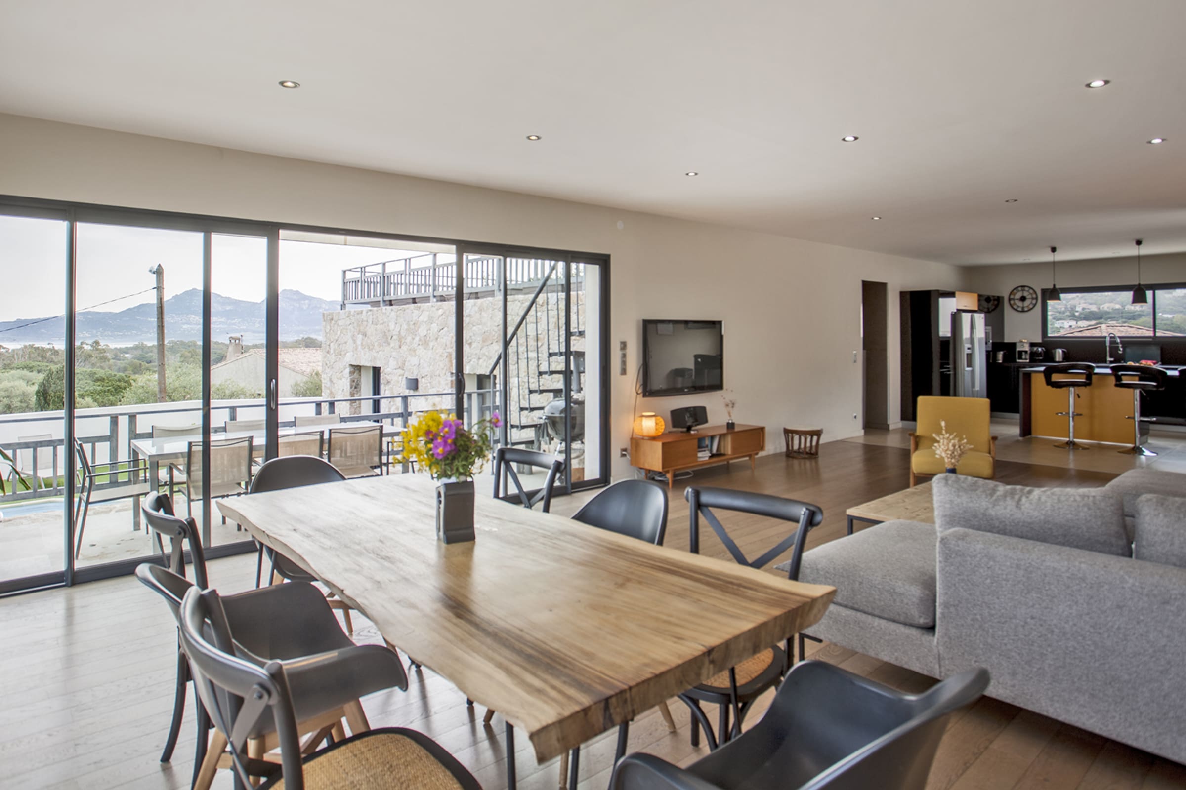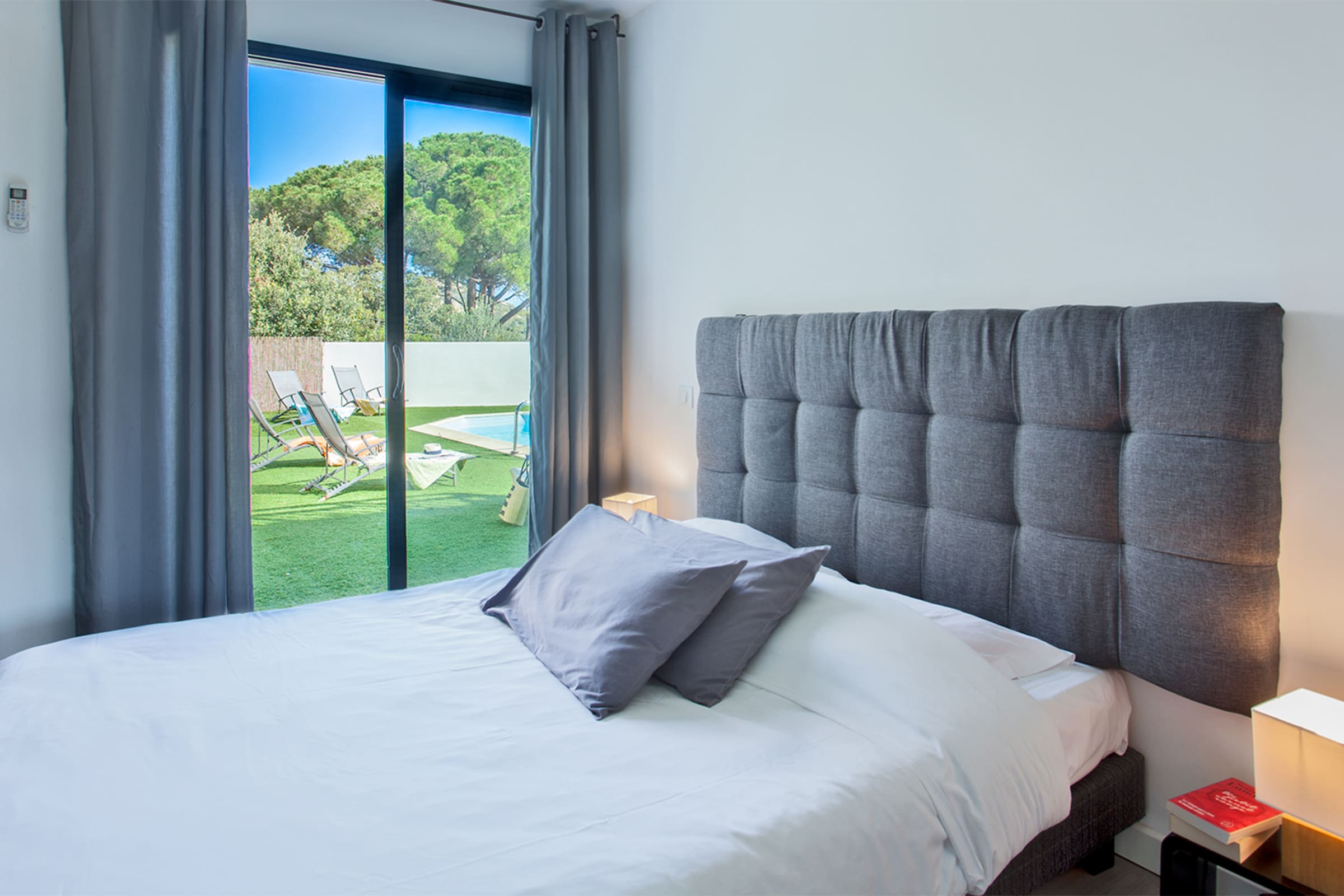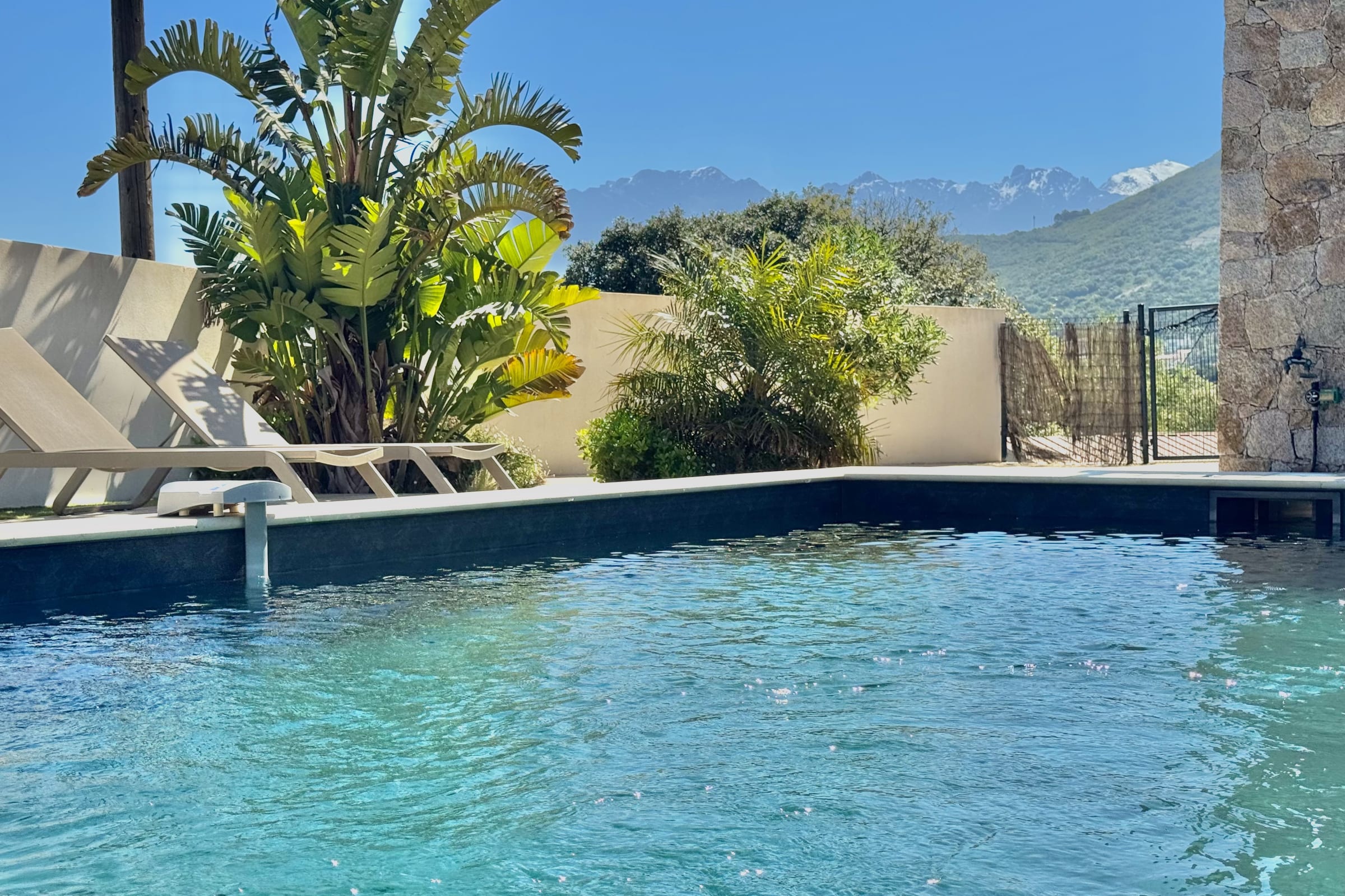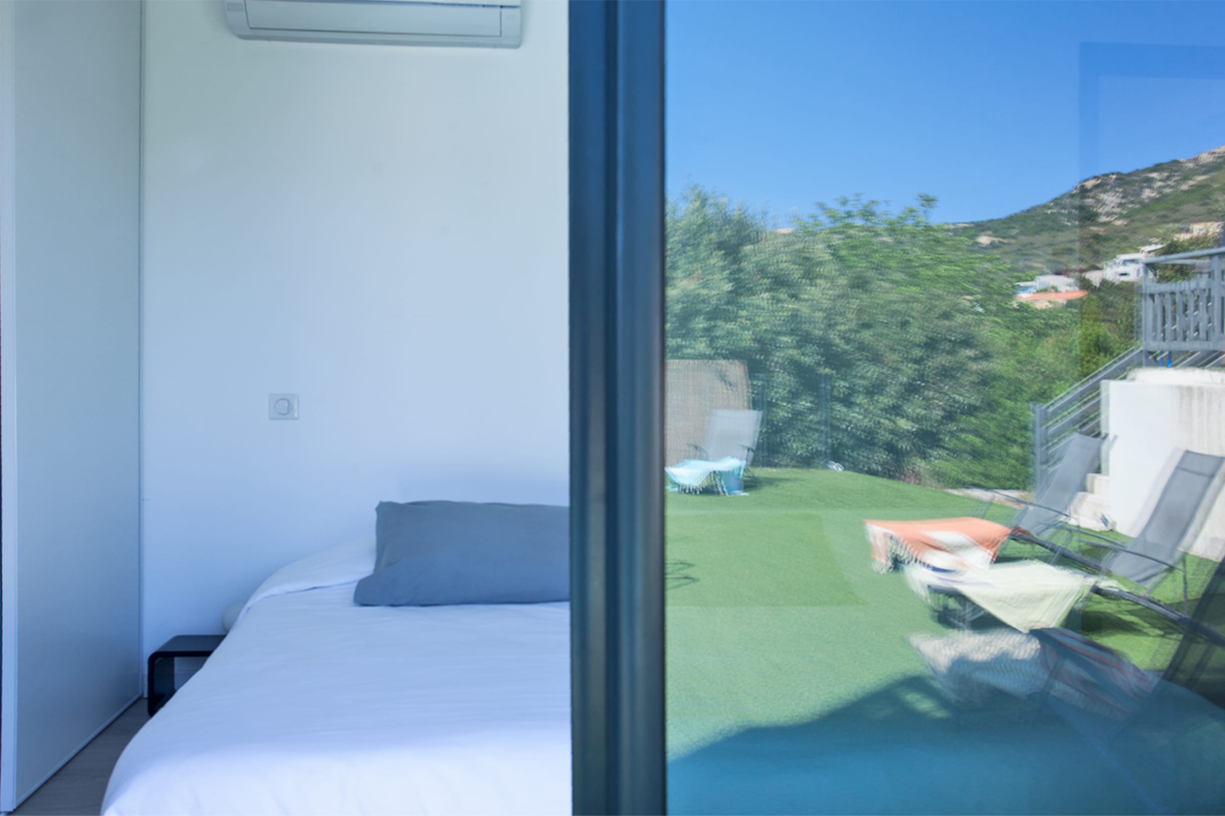 The swimming pool located below the villa is accessible from the living room and the bedrooms.