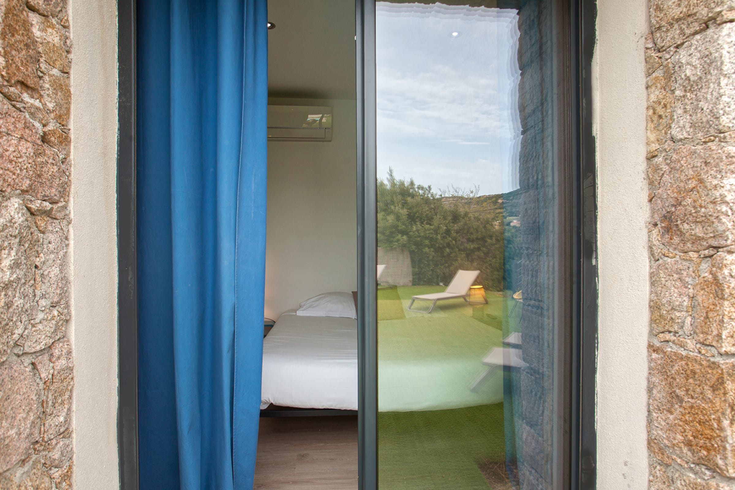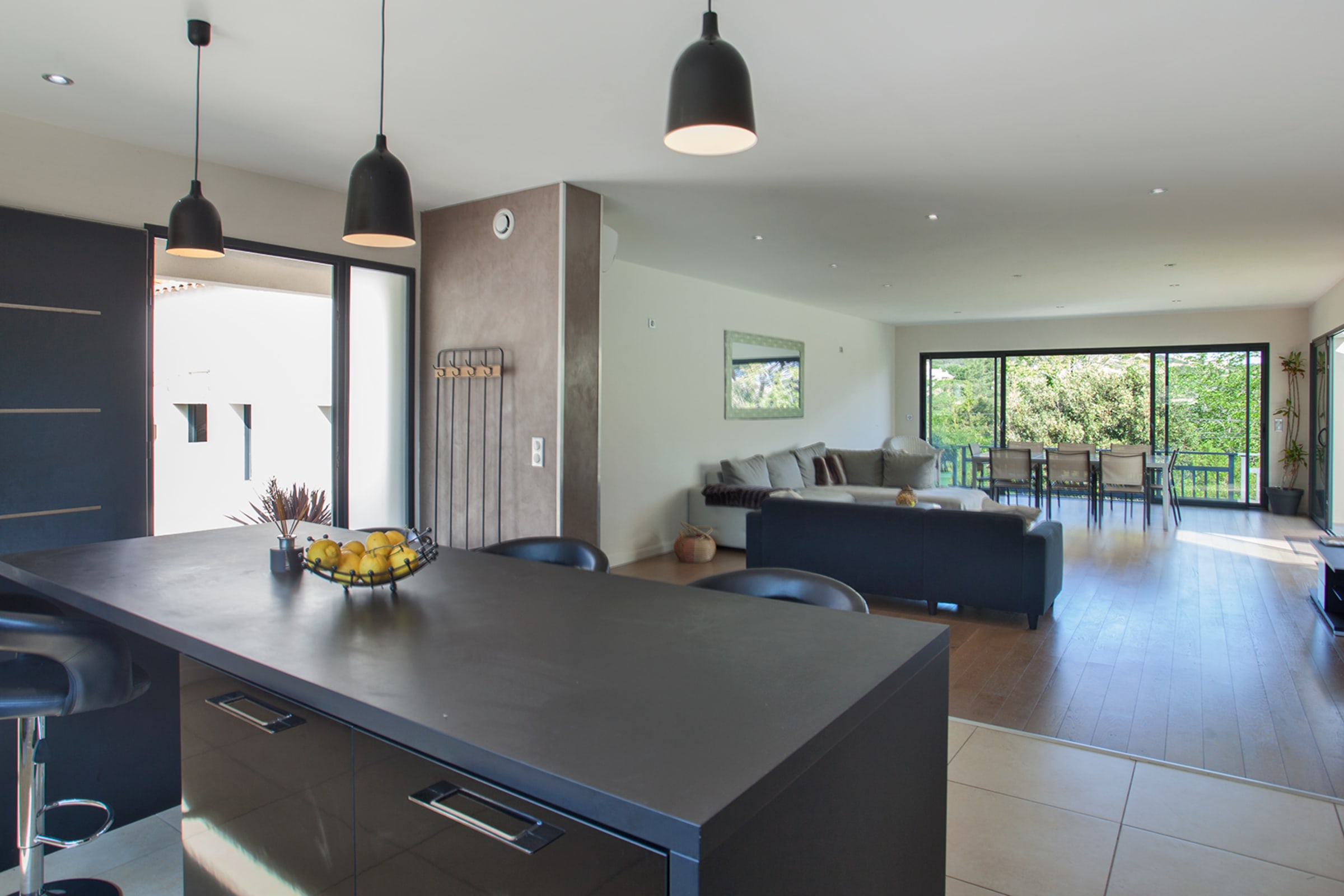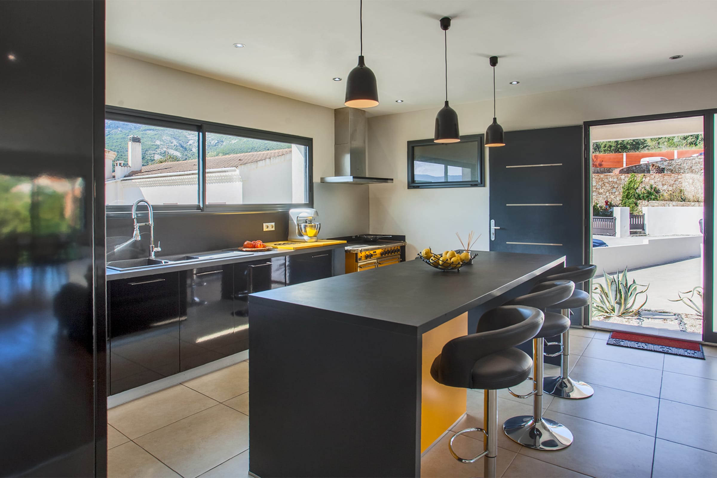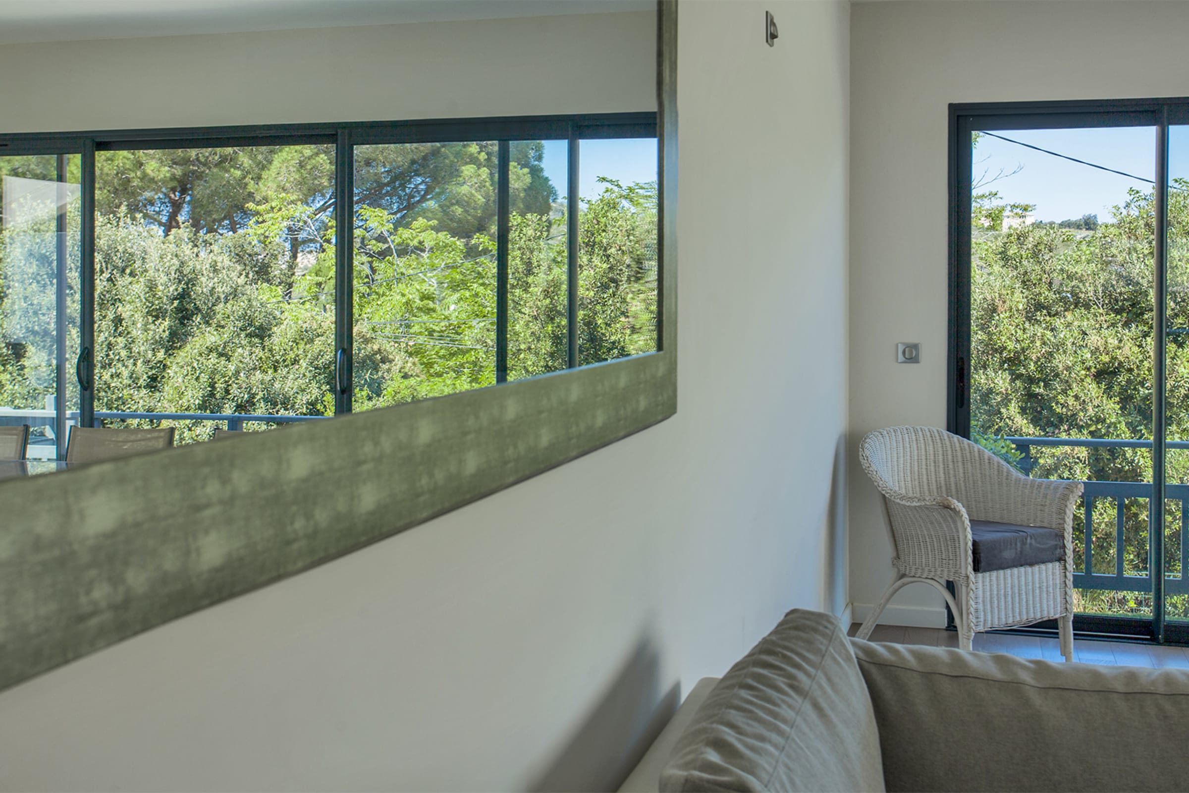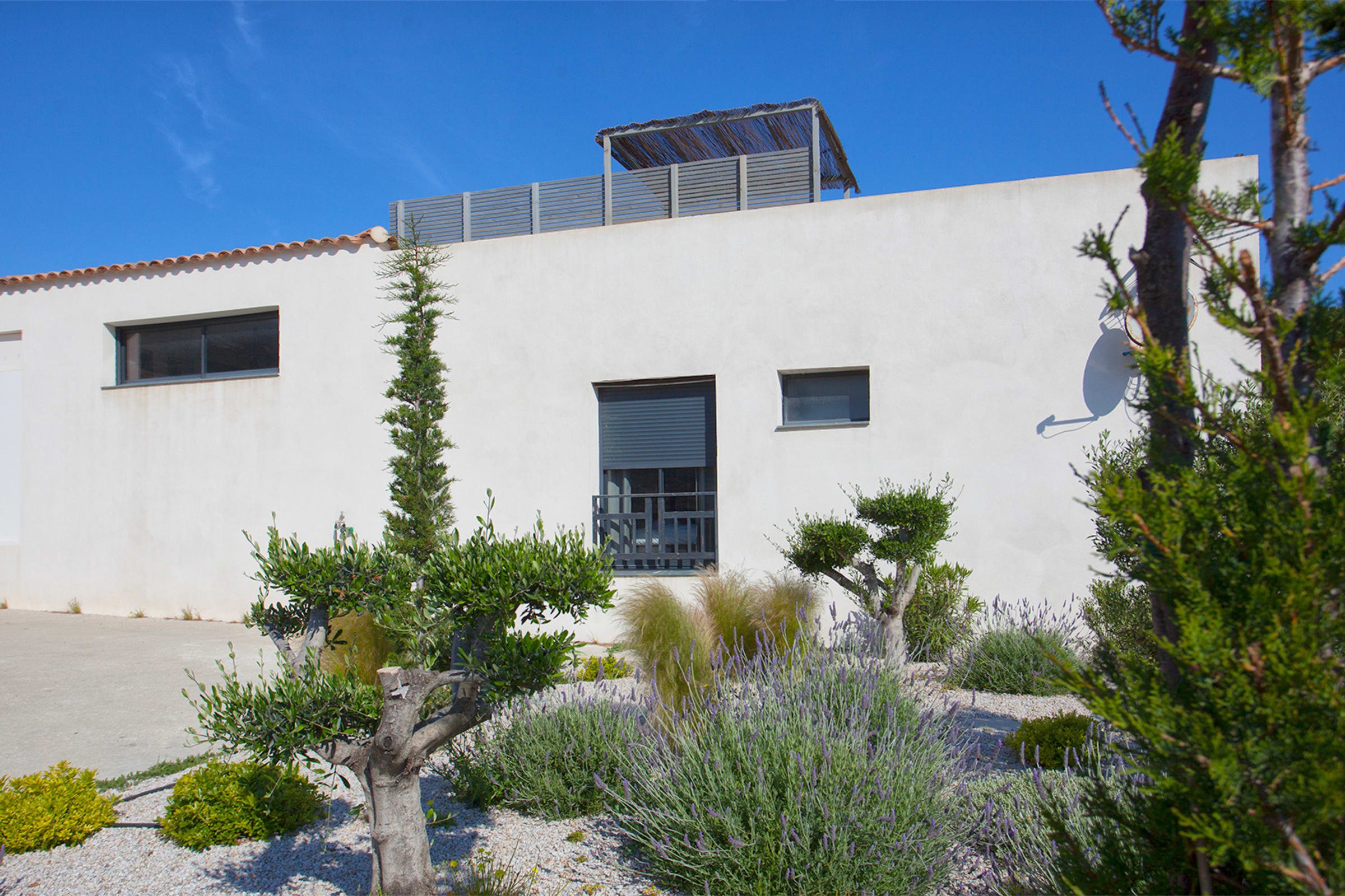 The swimming pool located below the villa is accessible from the living room and the bedrooms.