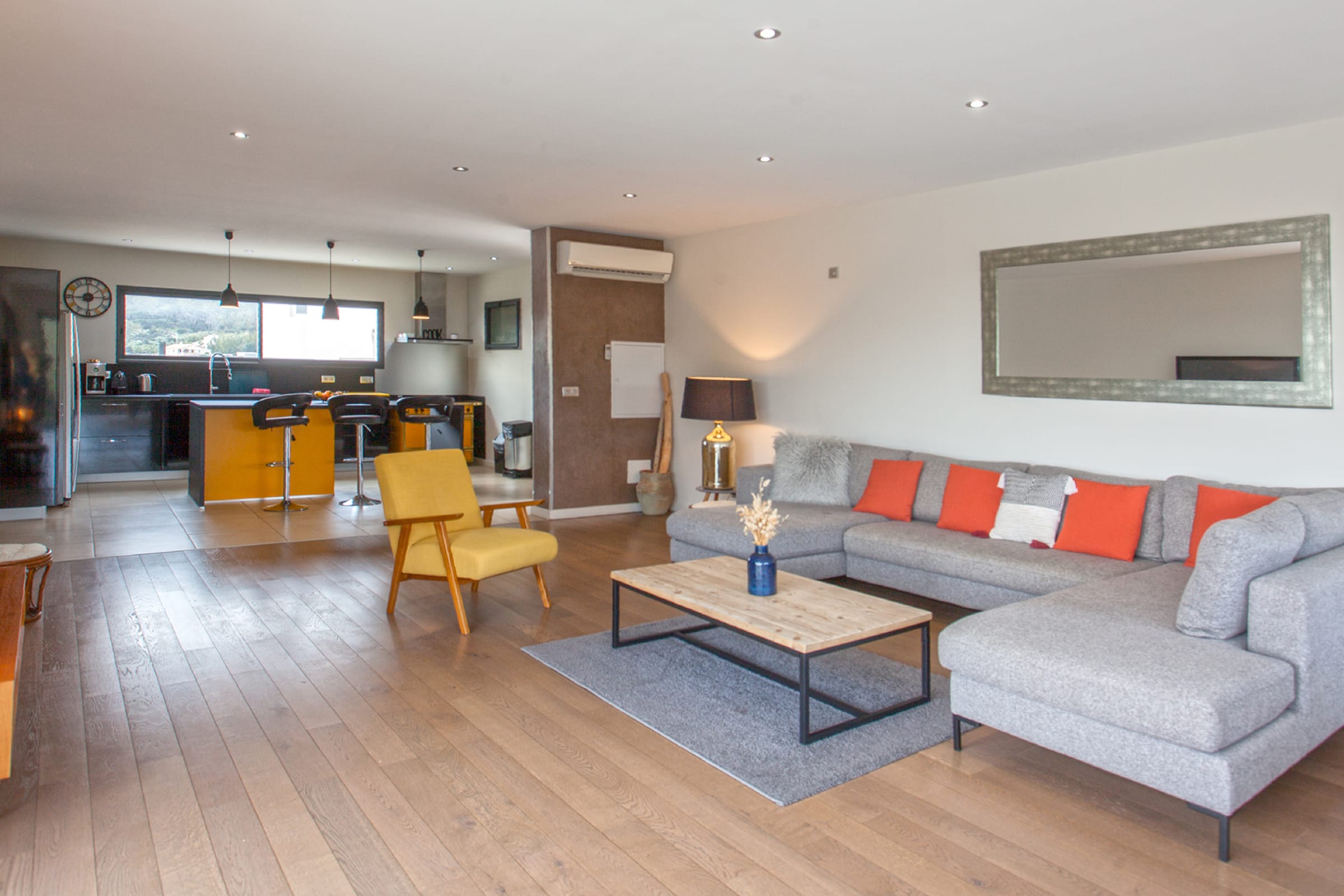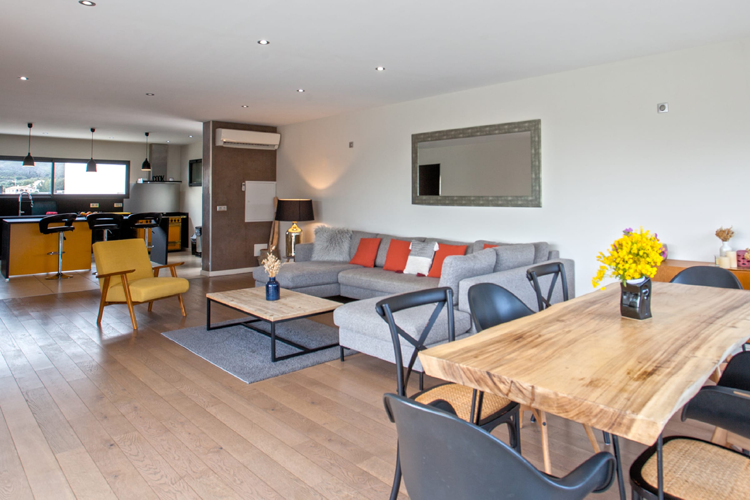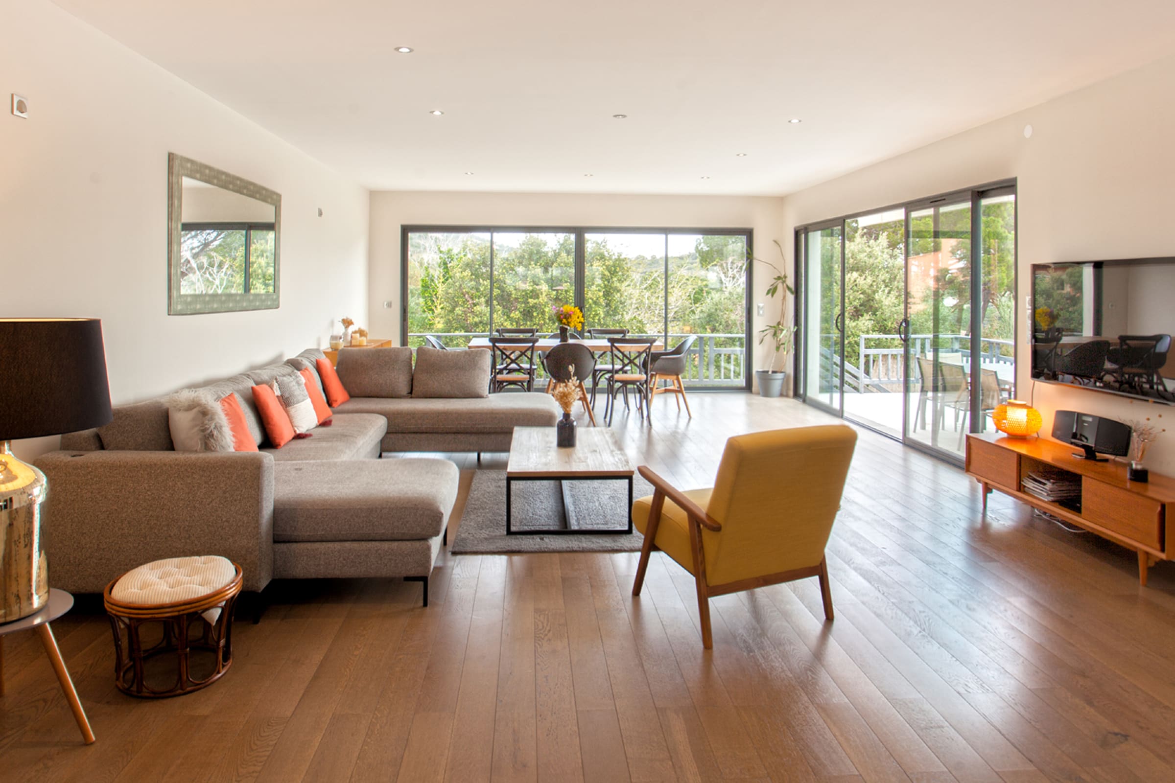 A large living room with terrace overlooking the swimming pool and the garden (500 m²), access to the roof terrace. (in total 100 m² terrace)