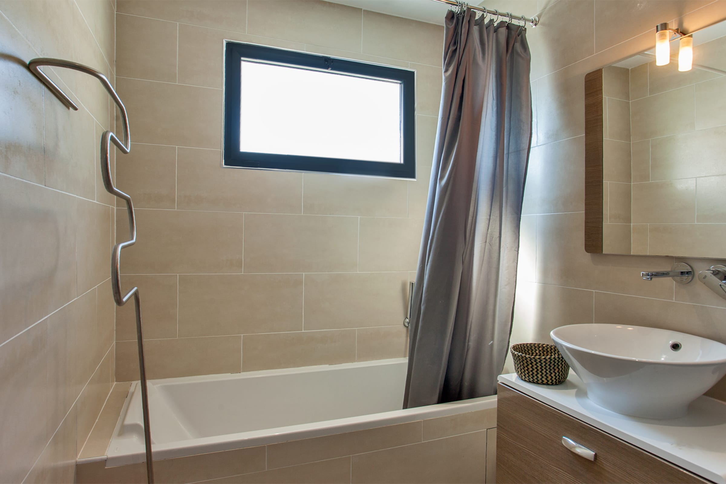 1 bedroom with double bed (160 cm). 1 bathroom with bathtub and WC.