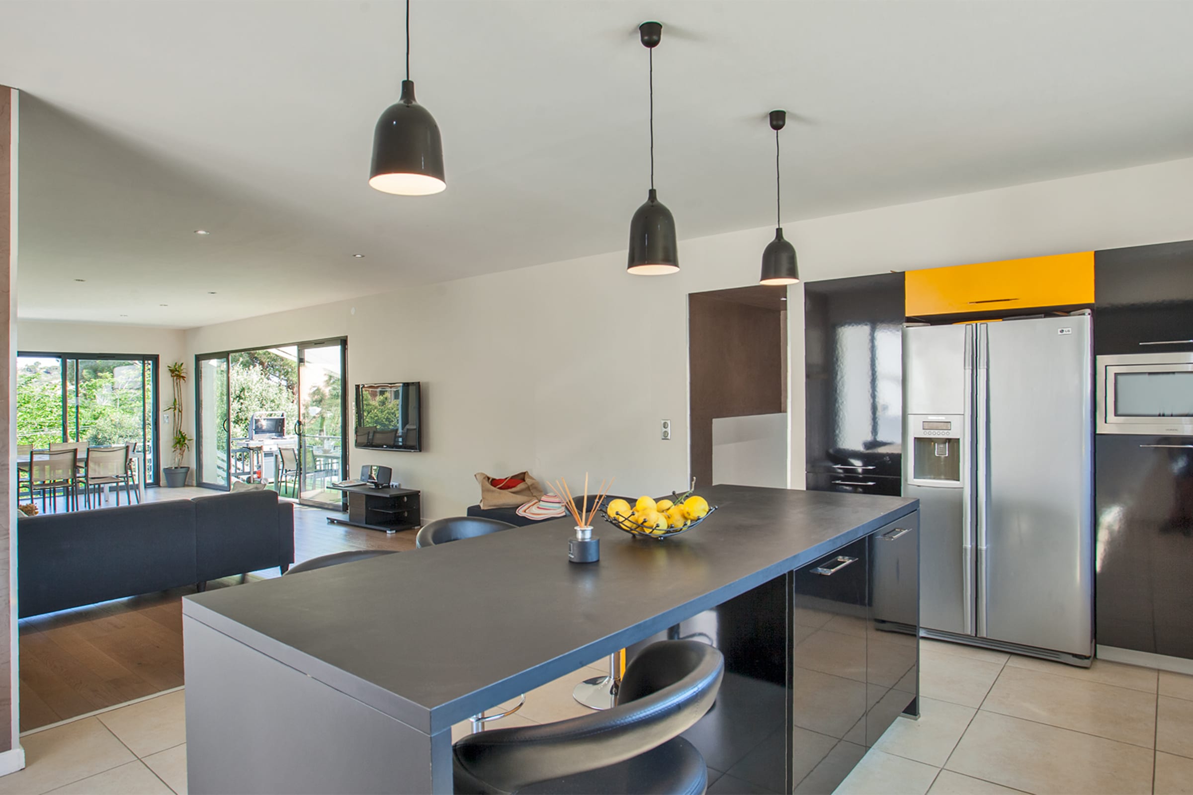 A large fully equipped kitchen, with American fridge, dishwasher, microwave oven, electric cooking piano, coffee machine, toaster, kettle ...