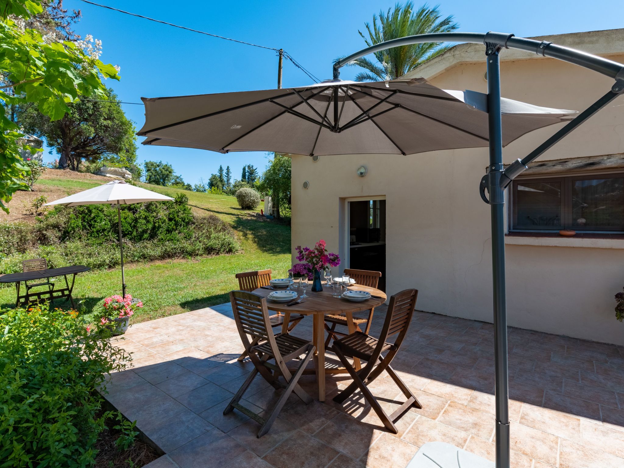Outside, the house is surrounded by a private garden overlooking pine trees and a field of grapefruits, with a lovely terrace equipped with an awning, an outdoor table, sun loungers and a barbecue for relaxing in the open air. The panorama from the terrace is simply superb, offering breathtaking views of the maquis, plantations and surrounding mountains. What's more, personal parking and a charging station for electric cars are at your disposal, ensuring a convenient and stress-free stay.