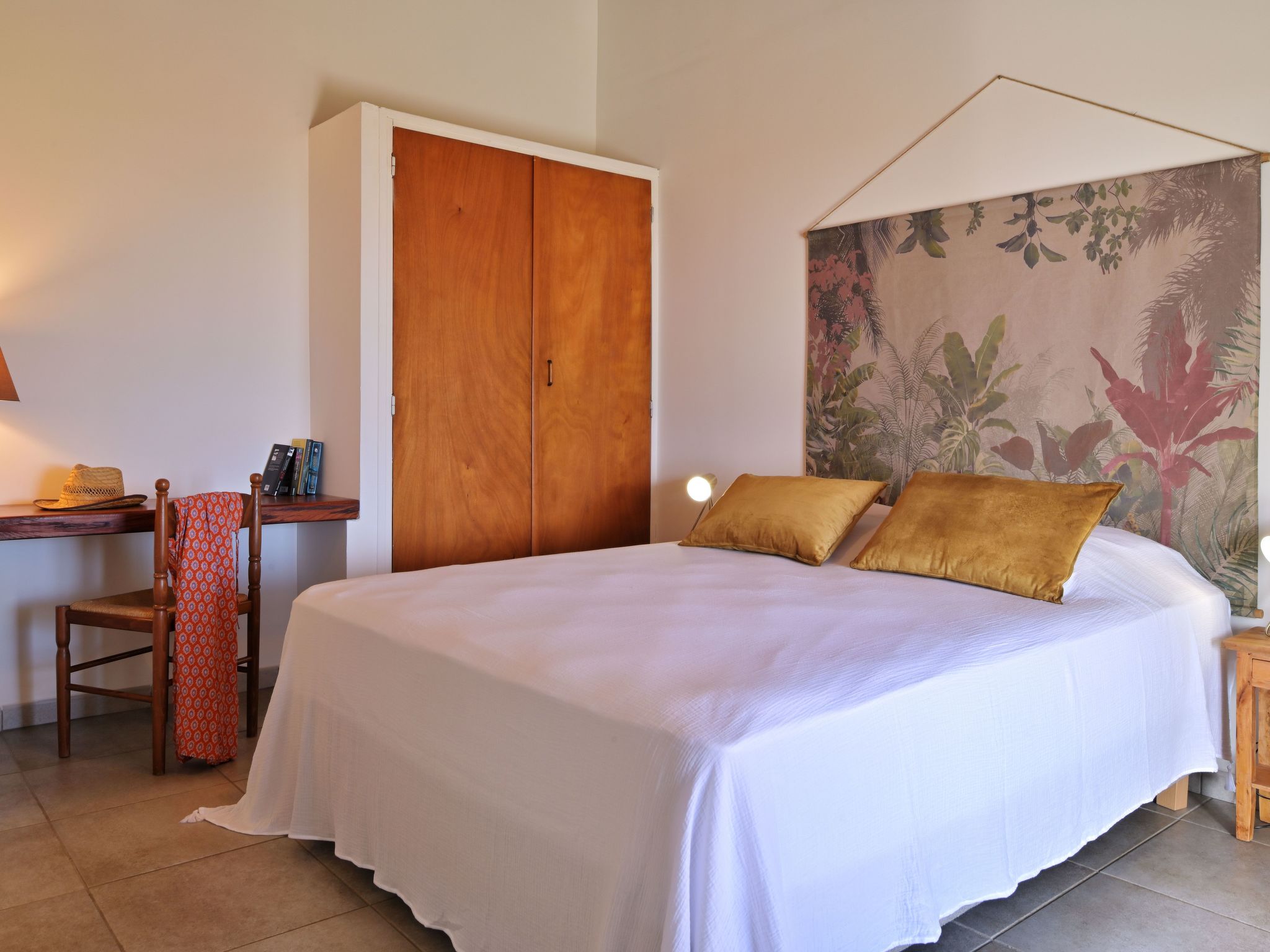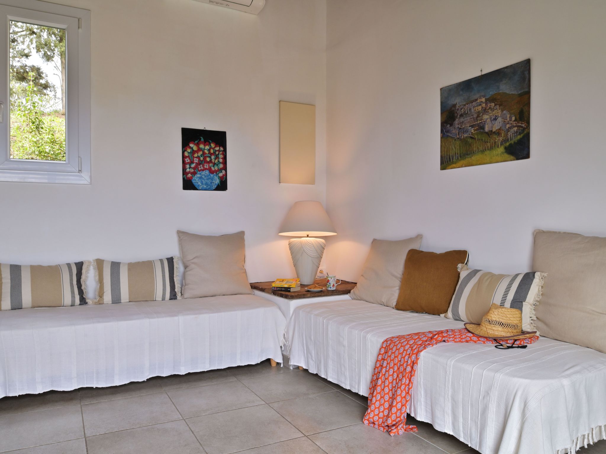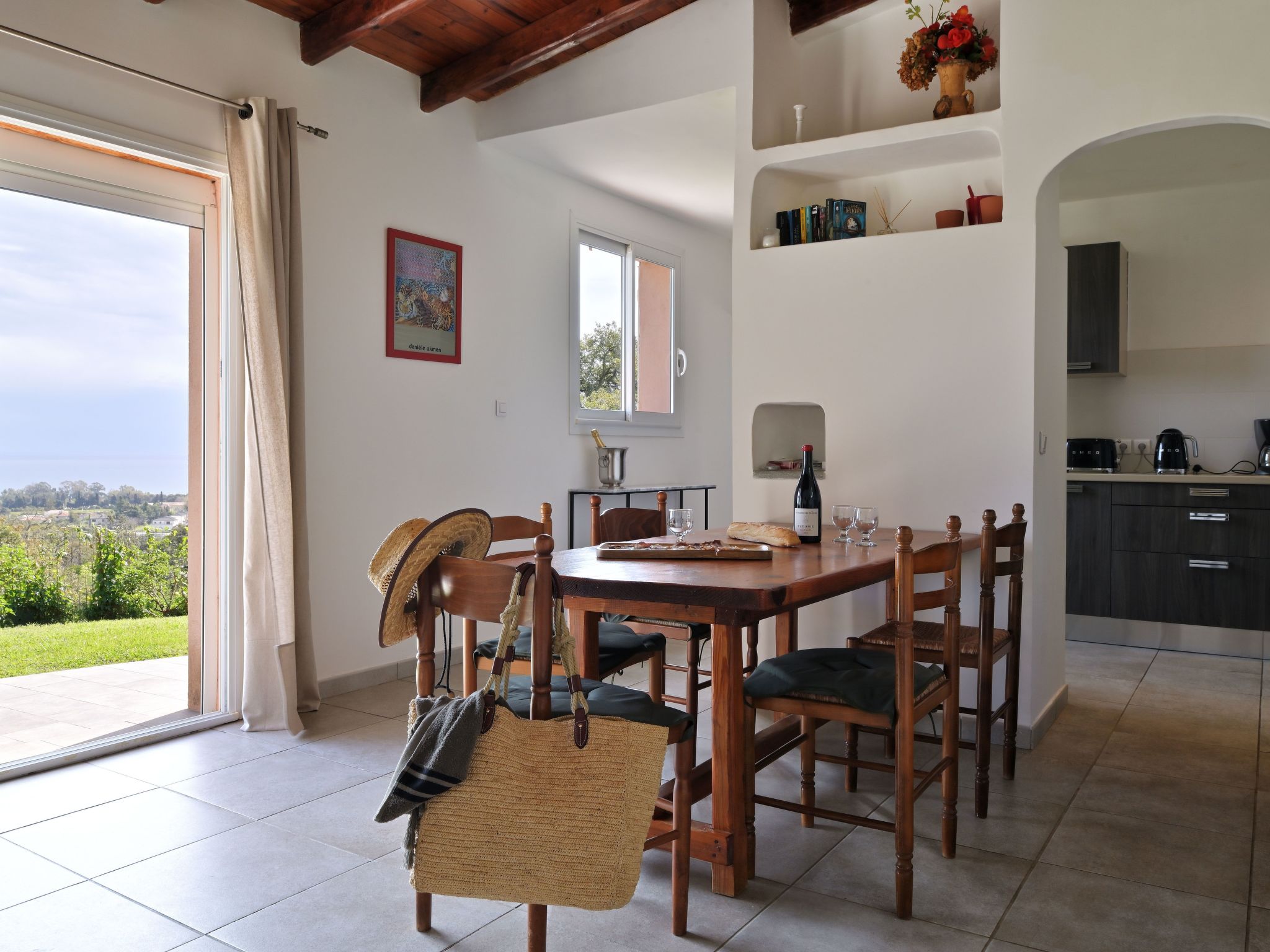 Inside the accommodation: Maison Claire, 69 M2 with a beautiful sea view, a belvedere, comfortable and pleasant furnishings. 3 rooms: Living room with dining area with dining table, satellite TV, sofa bed and exit to terrace. One bedroom with double bed (160cm) (French window leading out onto terrace), shower room, washing machine, WC. One bedroom with 2 single beds (90cm), shower room and WC, storage cupboard. Fitted kitchen with oven, 4-burner hob, microwave, fridge, dishwasher, toaster, electric and Nespresso coffee machine, kettle. Electric heating and air conditioning. Partially covered terrace with garden, outdoor furniture (table and chairs), sun loungers, barbecue, drying rack. Extras: cot, smoke detector, pets welcome (2 maximum). Non-smoking accommodation.