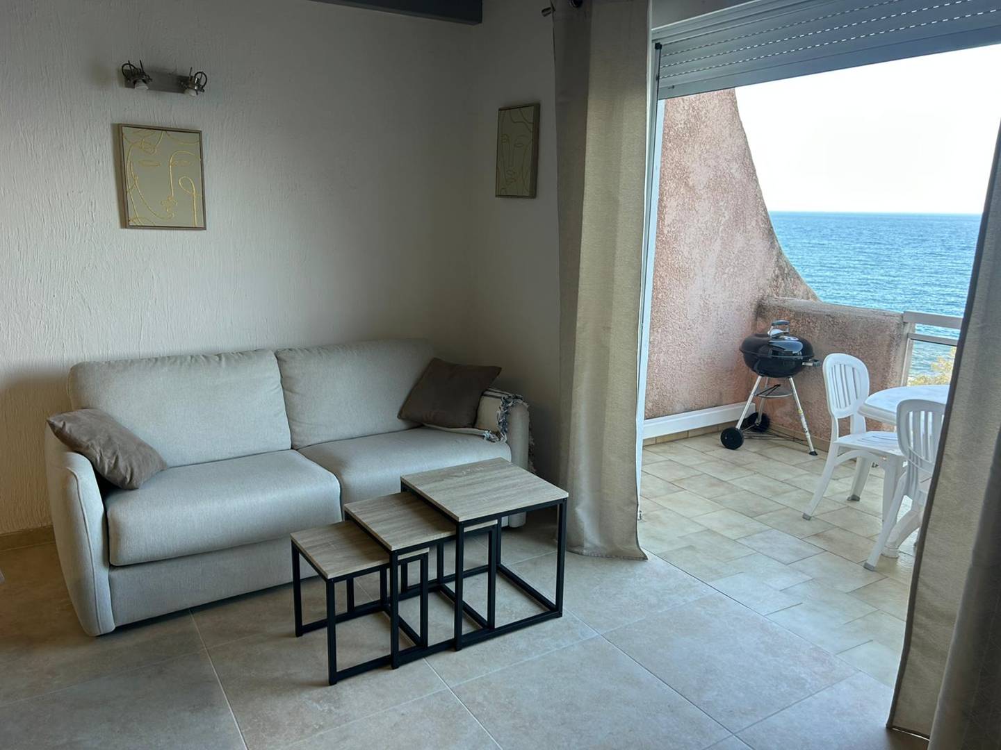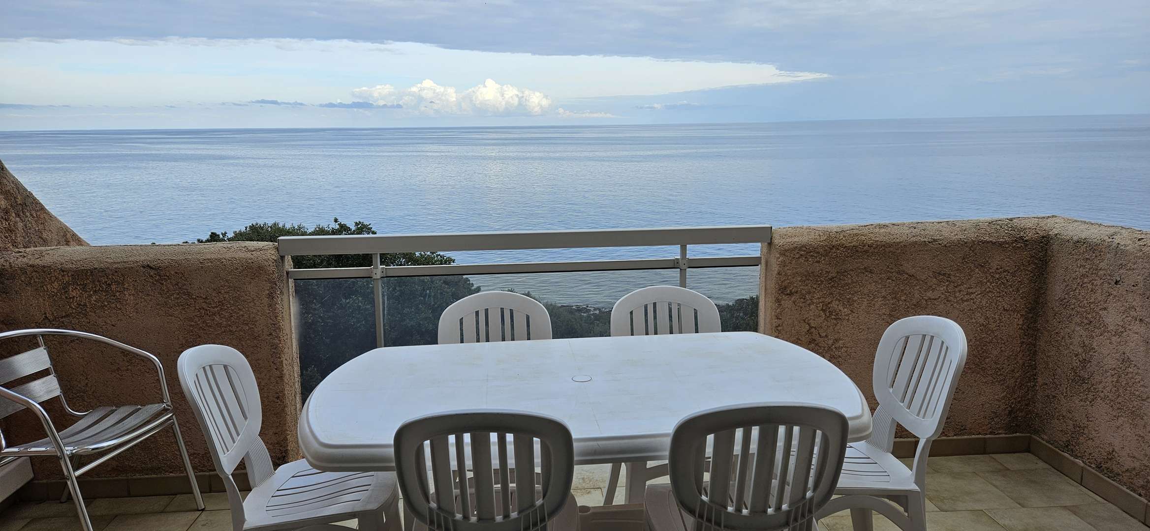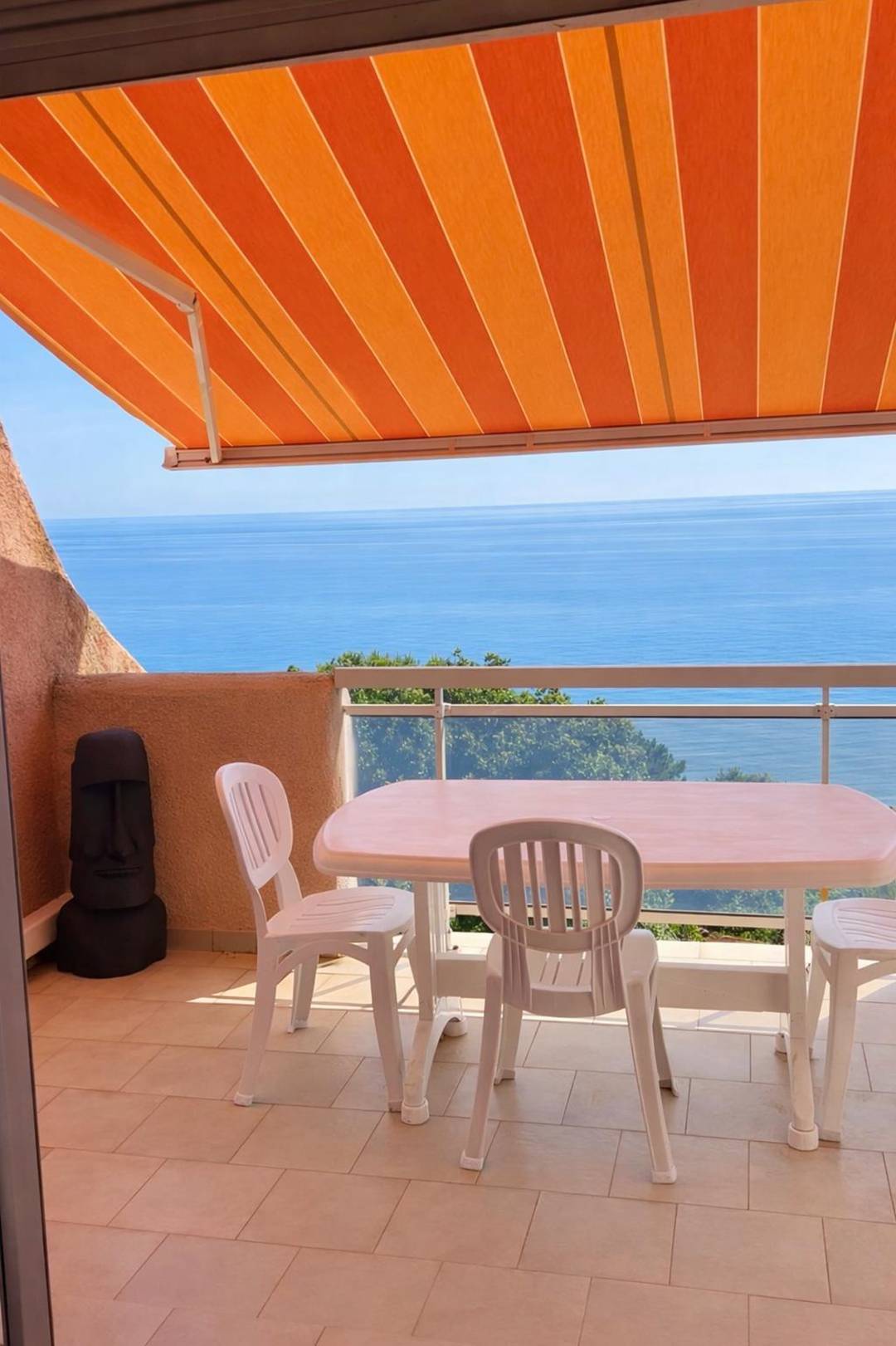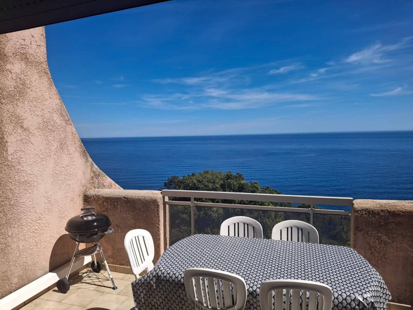 Terrace facing the sea: garden furniture, awning and barbecue.