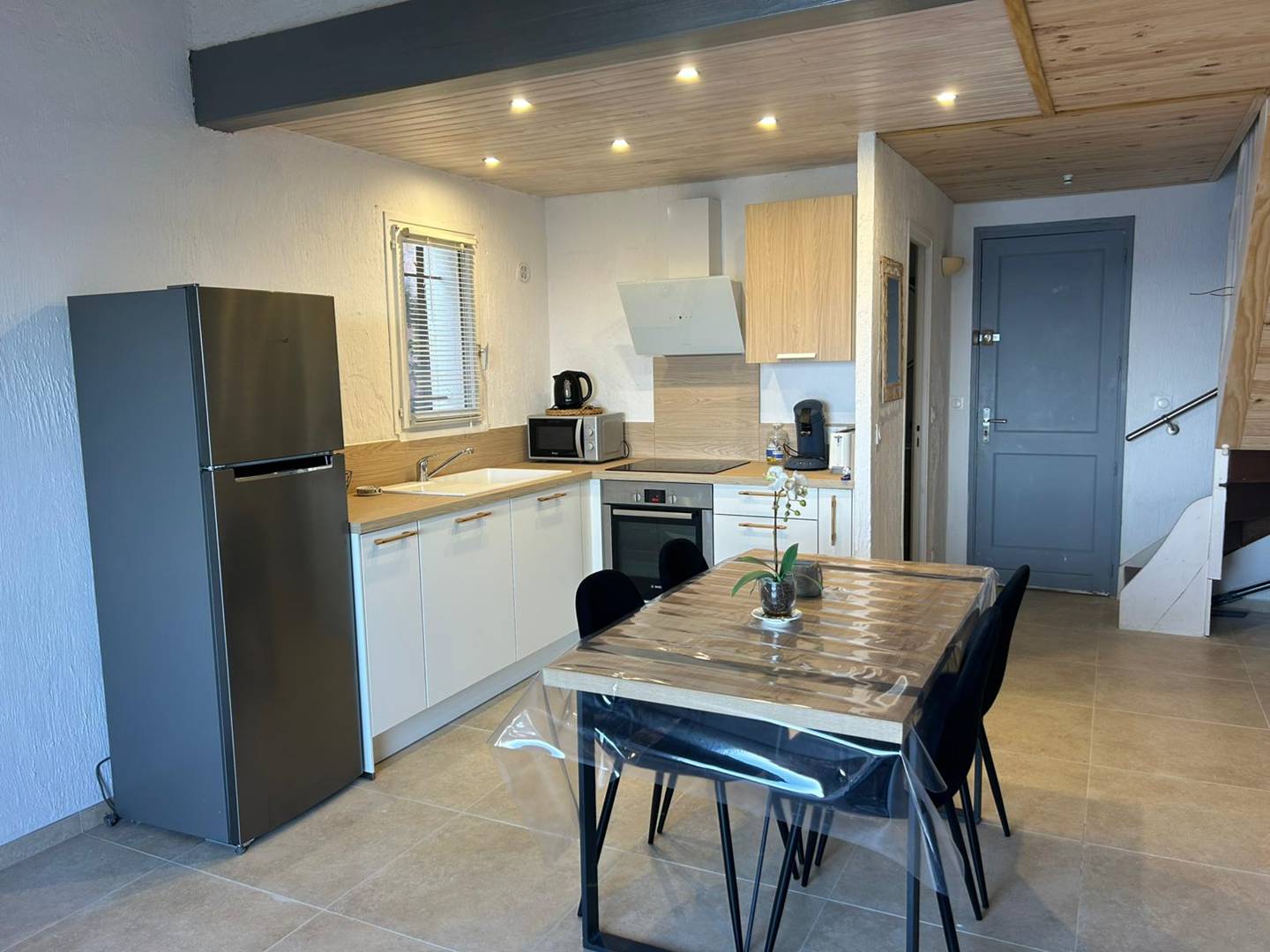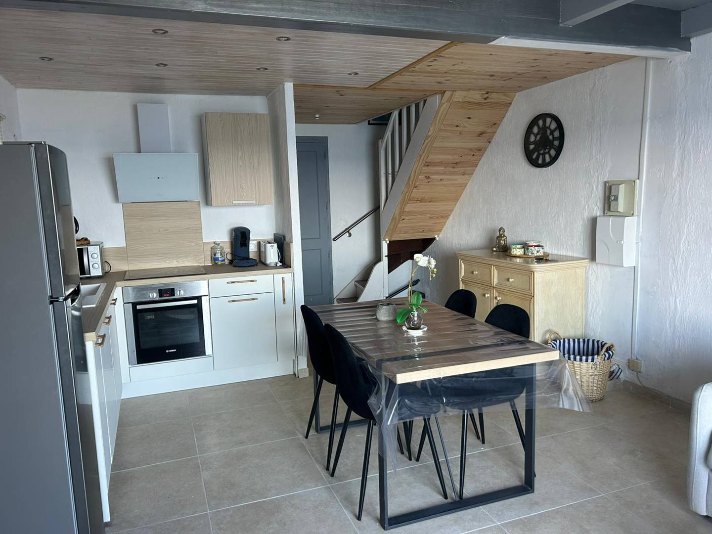 ceramic hob, extractor hood, electric oven, microwave oven, fridge-freezer combo, dishwasher, storage space, Nespresso coffee maker, kettle, toaster, juicer...