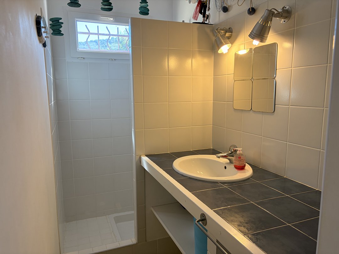 - Entrance hall leading to living room: sofa bed, TV (TNT), fully equipped open-plan kitchen: fridge-freezer, 2-ring electric hob, electric oven, dishwasher, filter coffee machine, microwave, toaster, etc.