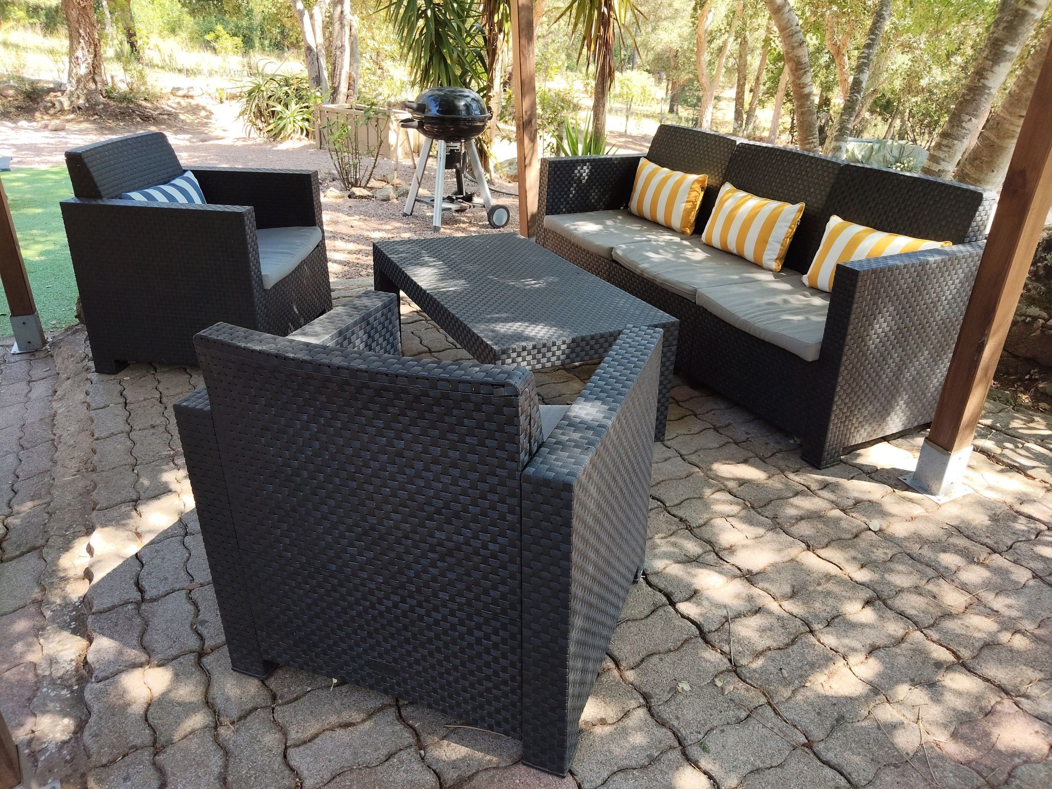 Terrace with tables, chairs, deckchairs, barbecue, hammock.