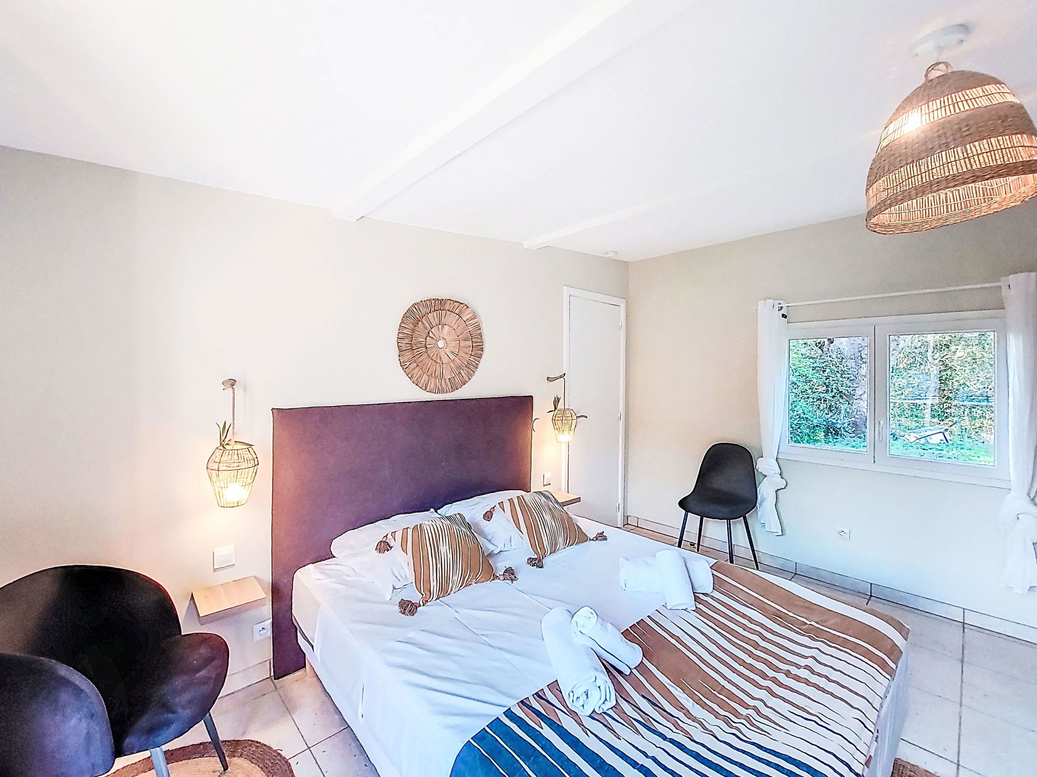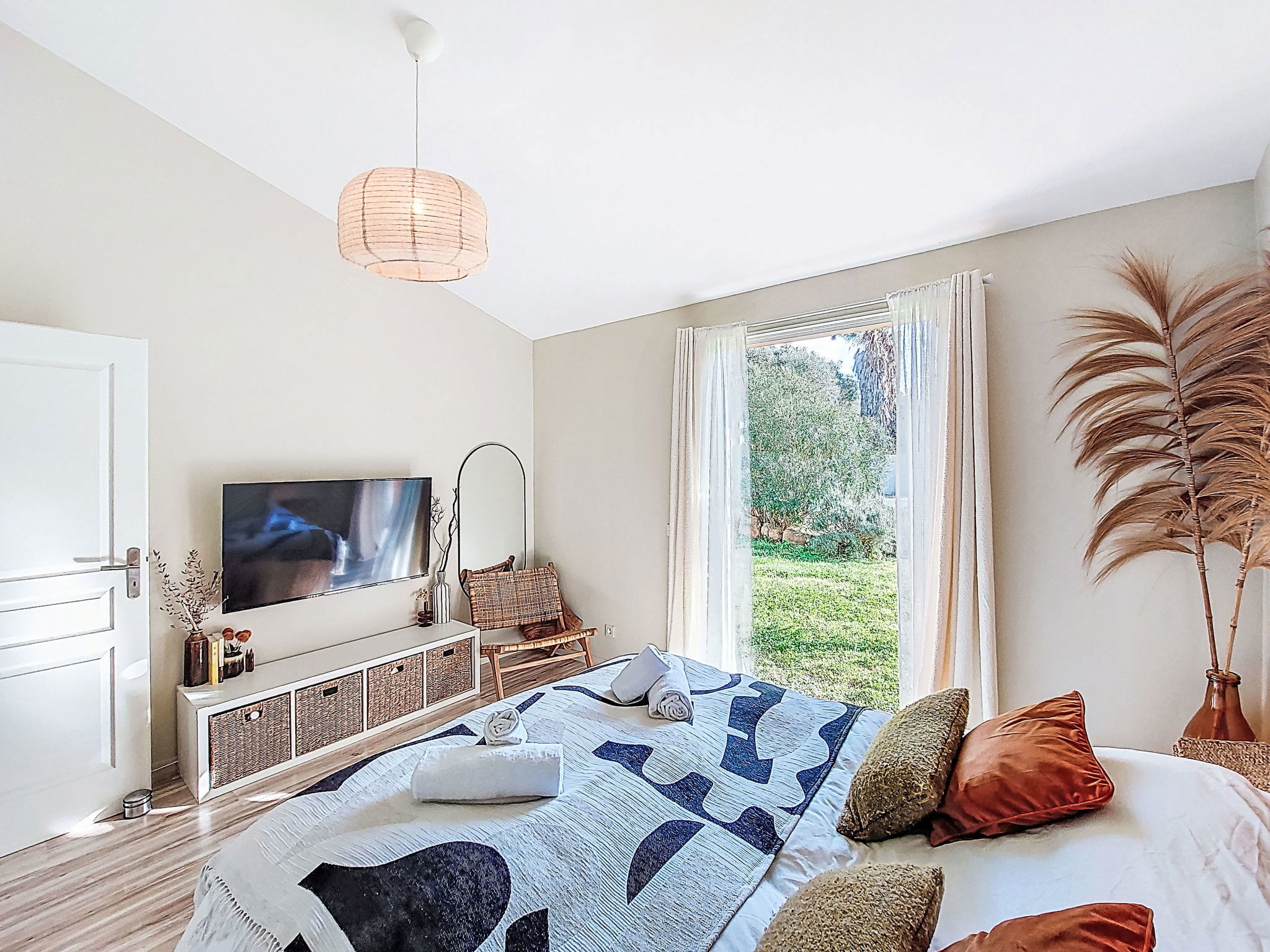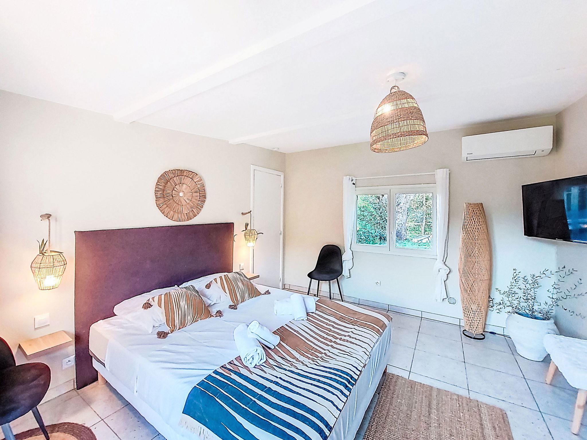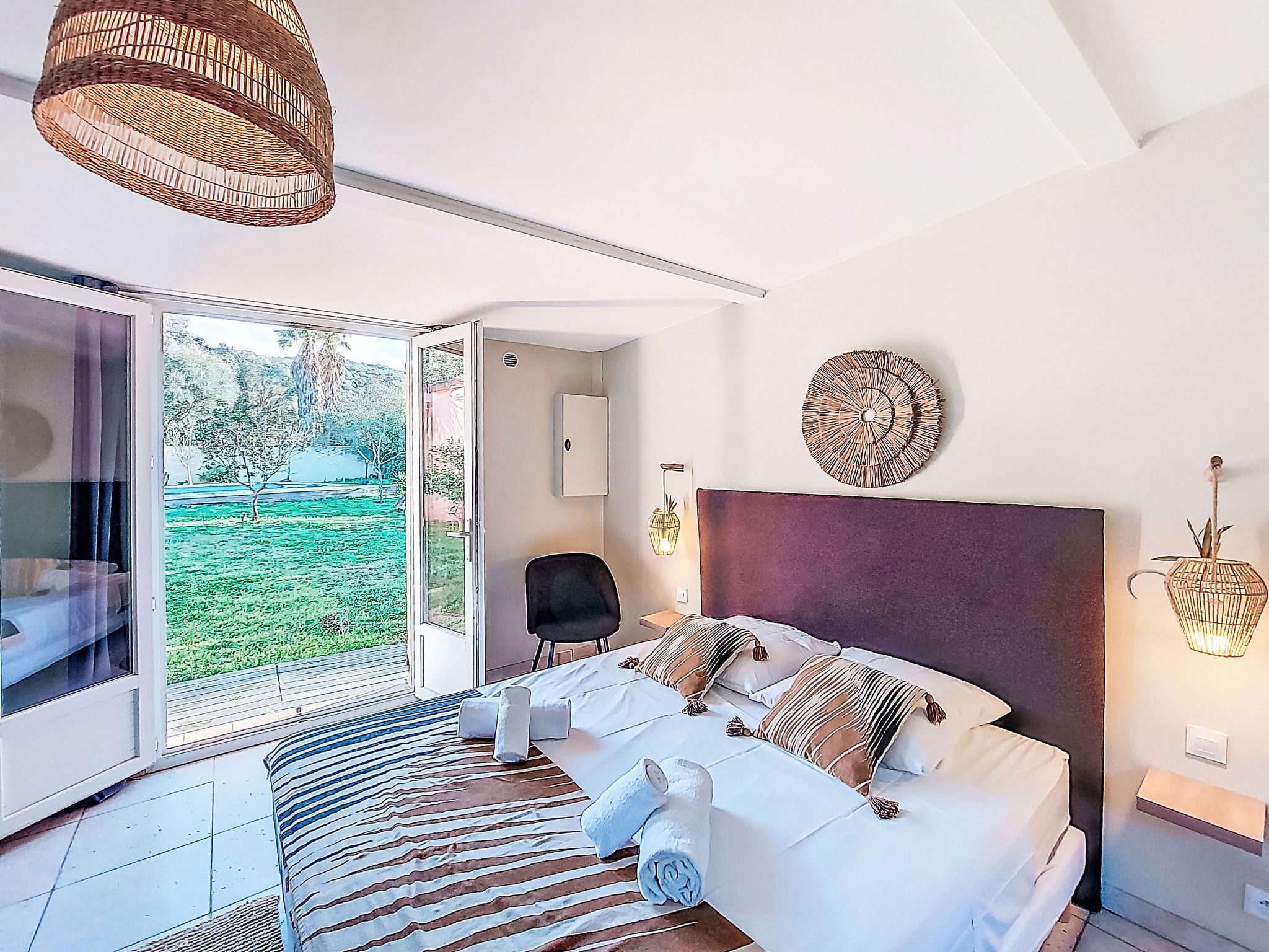 "Tarabucetta", 5-room villa 160 m2. Large living/dining room 50 m2 with open-hearth fireplace (only for decoration), dining table and TV (flat screen). Exit to the terrace. 1 room with 1 french bed (160 cm, length 200 cm). Exit to the garden. 1 room with 2 beds (80 cm, length 200 cm), TV (flat screen). Exit to the garden. 1 room with 1 french bed (160 cm, length 200 cm), TV (flat screen). Exit to the terrace. Studio with 1 french bed (160 cm, length 200 cm), shower/WC and TV (flat screen). Exit to the garden. Open kitchen (oven, dishwasher, 3 induction hot plates, toaster, kettle, microwave, freezer, electric coffee machine, Capsules for coffee machine (Nespresso) extra). Shower/WC, sep. WC, double hand-basin. Electric heating, air-conditioning. 2 large terraces. Terrace furniture, barbecue, deck chairs. Facilities: washing machine, iron, baby cot for up to 2 year olds, hair dryer. Internet (WiFi). Please note: non-smoking house. Maximum 1 pet/ dog allowed. Smoke alarm. No internal connecting door between the separated properties. Offer by a private individual according to Art. 155, IV of CGI.