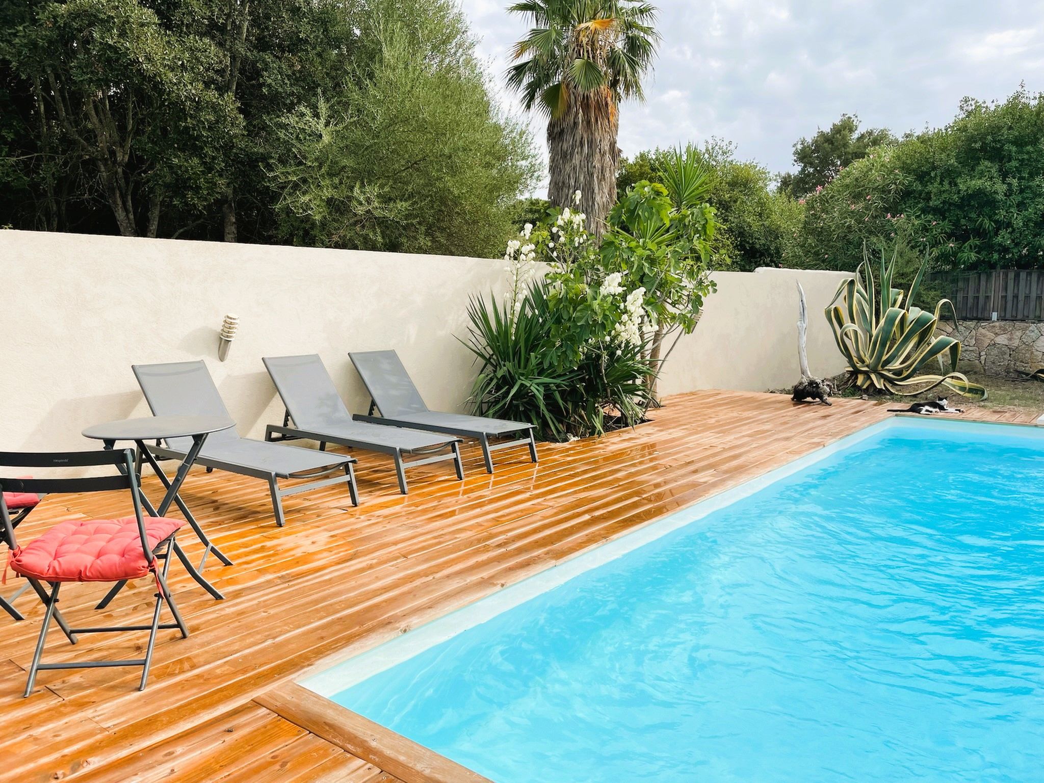 Tarabucetta: Villa "Tarabucetta", renovated in 2023. In the hamlet Tarabucetta, 12 km from the sea, 12 km from the beach. Private: large, well-kept garden (fenced), swimming pool angular, with privacy (8 x 4 m, depth 80 - 180 cm, seasonal availability: 01.Apr. - 15.Oct.) with alarm system. Parking (for 3 cars). Grocery 6.5 km, restaurant 450 m, bus stop "Prunu-Tarabucetta" 2 km, sandy beach "Plage de Figari" 12 km. Sports harbour 14 km, golf course (9 hole) 15 km. Nearby attractions: Plage de Figari 12 km, Plage de Santa Giulia 17 km, Plage de Palombaggia 22 km, Port plaisance Pianotolli 14 km, Port plaisance Porto-Vecchio 17 km. Well-known lakes can easily be reached: Lac de l'Ospedale 38 km. Hiking paths: Les Aiguilles de Bavella 54 km. Please note: car recommended.