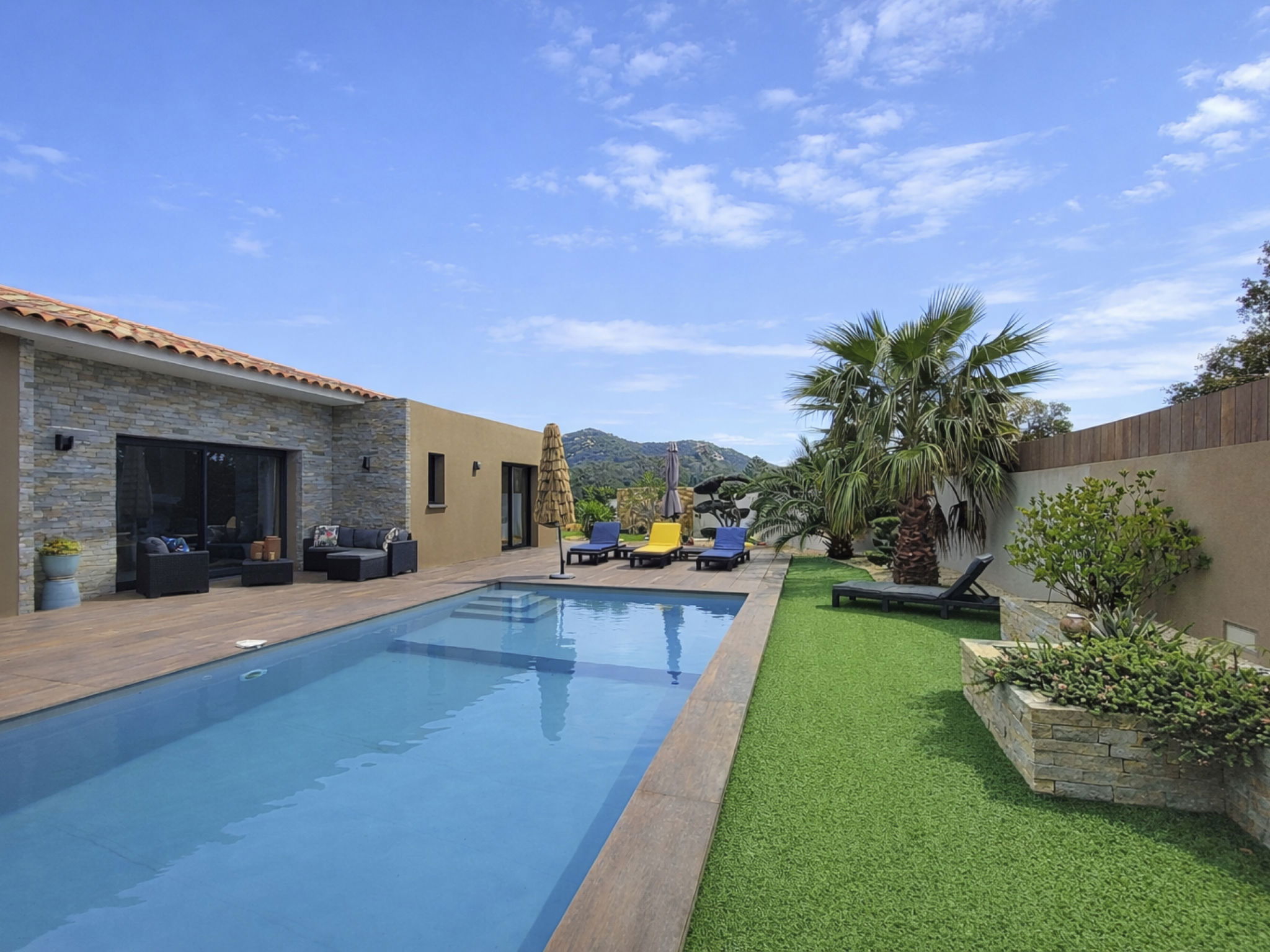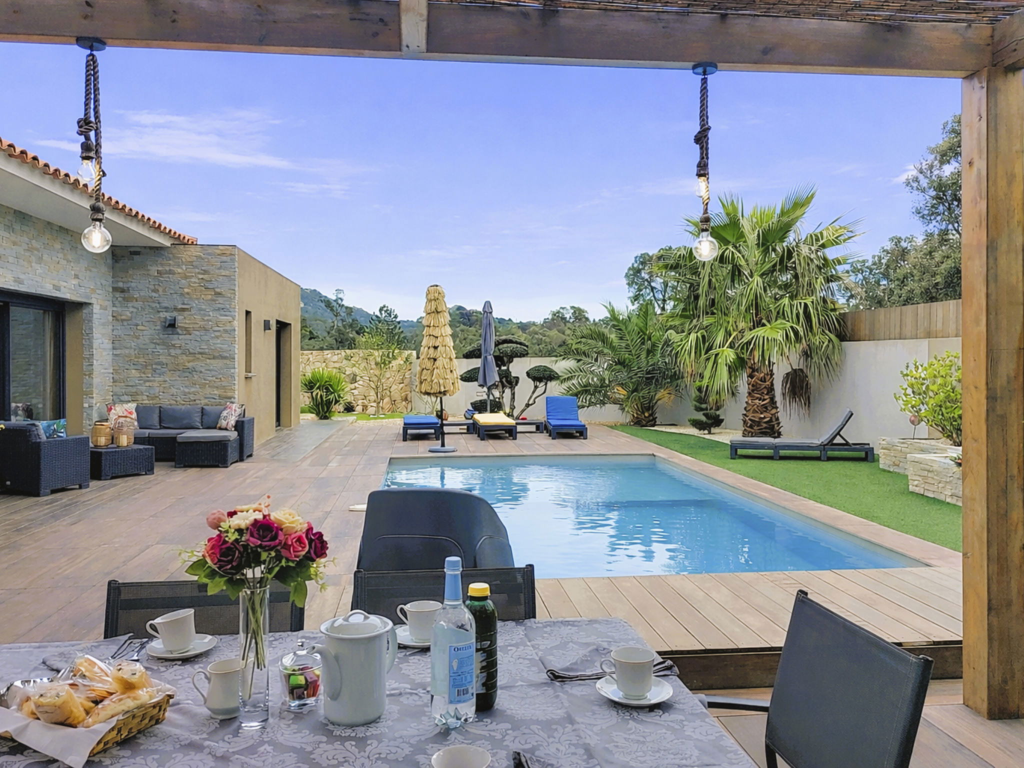 Single-family house. On the outskirts, 1 km from the centre of Lecci, in the residential district, 5 km from the beach, in a cul-de-sac. Private: property 800 m2 (fenced), well-kept garden, swimming pool angular (7 x 4 m, depth 100 - 200 cm, seasonal availability: 01.Jul. - 15.Sep.) with salt-electrolysis pool-cleaning system. In the house: air conditioning. Grocery 400 m, supermarket 4 km, restaurant 4 km, sandy beach "plage de Saint Cyprien" 5 km. Nearby attractions: Centre ville Porto-Vecchio 10 km, Plage de Santa Giulia 18 km, Plage de Palombaggia 20 km, Bonifacio 36 km. Well-known lakes can easily be reached: Lac de l'Ospédale 24 km. Hiking paths: Aiguilles de Bavella 51 km. Please note: car recommended.