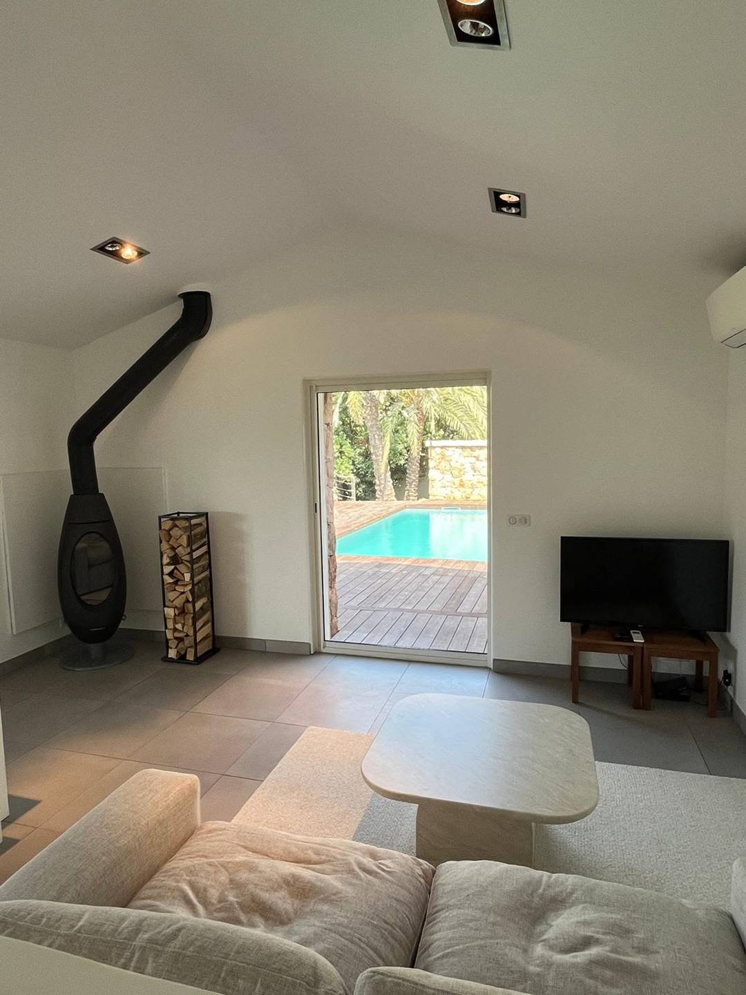 Stay - living room - kitchen: windows - front terrace access to the valley and vineyards - access another terrace and pool - air conditioning (centr / cold): sofa, television (French, TNT), DVD, Hi-Fi ... . refrigerator, hob (ceramic), oven (electric), extractor hood, dishwasher, coffee maker, vacuum cleaner ...., iron and ironing board. Internet connection