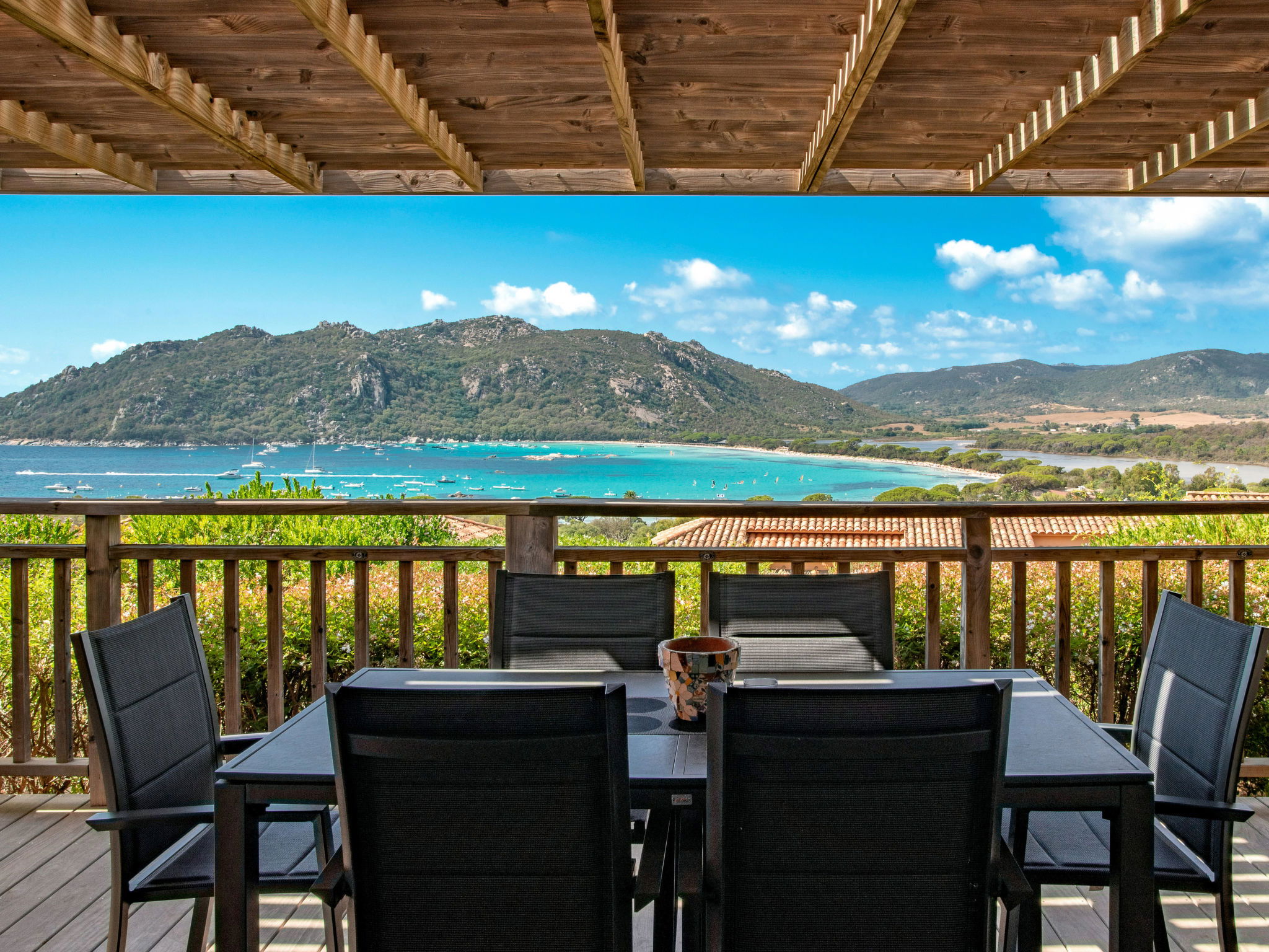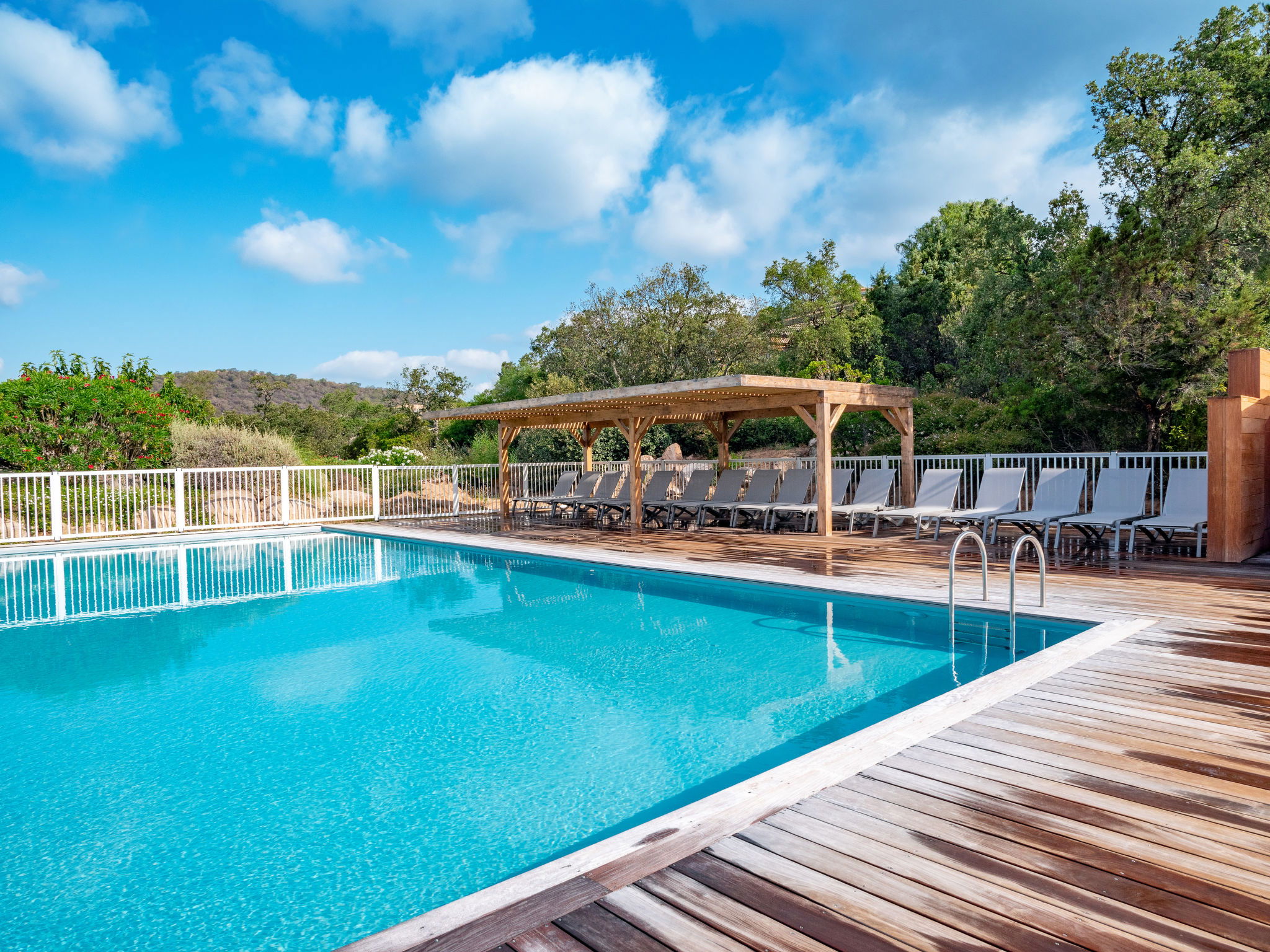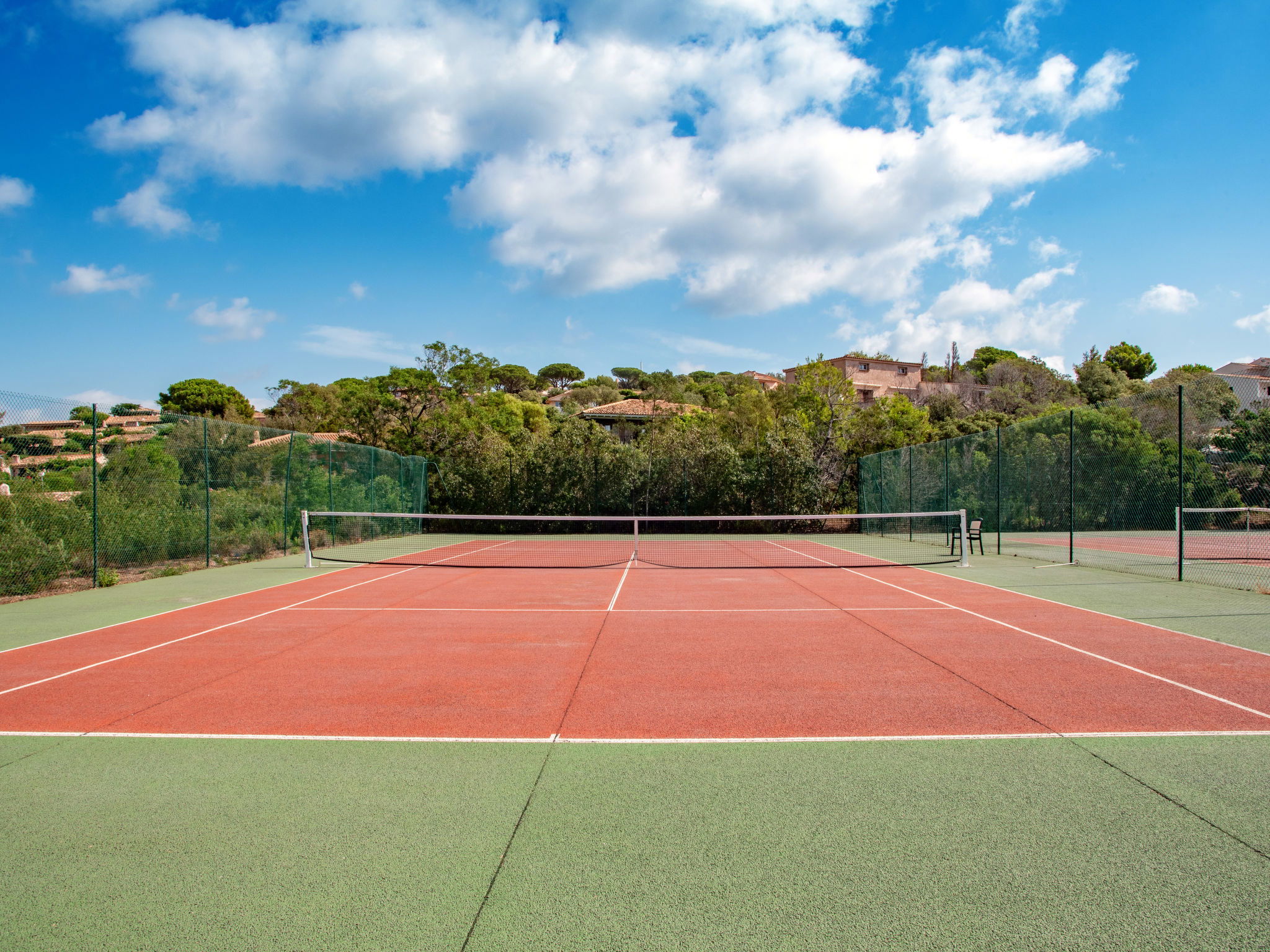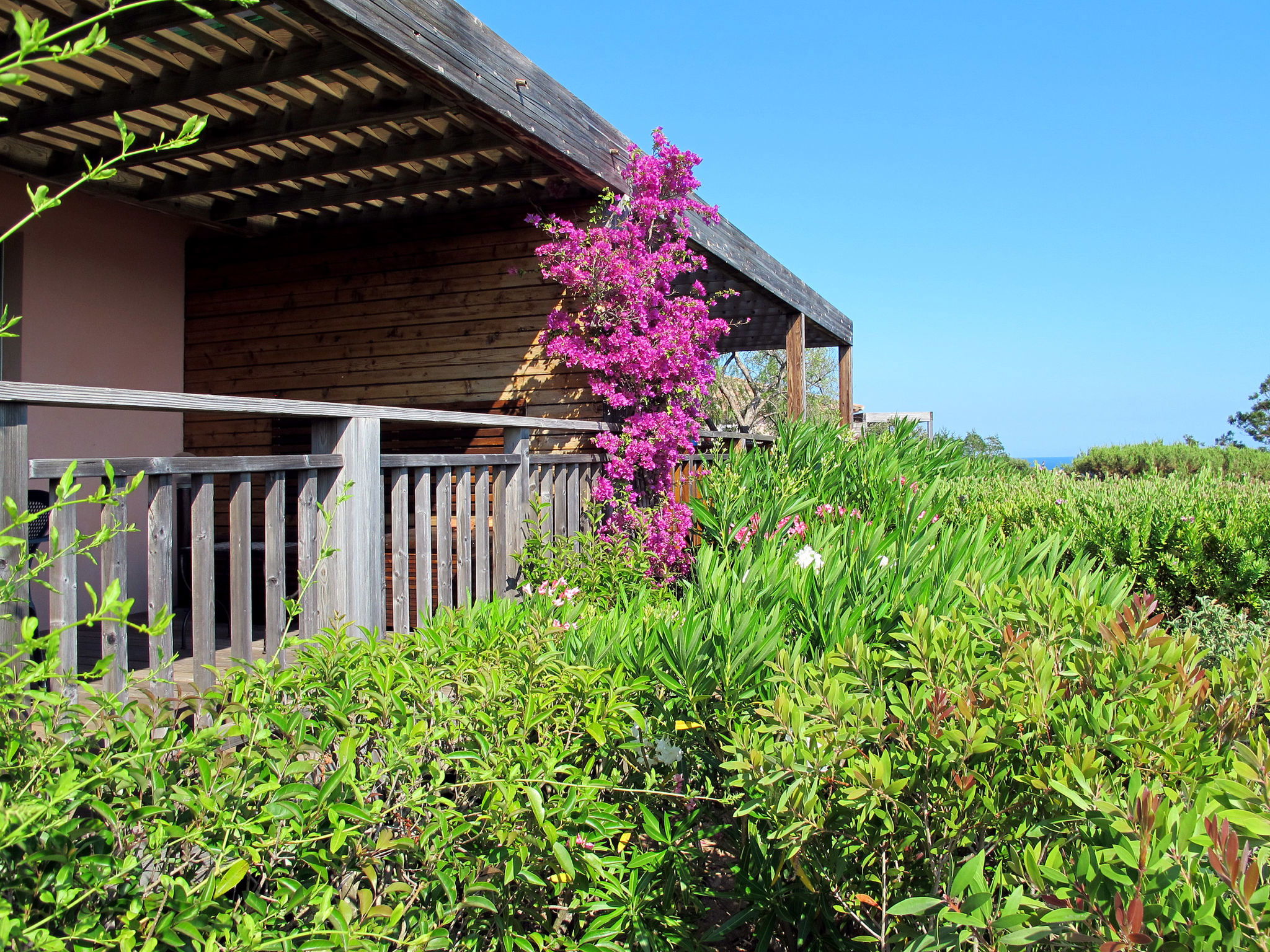 Santa Giulia 8 km from Porto Vecchio: Beautiful, cosy resort "Les Hameaux de Santa Giulia", surrounded by trees. 59 houses in the residence. In the district of Santa Giulia 8 km from the centre of Porto Vecchio, 30 km from the centre of Bonifacio, 143 km from the centre of Bastia, in a sunny, elevated position on a slope, 500 m from the sea, direct access to the beach. For shared use: terraced garden, 4 ha with plants and trees, natural garden, swimming pool heated, fenced (15 x 8 m, seasonal availability: 01.Apr. - 30.Sep.). Outdoor shower, tennis, terrace. In the complex: reception, WiFi. Parking at the house on the premises. Shop 400 m, supermarket 8 km, restaurant, bar 400 m, sandy beach "Santa Giulia" 500 m. Please note: car recommended. Residence with electric gates. There is an annual music festival on Santa Giulia beach at the end of August. Wi-Fi only at the reception.