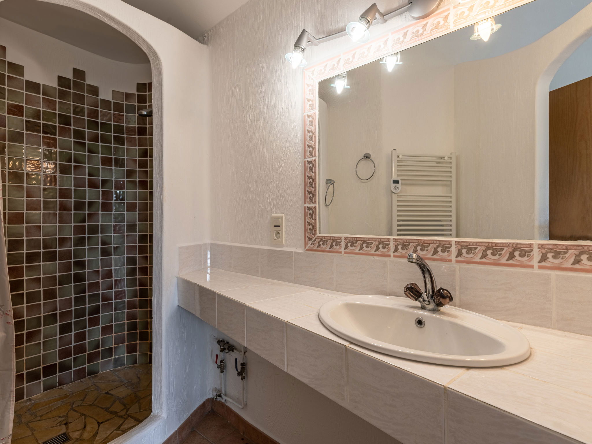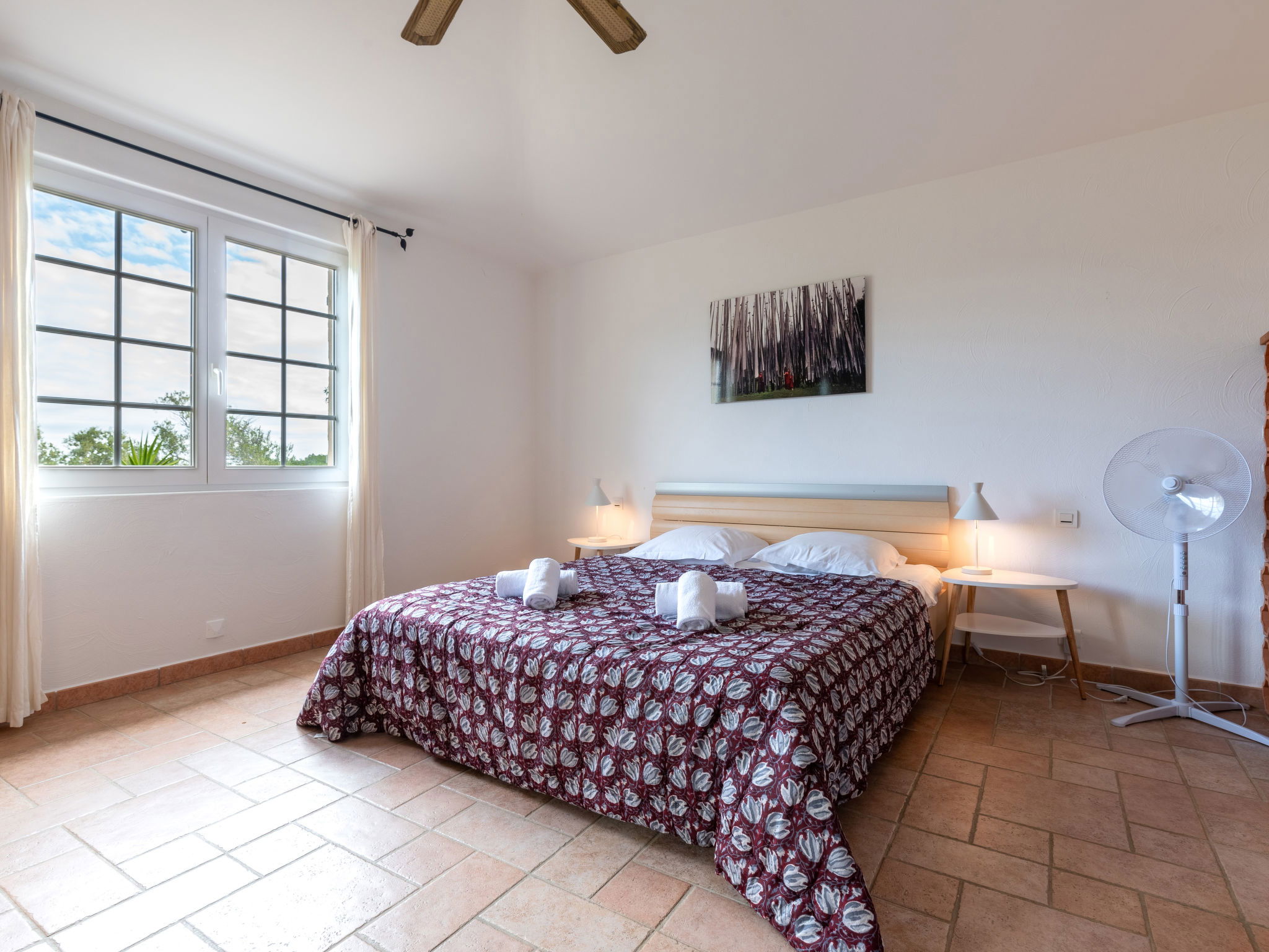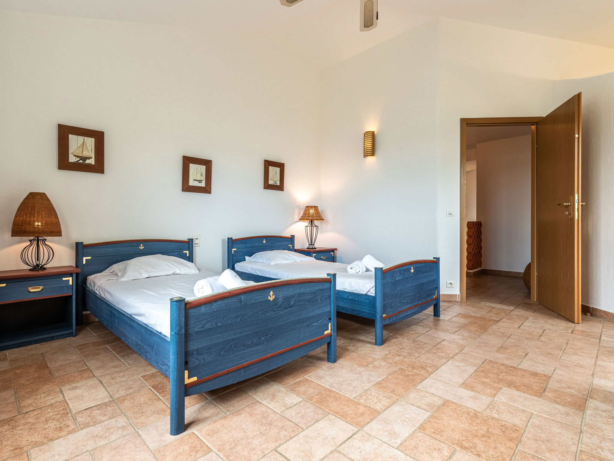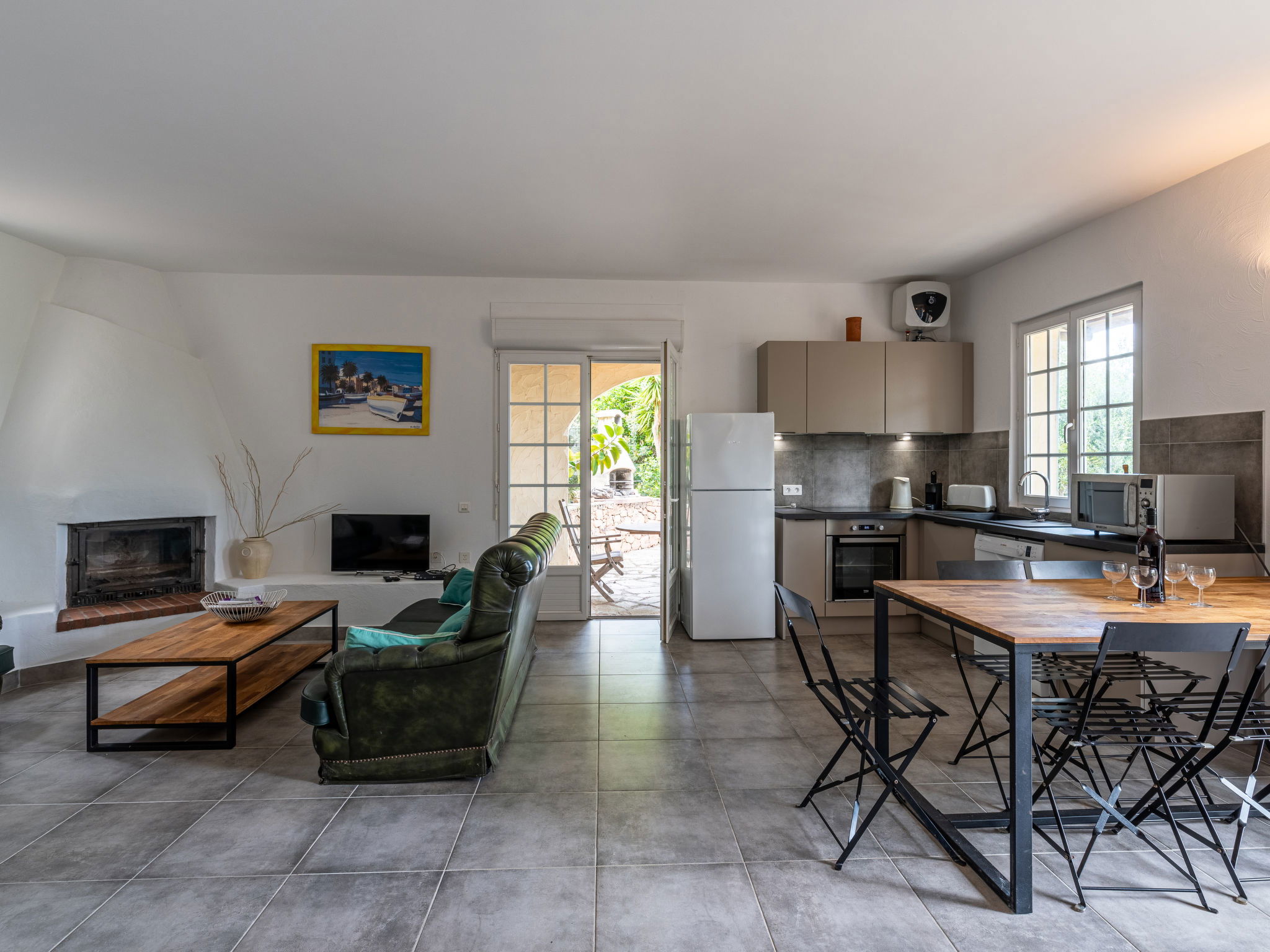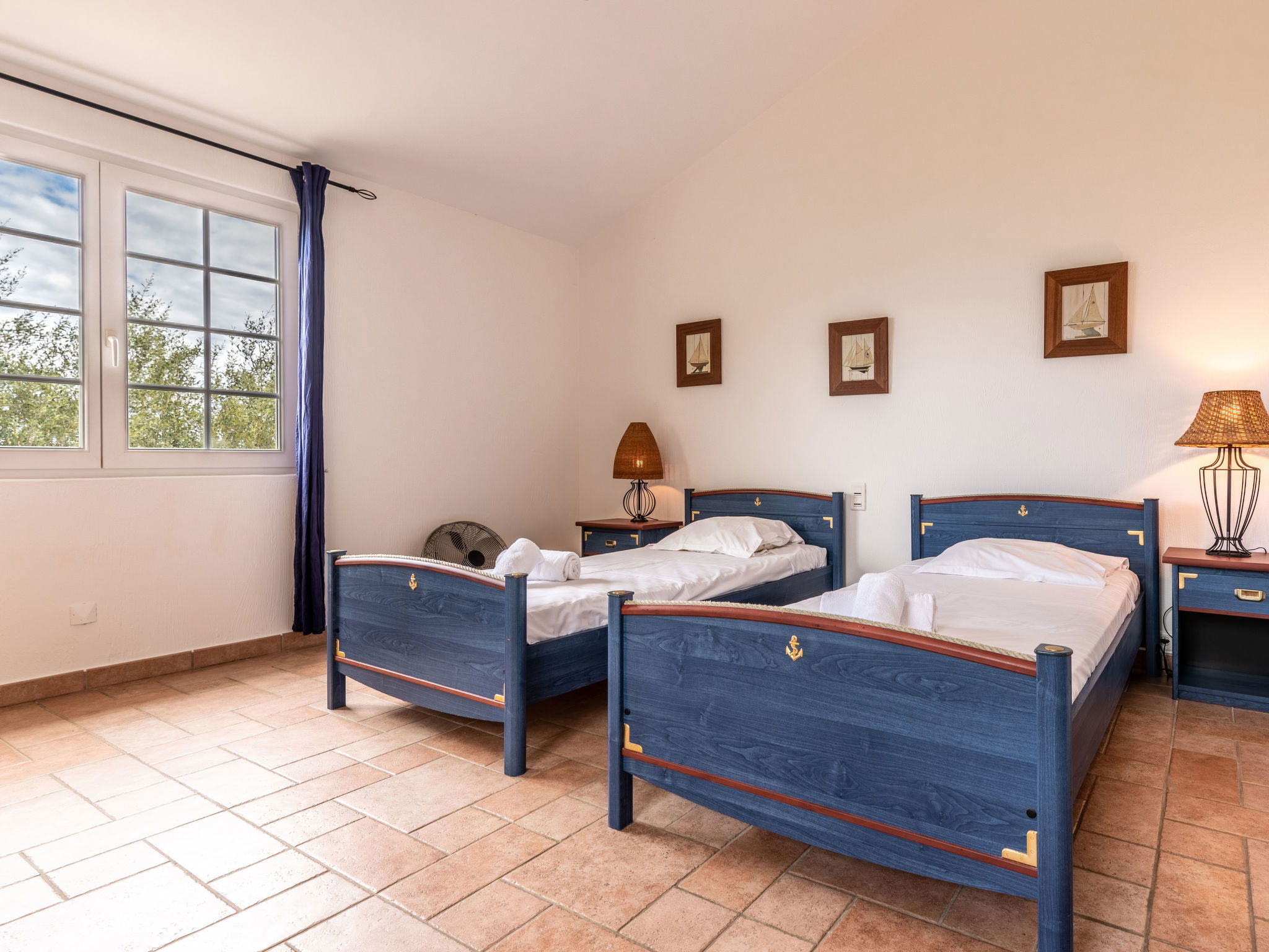 3-room villa 100 m2 on 2 levels. Entrance hall. Living/dining room with open-hearth fireplace and TV (flat screen), hi-fi system. Exit to the terrace. Open kitchen (3 hot plates, oven, dishwasher, toaster, kettle, microwave, freezer, electric coffee machine, Capsules for coffee machine (Nespresso) extra). Exit to the terrace. Sep. WC. Upper floor: 1 room with 1 french bed (160 cm, length 200 cm), shower and fan. 1 room with 2 beds (90 cm, length 190 cm), 1 sofabed (120 cm, length 190 cm), shower and fan. Sep. WC. Terrace 50 m2, large garden. Barbecue, deck chairs (4). Beautiful view of the sea. Facilities: washing machine, children's high chair, baby cot, hair dryer. Internet (WiFi, free). Parking (3 cars). Please note: suitable for families. Non-smokers only. Maximum 1 small pet/ dog allowed. Smoke alarm. 2A2470005896F