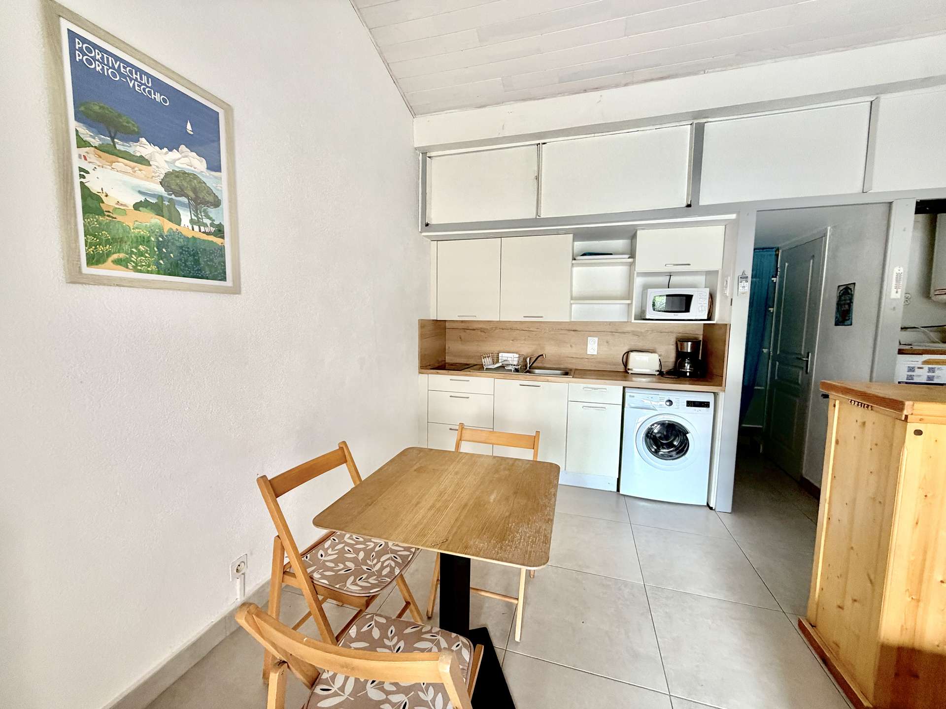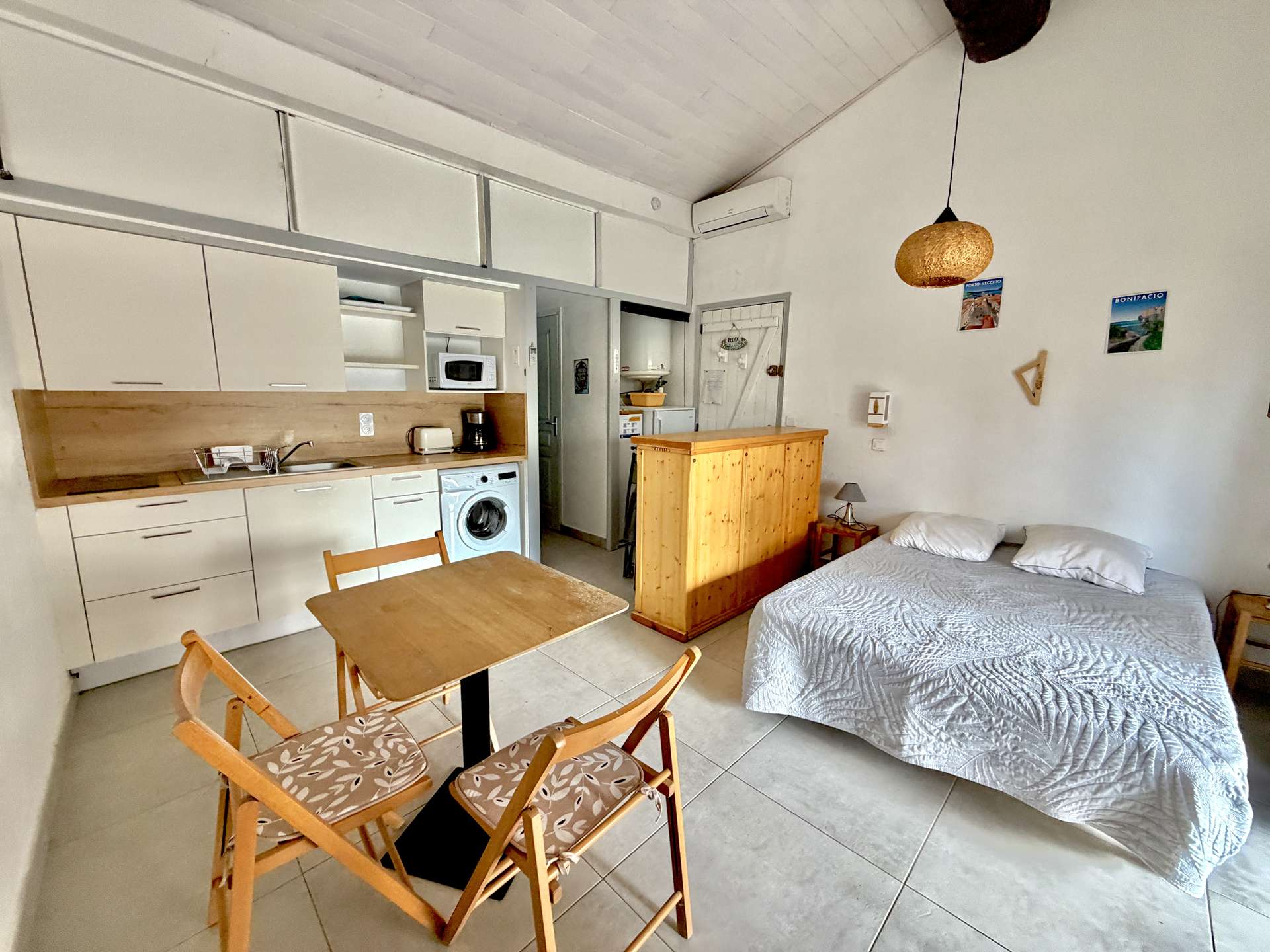 23m² approximately - up to 2 people Located in the Hameaux de Pietragione just 200 meters from the beach of Santa-Giulia. This villa is made up of a main room with a double bed, a fitted kitchen area, a shower room and a separate WC. Most of this villa: A covered terrace hidden by a hedge with garden furniture equipped with a gas barbecue. You can also enjoy free access to the residence's tennis court. The air conditioning is in the main room. Private parking. End of stay cleaning, bed linen and towels are included in the price.