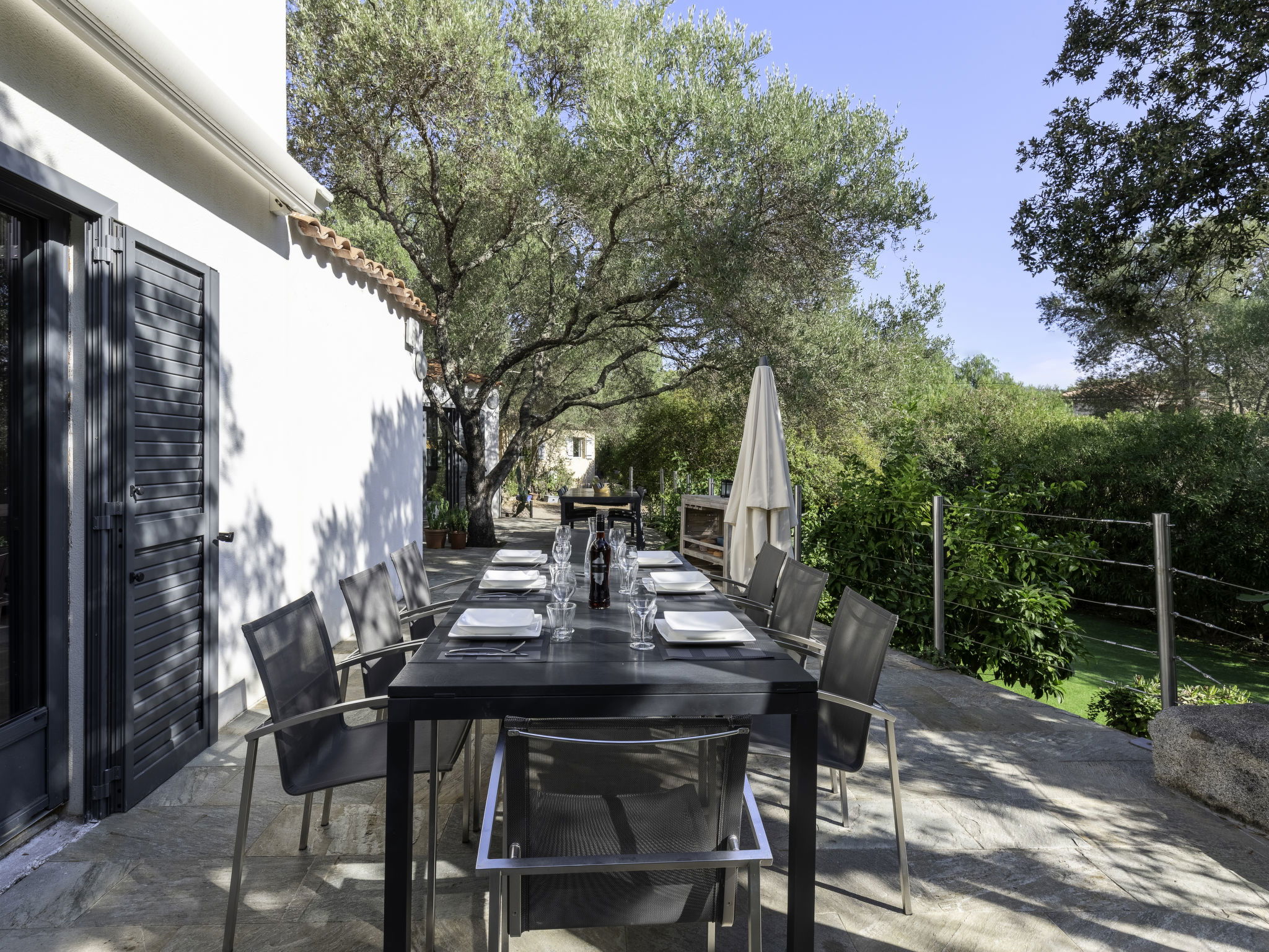 Porto-Vecchio: Beautiful, comfortable villa "Villa Romana", 2 storeys, surrounded by trees. On the outskirts Porto-Vecchio, excellent location: right in the centre but still quiet, 750 m from the sea, 3.5 km from the beach. Private: property 2'000 m2 (fenced), swimming pool angular, heated, fenced (11 x 4 m, depth 70 - 180 cm, seasonal availability: 15.May. - 31.Oct.). Table tennis, boules. In the house: washing machine, tumble dryer, drying room. Parking, single garage. Shop 850 m, supermarket 2.5 km, bakery 400 m. Sports harbour 850 m, golf course (9 hole) 6 km. Nearby attractions: Plage de Santa Ghjulia 7 km, Plage de Palombaggia 10 km, Bonifacio 27 km. Well-known lakes can easily be reached: Lac de l'Ospédale 26 km. Hiking paths: Aiguilles de Bavella 50 km. Please note: car recommended.