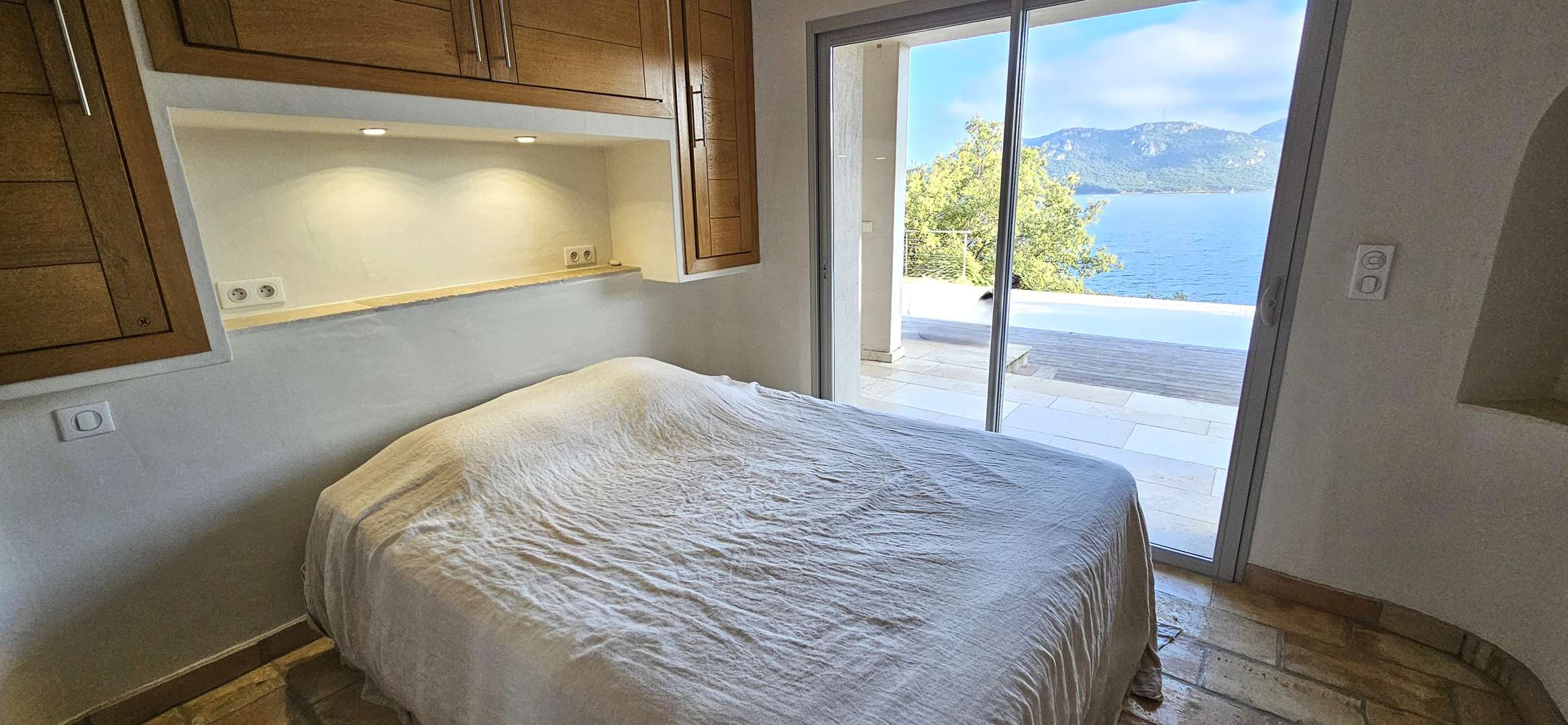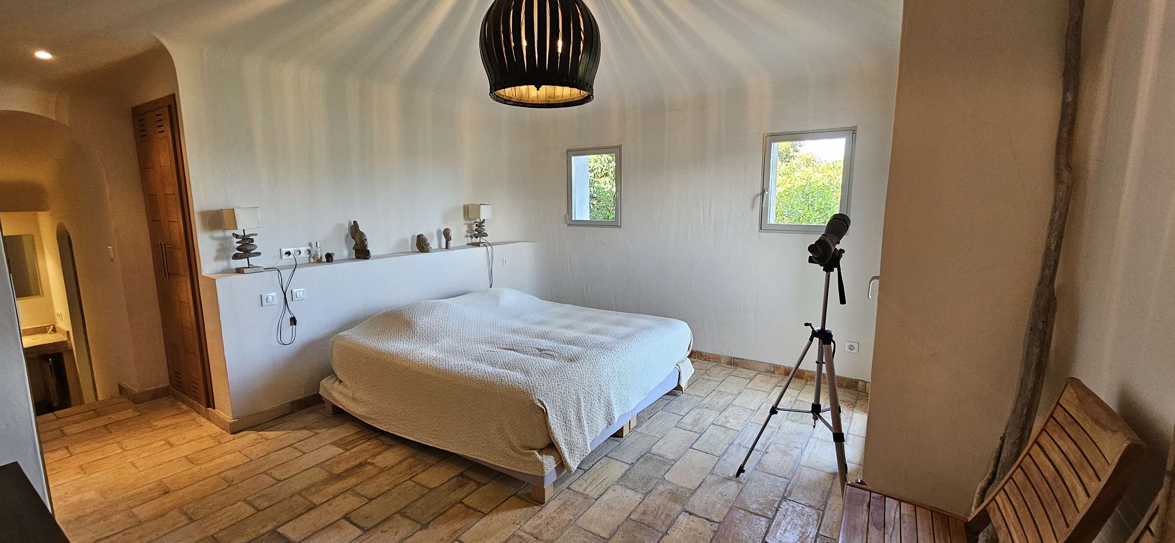 Ground floor: Open-plan living room with fully equipped kitchen, dishwasher, ceramic hob, electric oven, fridge-freezer, ILLY coffee maker, toaster, kettle... opening onto a covered north-facing terrace with fixed barbecue and dining area, and a south-facing terrace with magnificent views of the gulf and port of Porto-Vecchio. Attractive living room with masonry bench and TV.