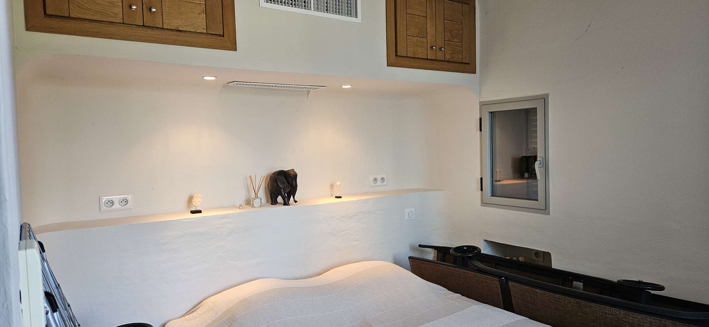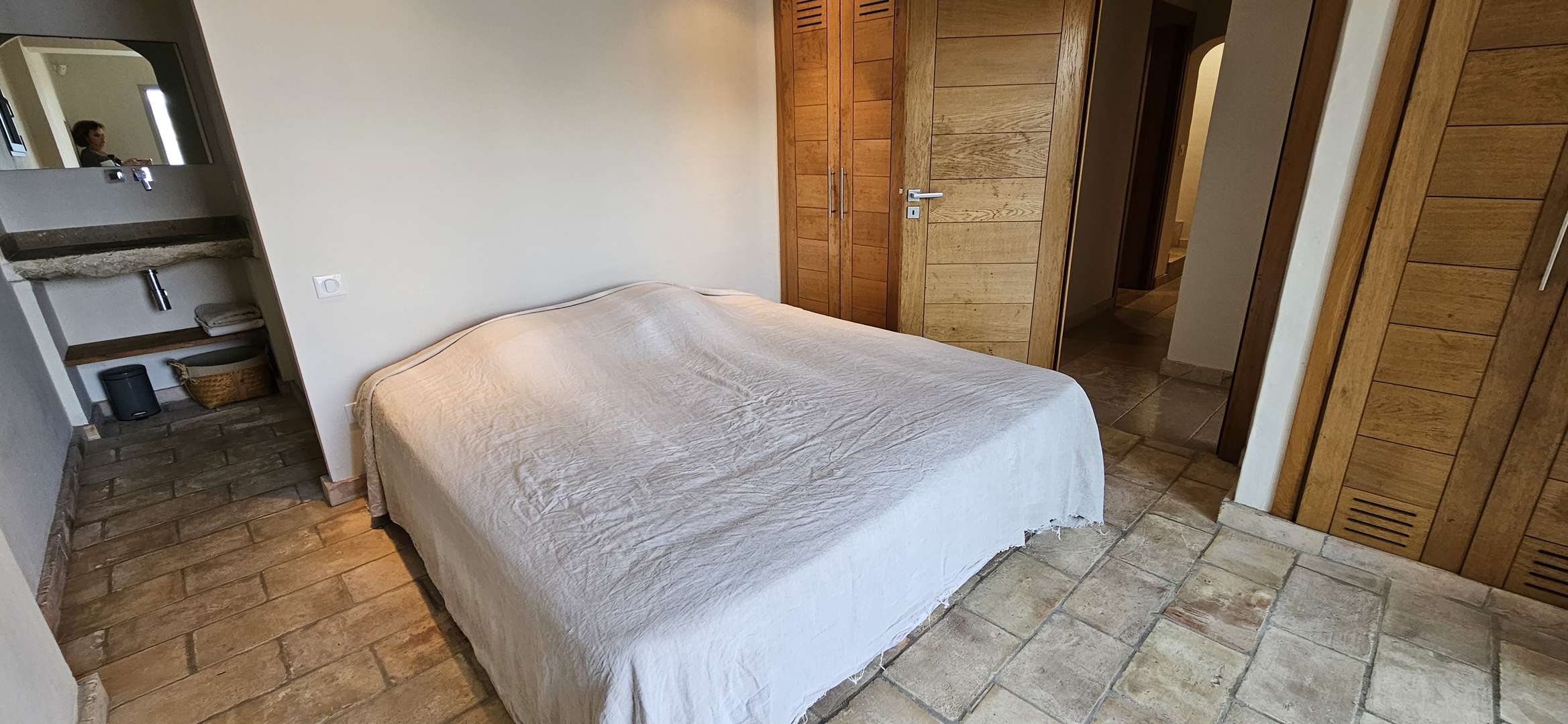 Bedroom 1: master suite with 180 cm bed, dressing room, safe, sea-view balcony. En-suite shower room with walk-in shower, basin, heated towel rail. WC.