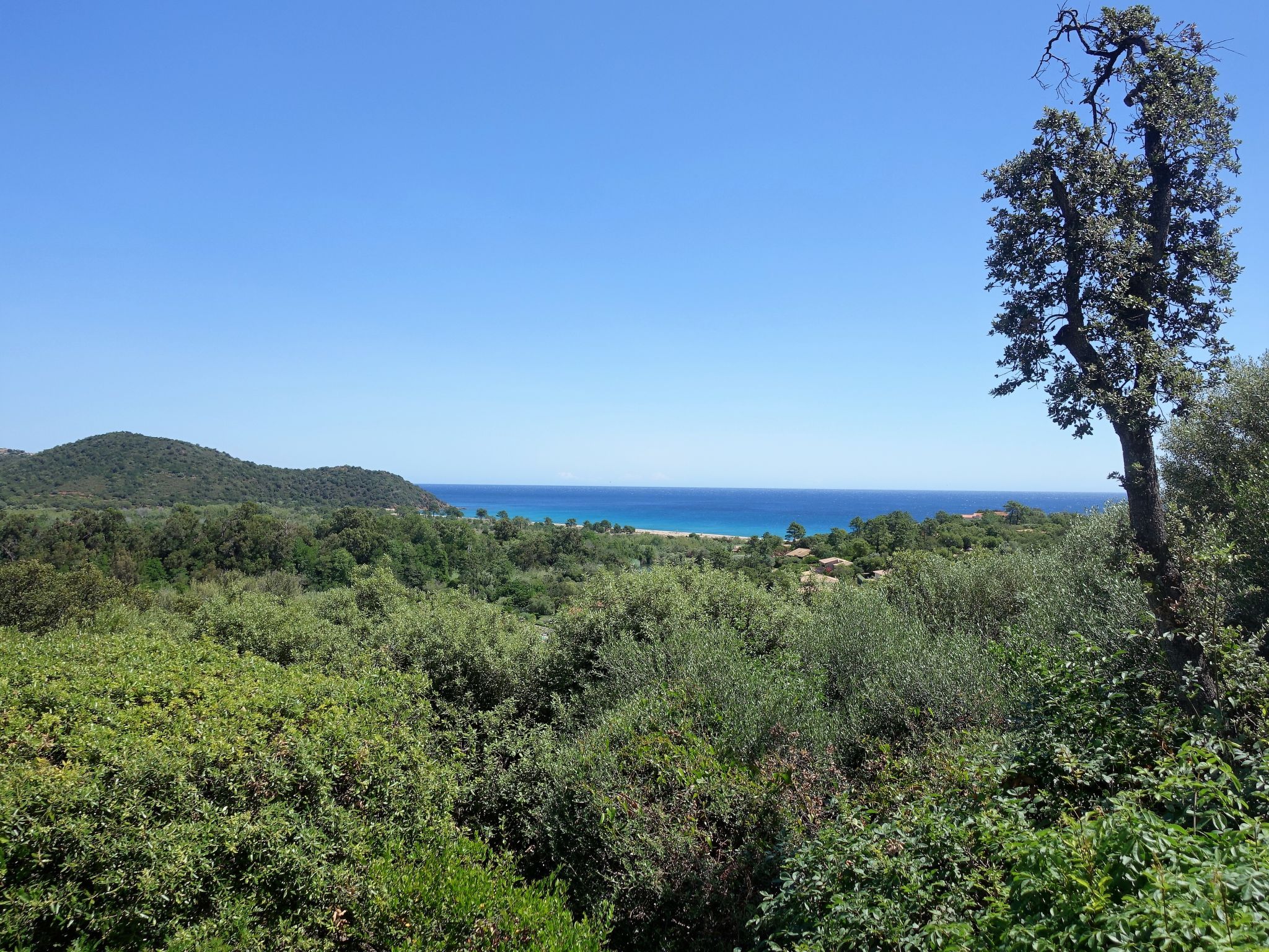 Olmucciu 8 km from Pinarellu: Small, cosy resort "Fium del Cavu". 25 houses in the residence. In the district of Olmucciu 8 km from the centre of Pinarellu, 16 km from the centre of Porto Vecchio, 131 km from the centre of Bastia, in a sunny position on a slope, 500 m from the sea, 500 m from the beach, 500 m from the river, in a cul-de-sac, in the countryside. For shared use: beautiful terraced garden with plants and trees, meadow, swimming pool fenced (16 x 8 m, seasonal availability: 14.May. - 28.Oct.). Outdoor shower, terrace. In the complex: reception, restaurant, bar, WiFi, billiard table. Parking on the premises. Shop 5 km, supermarket 16 km, bus stop 5 km, sandy beach "Plage de l'Ovu Santu" 500 m. Tennis 250 m. Please note: car recommended. The photograph shows a typical example. Wifi only at the reception.