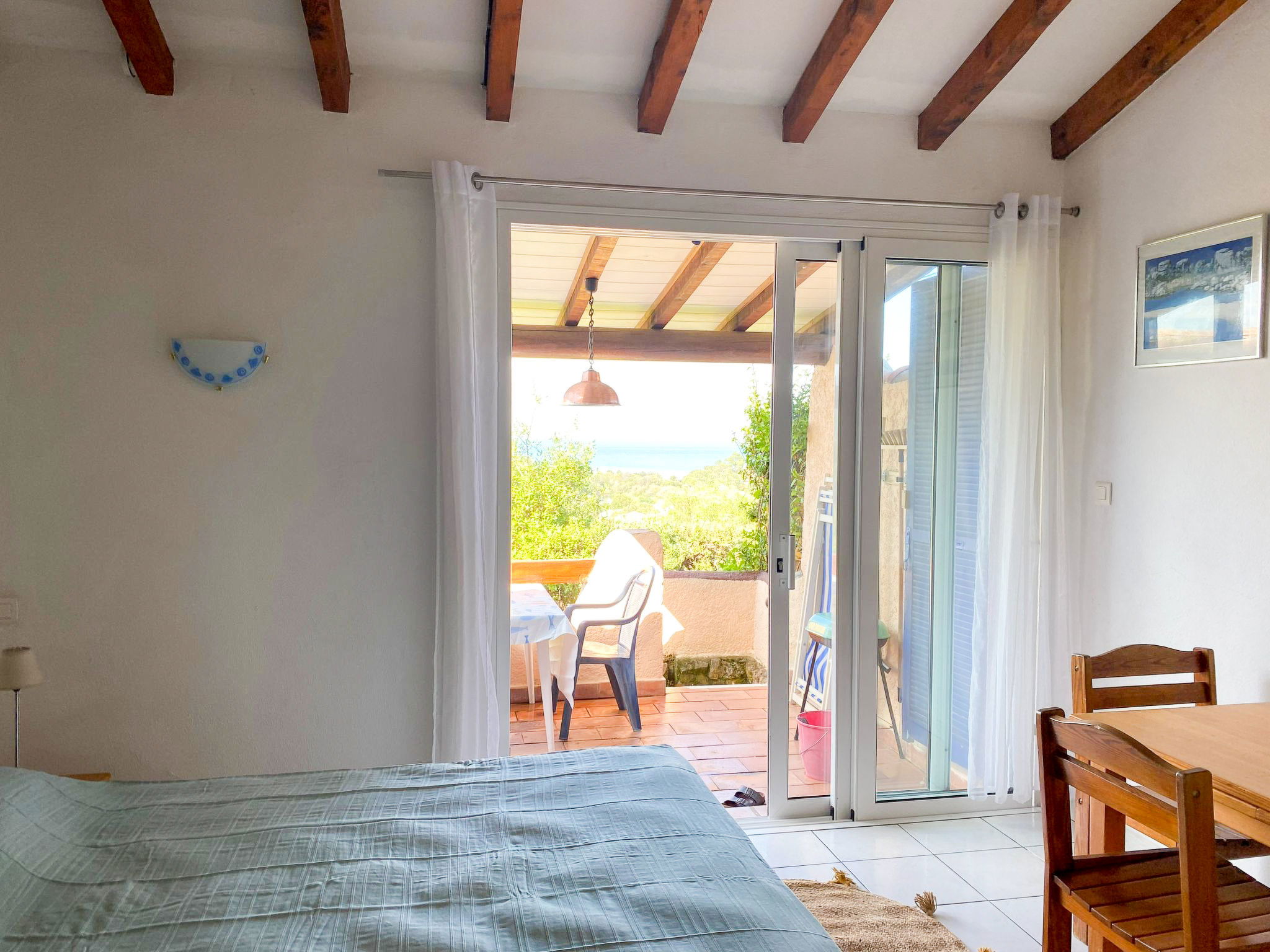 "Fium del Cavu", 1-room bungalow 22 m2. Practical furnishings: living/sleeping room with 1 french bed (160 cm), dining table and fan. Kitchenette (2 gas rings, toaster, microwave, freezer, electric coffee machine). Shower, sep. WC. No heating option. Terrace. Terrace furniture, barbecue, deck chairs (2). Beautiful view of the garden, the countryside and the ocean. Facilities: baby cot for up to 2 year olds. Parking (1 car). Please note: non-smokers only. Smoke alarm. Offer by a commercial proprietor according to Art. 155, IV, CGI