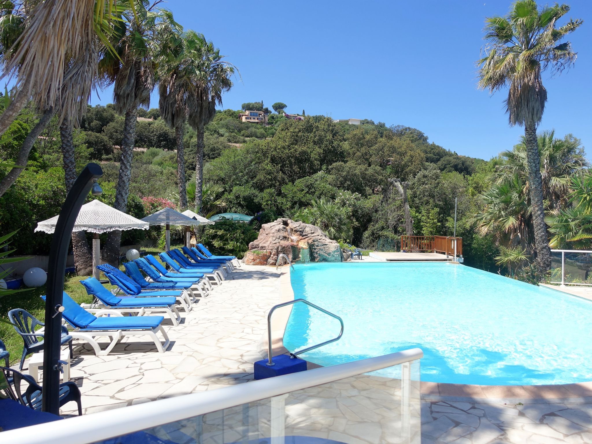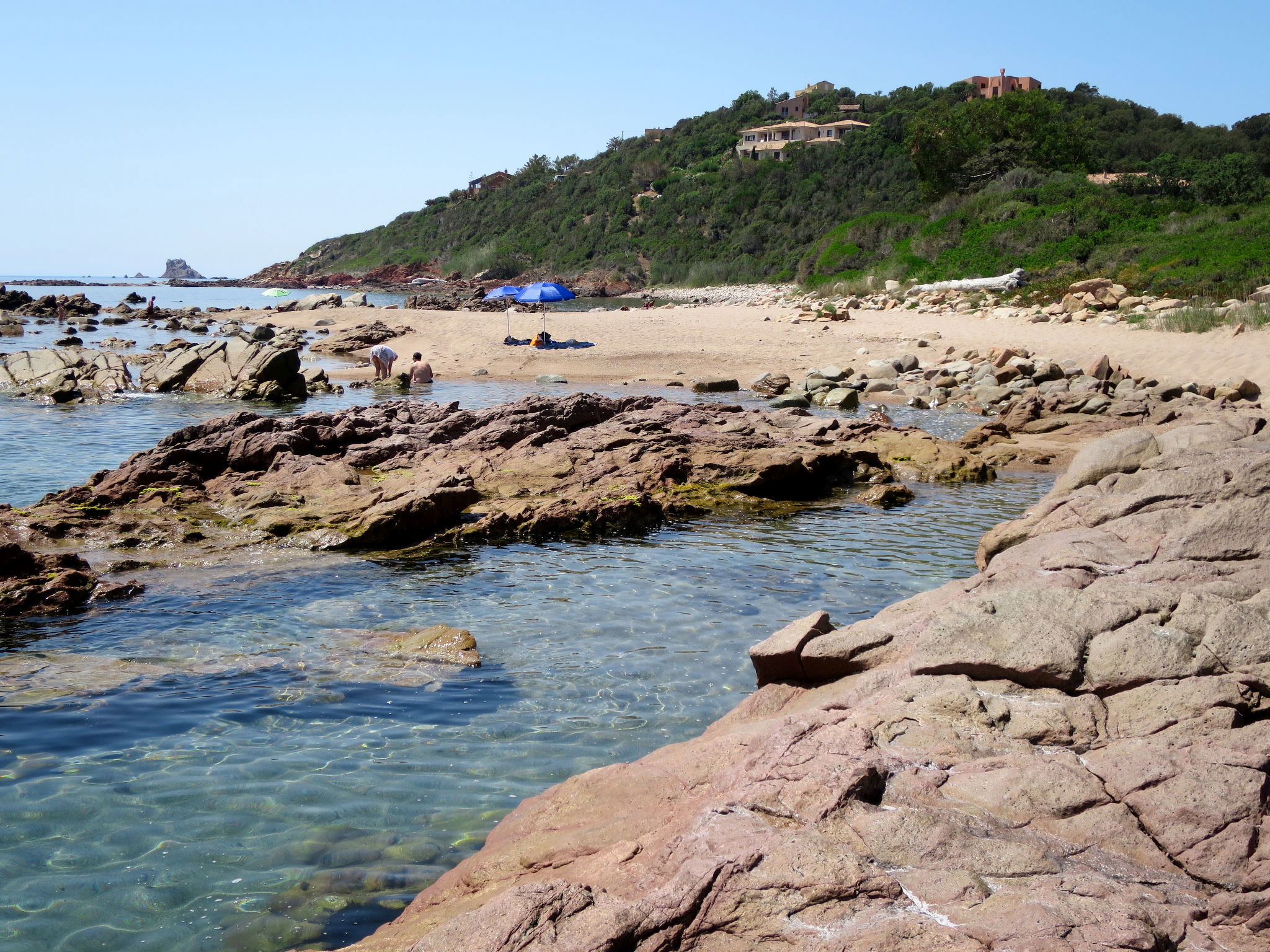 Olmucciu 8 km from Pinarellu: Small, cosy resort "Fium del Cavu". 25 houses in the residence. In the district of Olmucciu 8 km from the centre of Pinarellu, 16 km from the centre of Porto Vecchio, 131 km from the centre of Bastia, in a sunny position on a slope, 500 m from the sea, 500 m from the beach, 500 m from the river, in a cul-de-sac, in the countryside. For shared use: beautiful terraced garden with plants and trees, meadow, swimming pool fenced (16 x 8 m, seasonal availability: 14.May. - 28.Oct.). Outdoor shower, terrace. In the complex: reception, restaurant, bar, WiFi, billiard table. Parking on the premises. Shop 5 km, supermarket 16 km, bus stop 5 km, sandy beach "Plage de l'Ovu Santu" 500 m. Tennis 250 m. Please note: car recommended. The photograph shows a typical example. Wifi only at the reception.