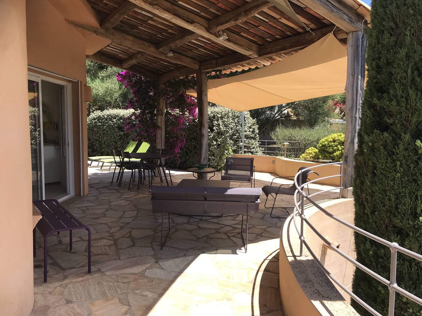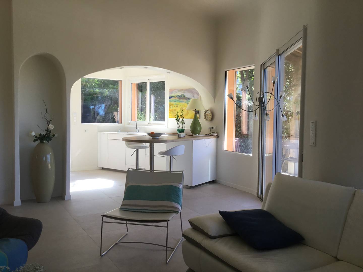 Living / Dining room (reversible air conditioning): Fireplace, flat screen TV 130 cm, TNT, DVD player, Possibility for the tenant to bring his cube + channel, concrete bench (4 places), sofa sets, armchair ... Bay glass overlooking pool side terrace.