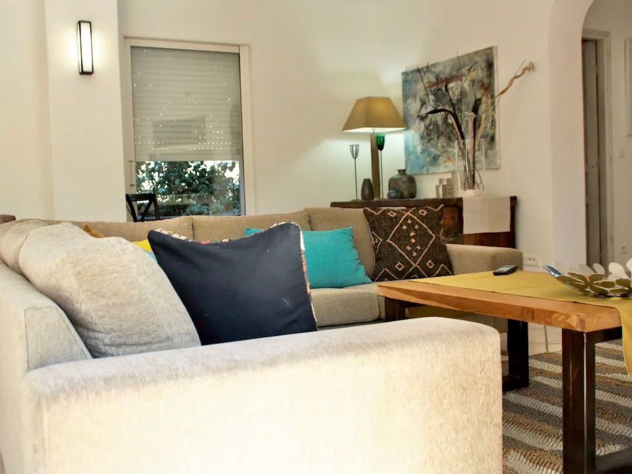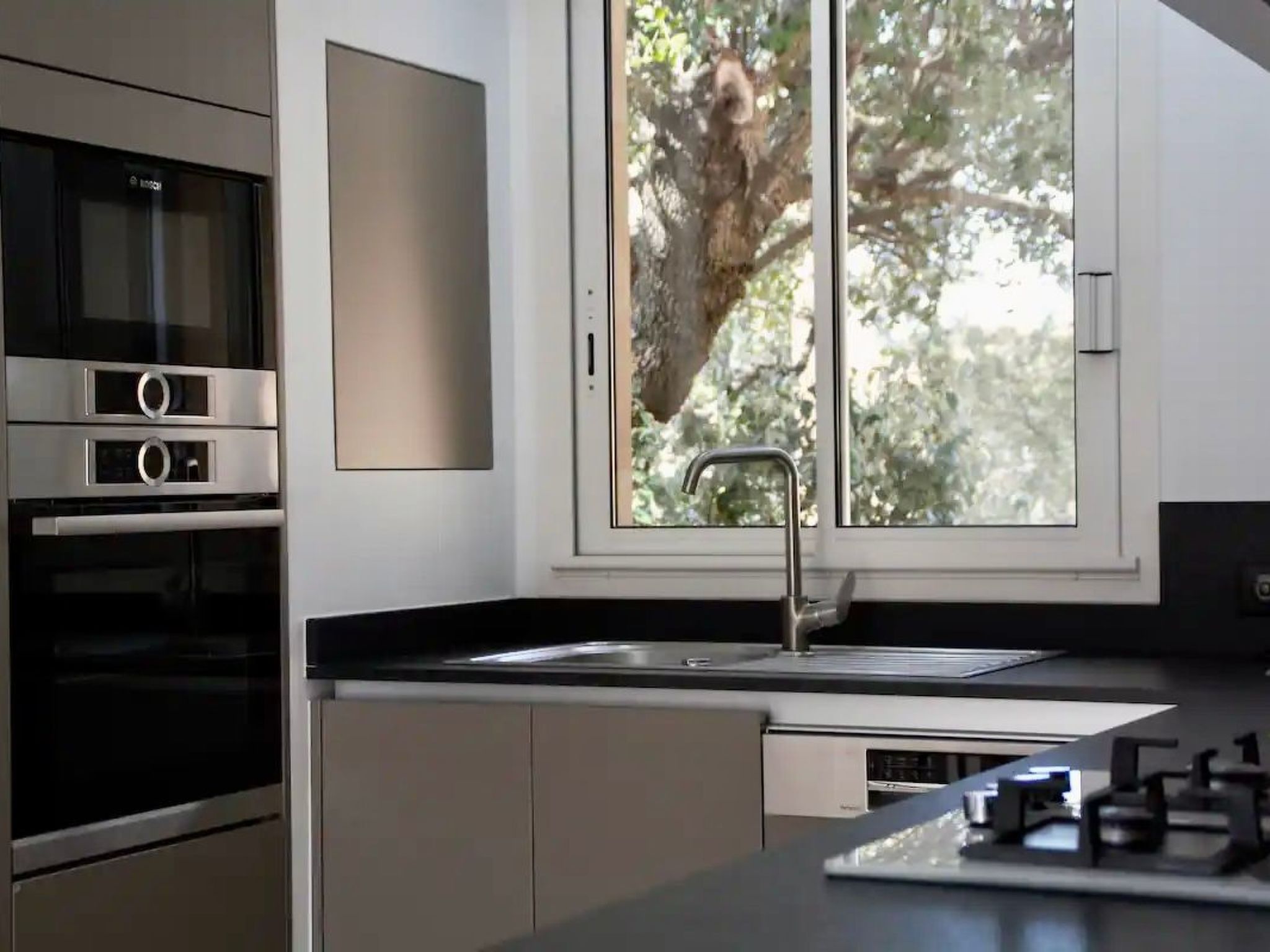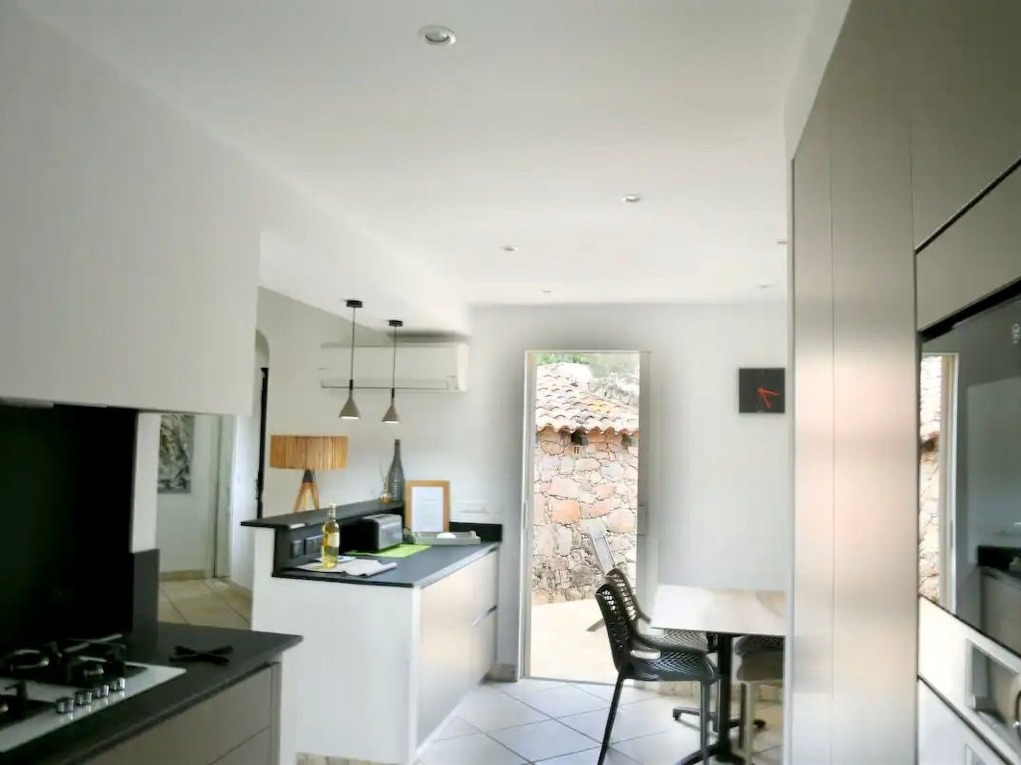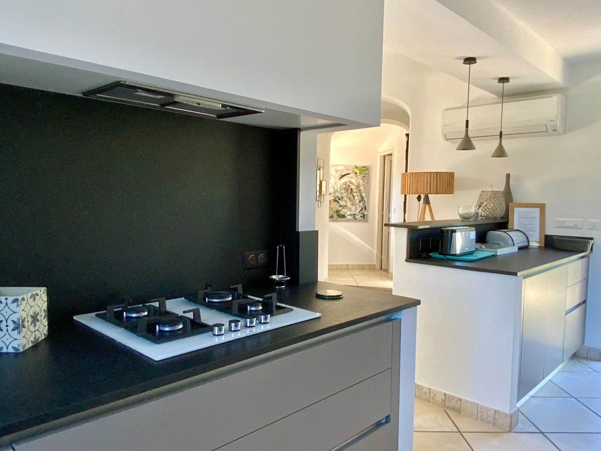 On the ground floor is the living room with a large corner sofa, a second sofa bed, kitchen + utility room with a sliding door opening onto a terrace, a corridor leading to the master bedroom in its utmost privacy, with its private shower room/WC, air conditioning, LED TV; its special feature is its exit to the outside via a sliding door.