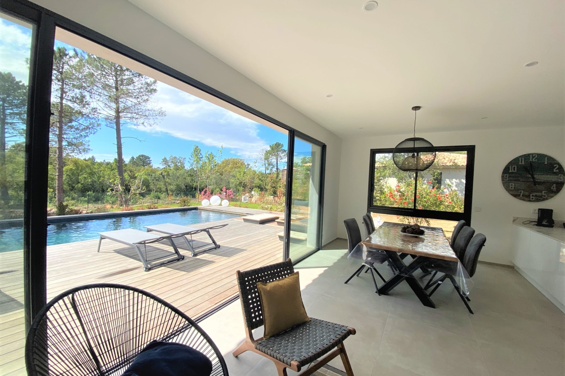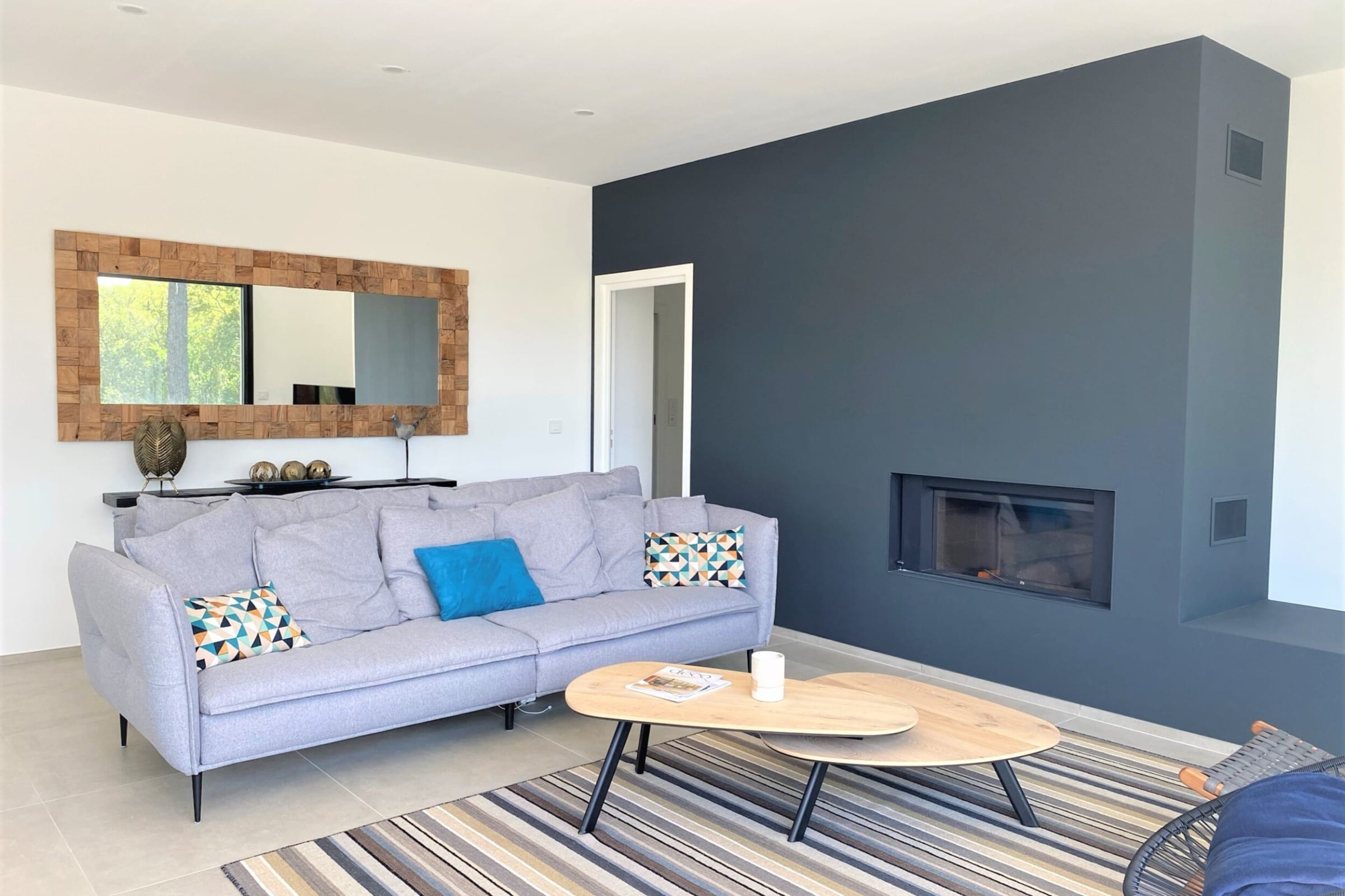 - Living / dining room with fireplace and bay windows overlooking the terrace and the swimming pool
