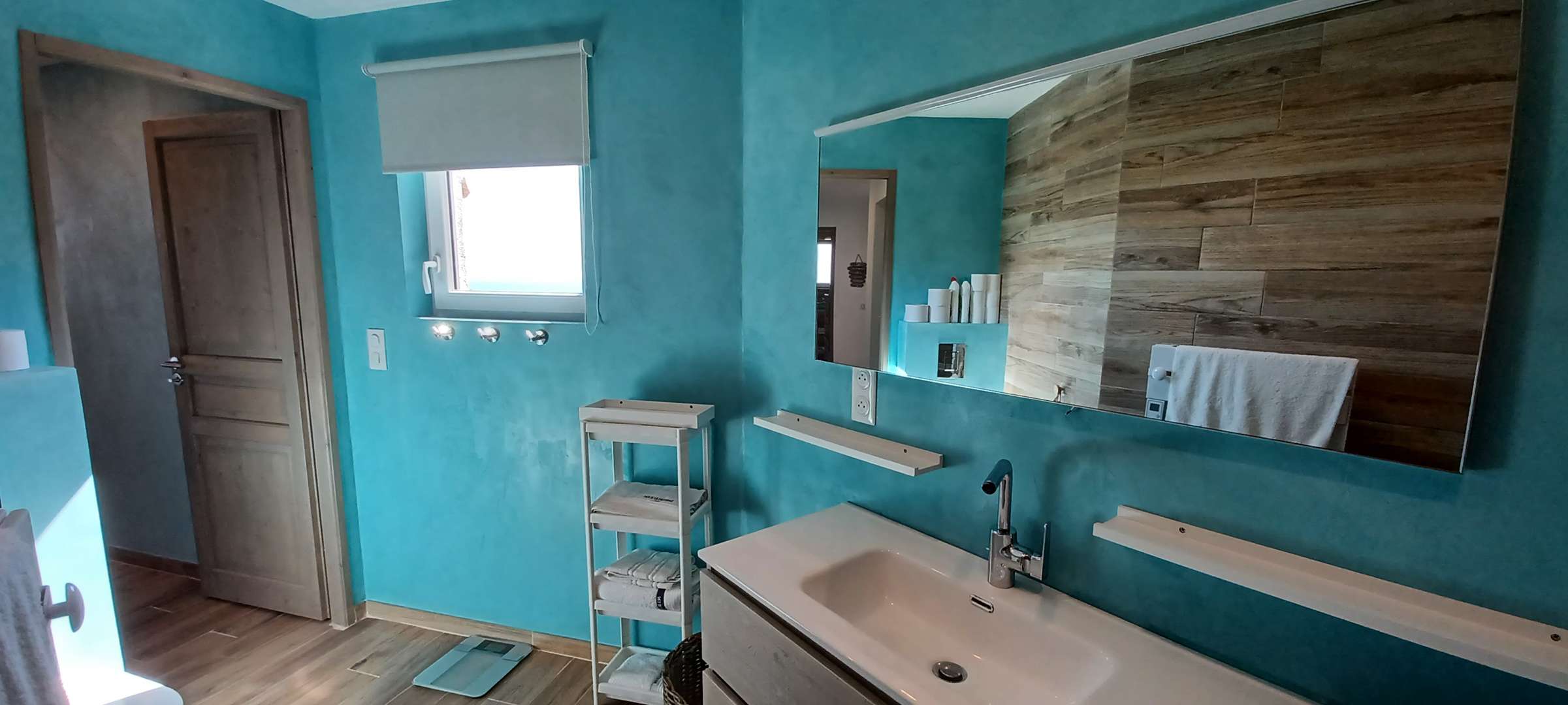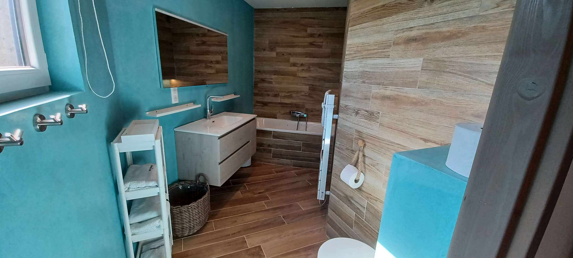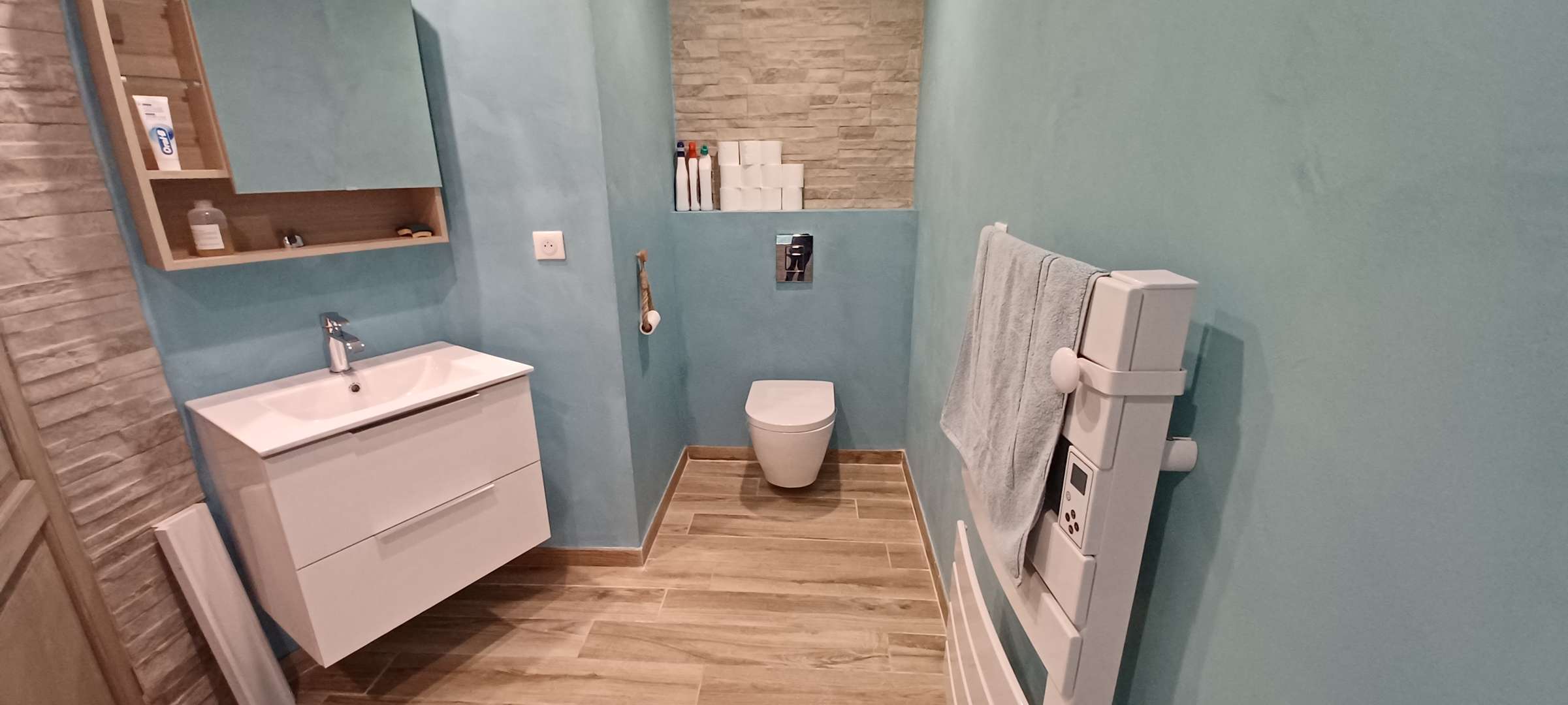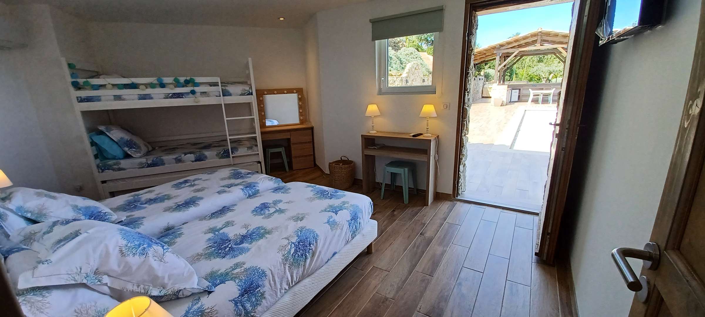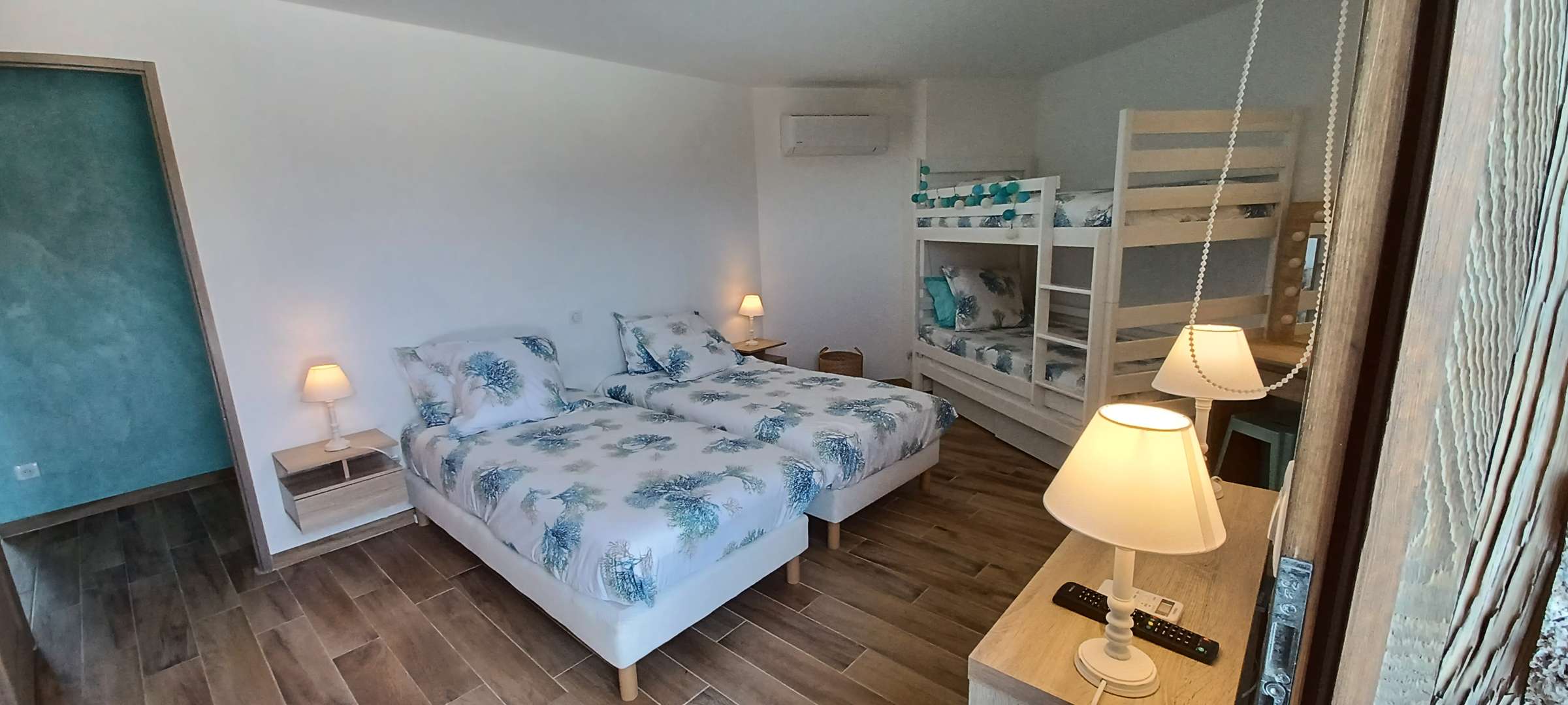 Room 3 : (independent entrance) 1 bed in 160, bunk beds (2x90), TV and storage, bathroom with bathtub, basin, towel dryer, WC.