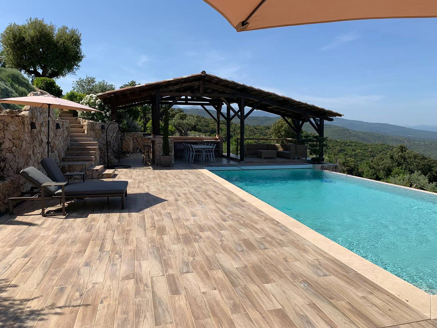 Overflowing swimming pool with salt (12m x 5m). Deckchairs, parasols.