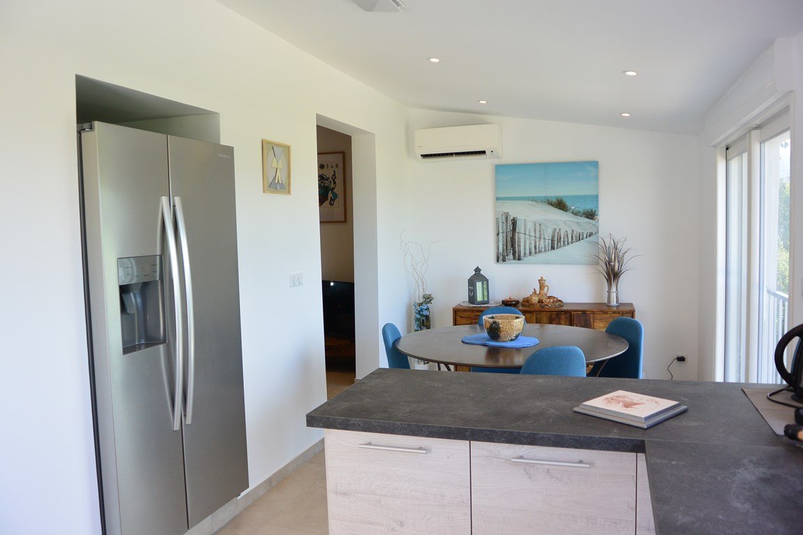 Kitchen open to living room, microwave, coffee maker, American fridge, stove, dishwasher, dining room .. all with a magnificent sea view.