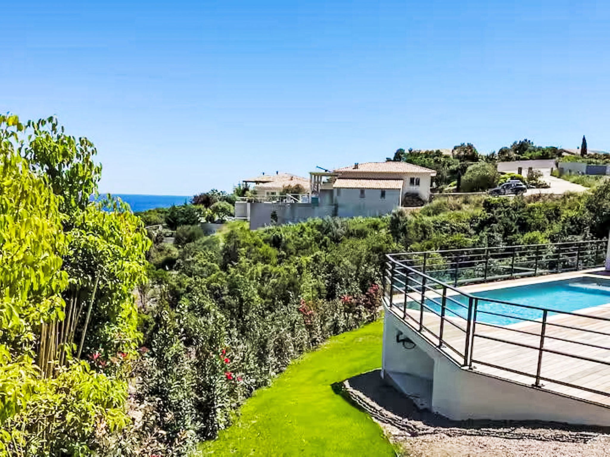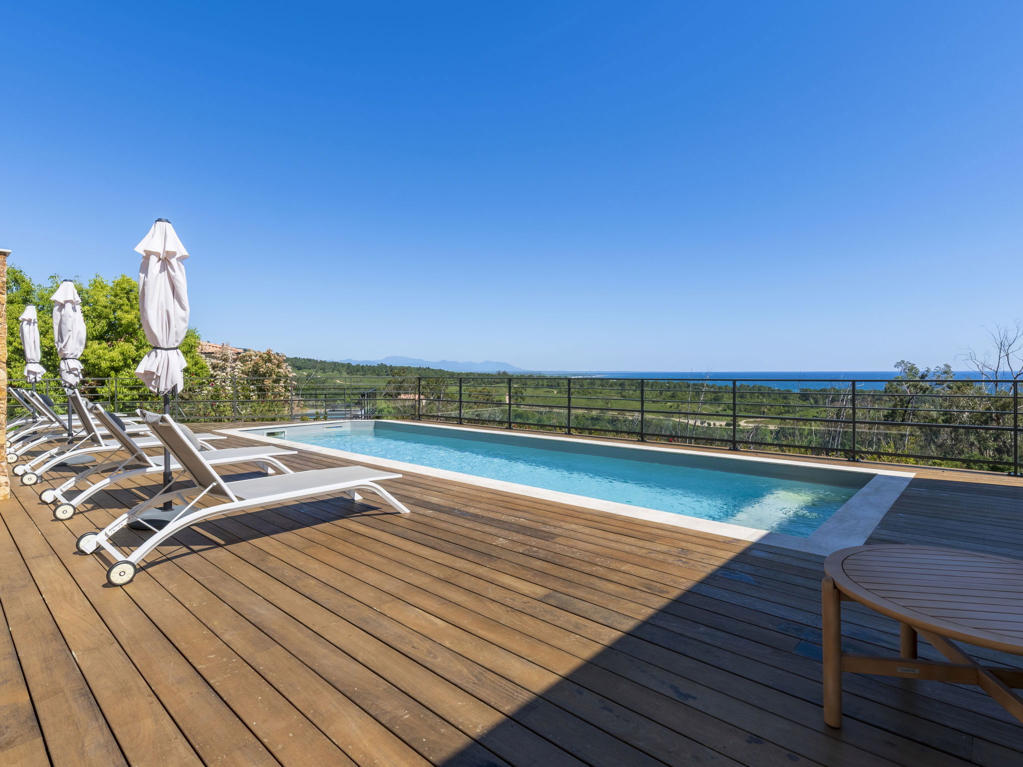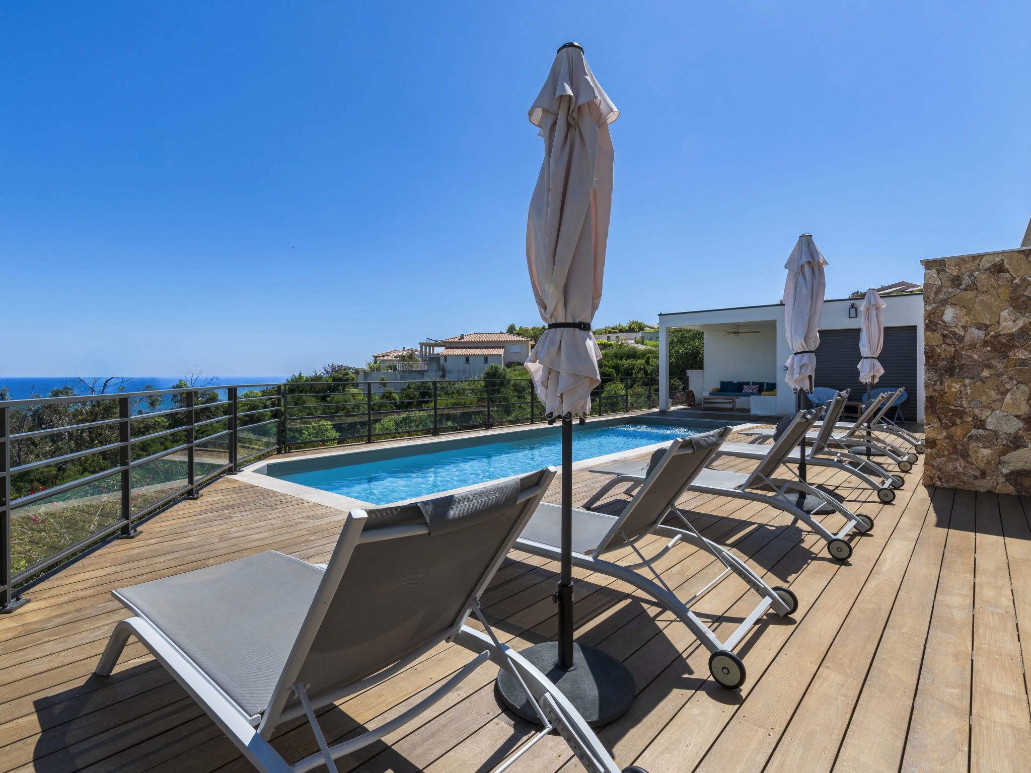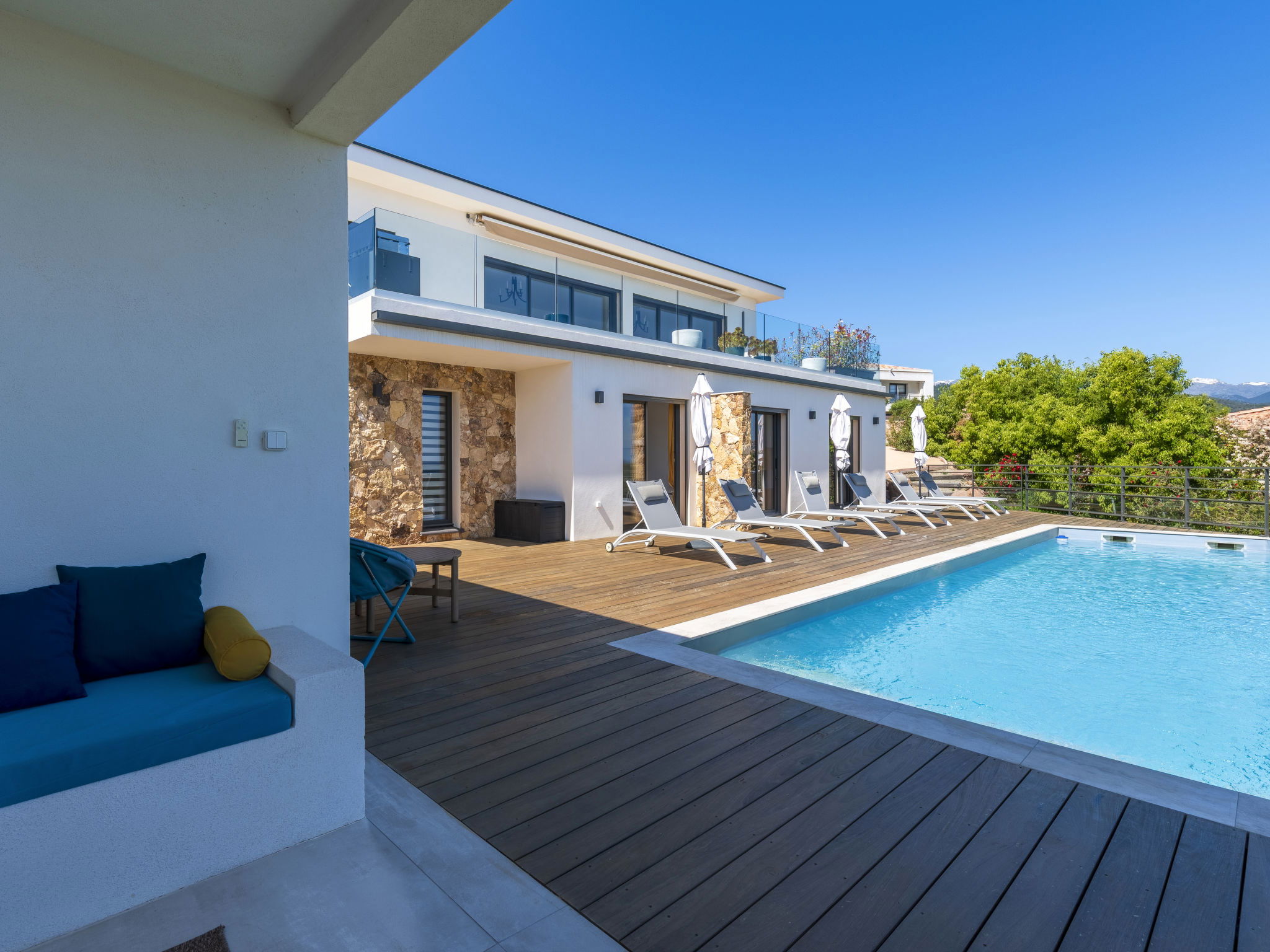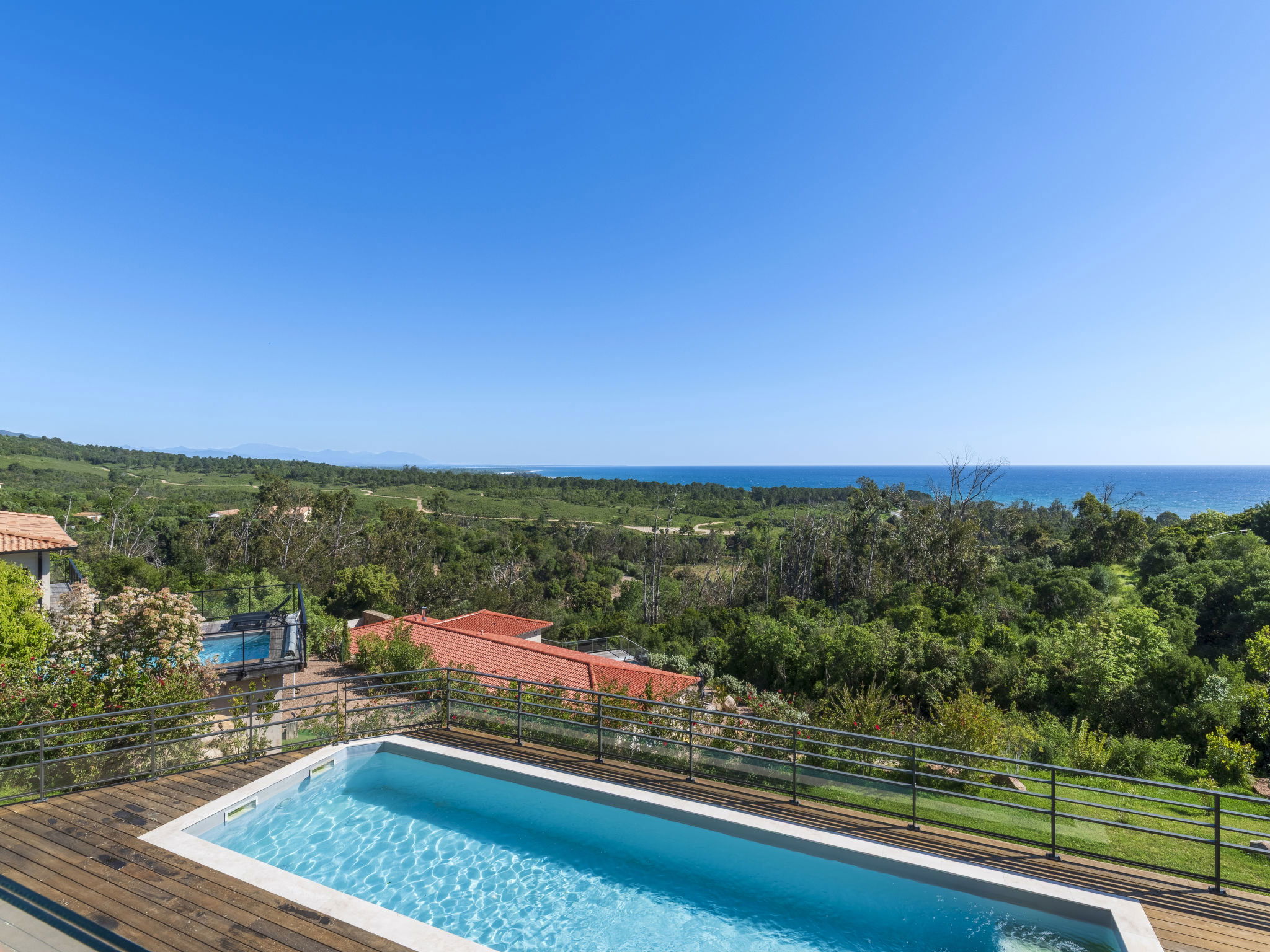 Solenzara: Beautiful villa. In a sunny, elevated position, 2.4 km from the sea, 2.7 km from the beach. Private: property (fenced), swimming pool angular (10 x 3 m, depth 150 cm, seasonal availability: 01.May. - 31.Oct.). Outdoor shower, pool house. House maid on request (extra). Parking at the house. Shop 2 km, supermarket 3 km, restaurant 1.5 km, bakery 2.5 km, bus stop 1.7 km. Sports harbour 2.3 km. Nearby attractions: Solenzara 2 km, Plage de Canelle 9 km. Hiking paths: Aiguilles de Bavella 30 km. Please note: car recommended. Baby equipment (included).