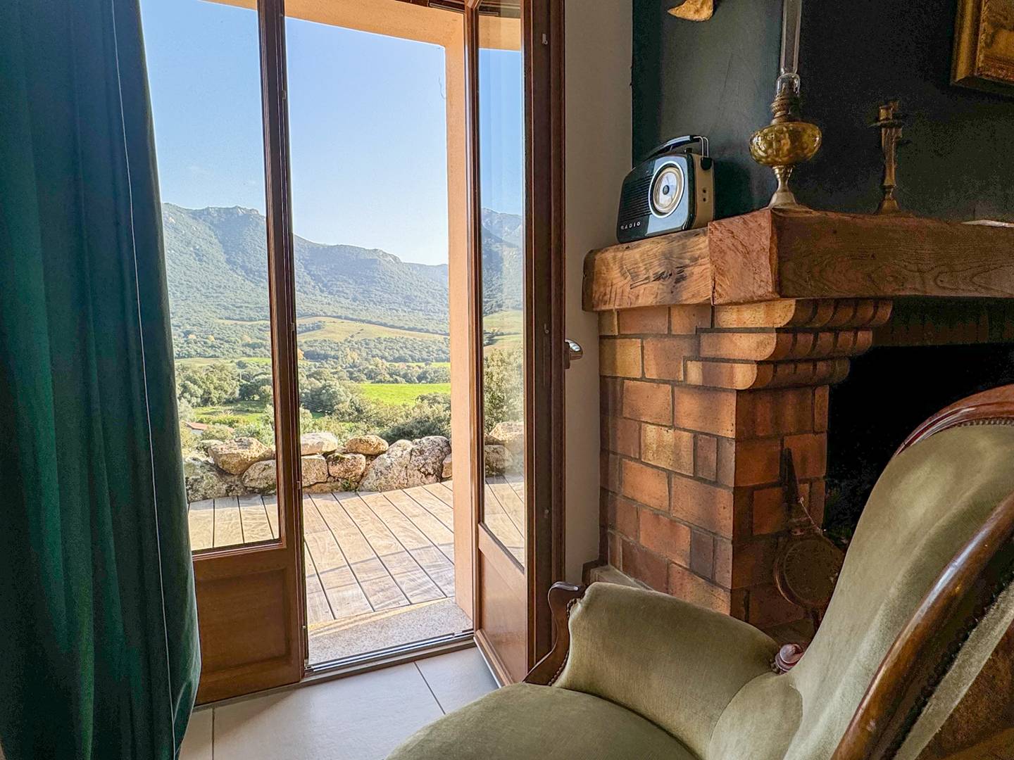 This renovated villa features a kitchen open to a bright living room with fireplace, dining area and lounge area, with access to terrace and swimming pool, from which you can admire the view.