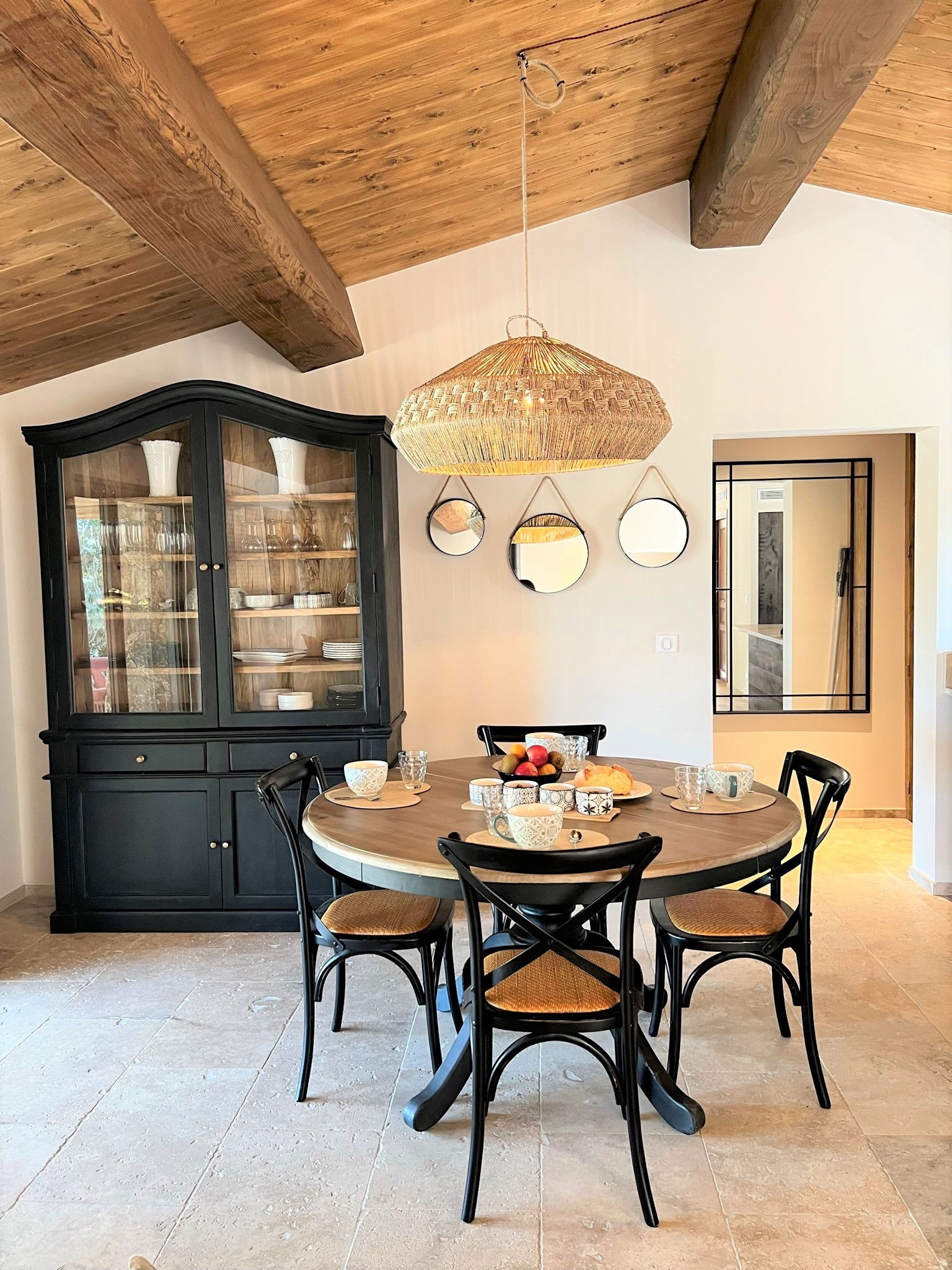 Beautiful living/dining room tastefully decorated, combining noble and authentic materials such as chestnut and travertine with natural colors, giving a truly cozy and chic effect to the farmhouse.