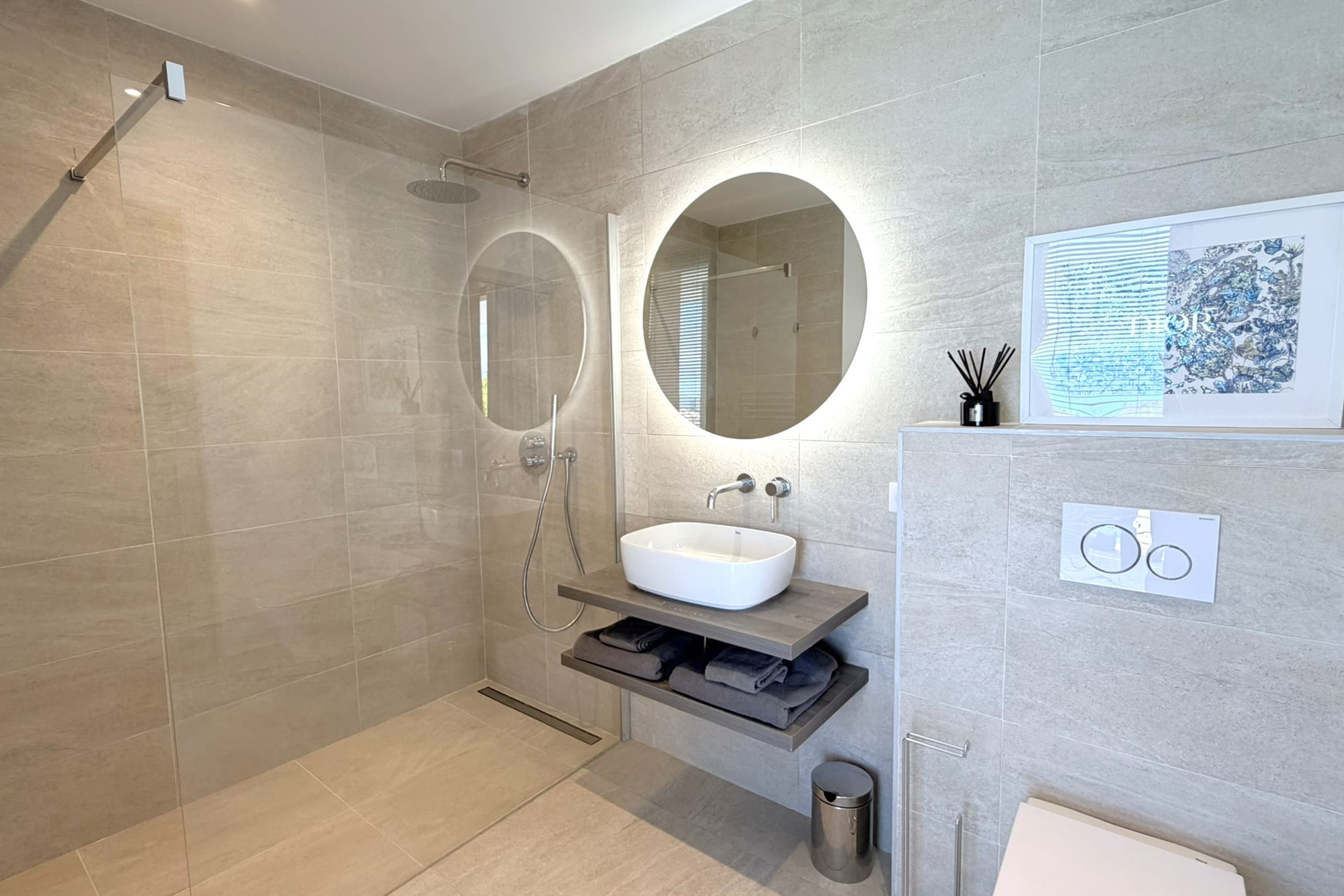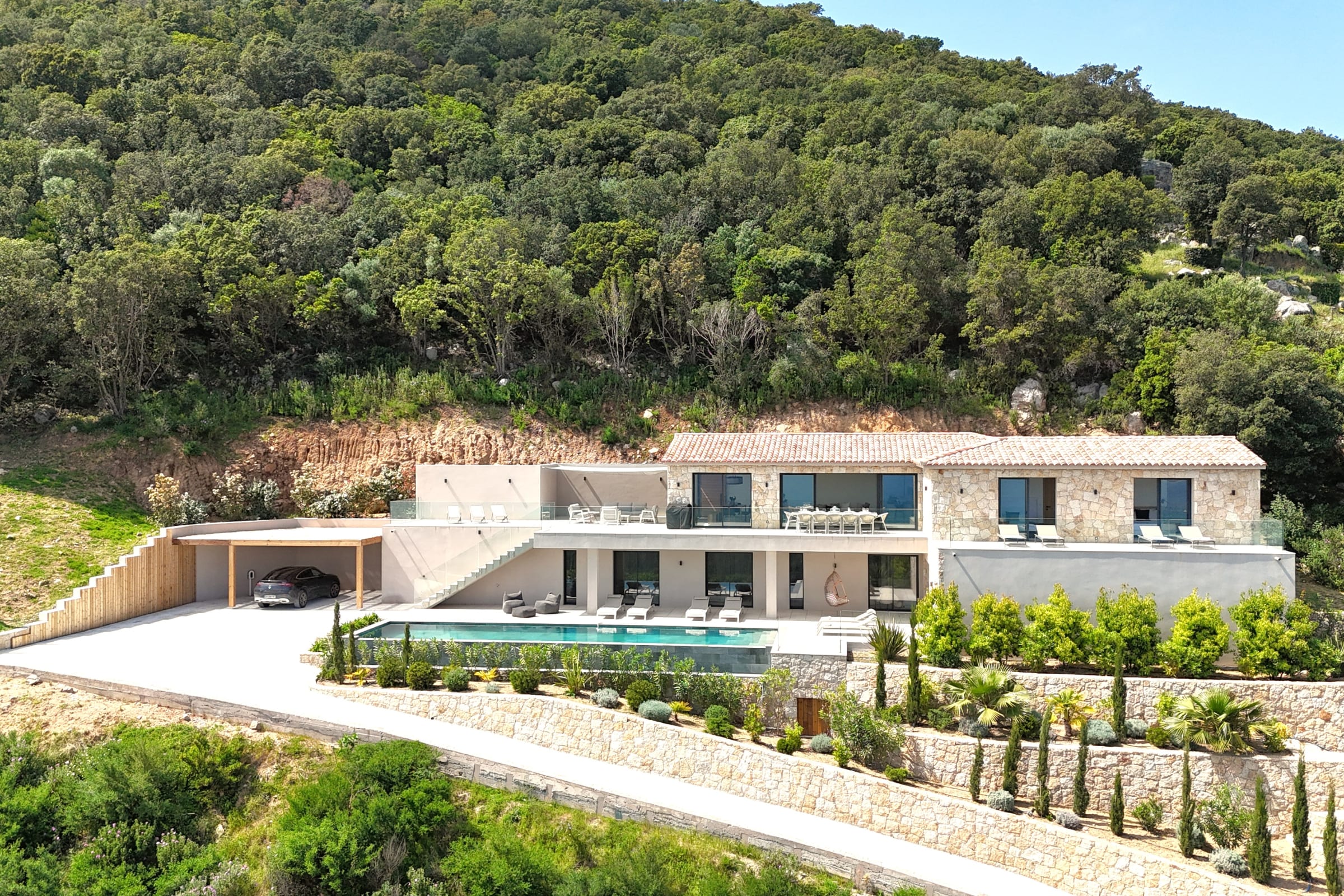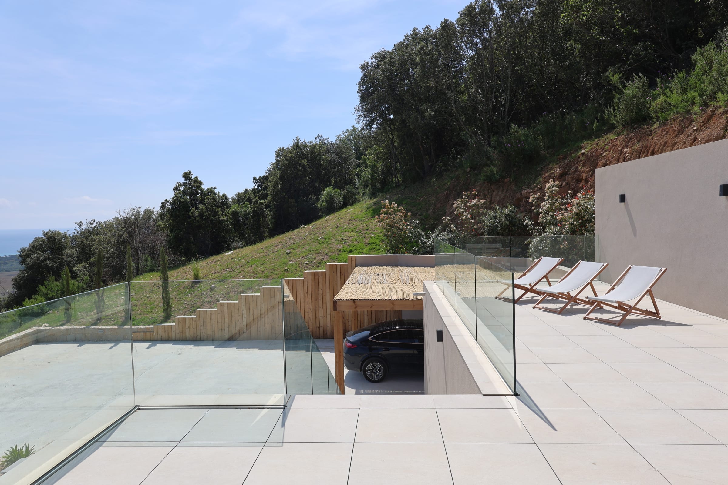 The villa has a closed garage, four outdoor parking spaces, a carport and a charging station for electric vehicles. A motorized gate and an alarm system ensure optimal security on a daily basis.