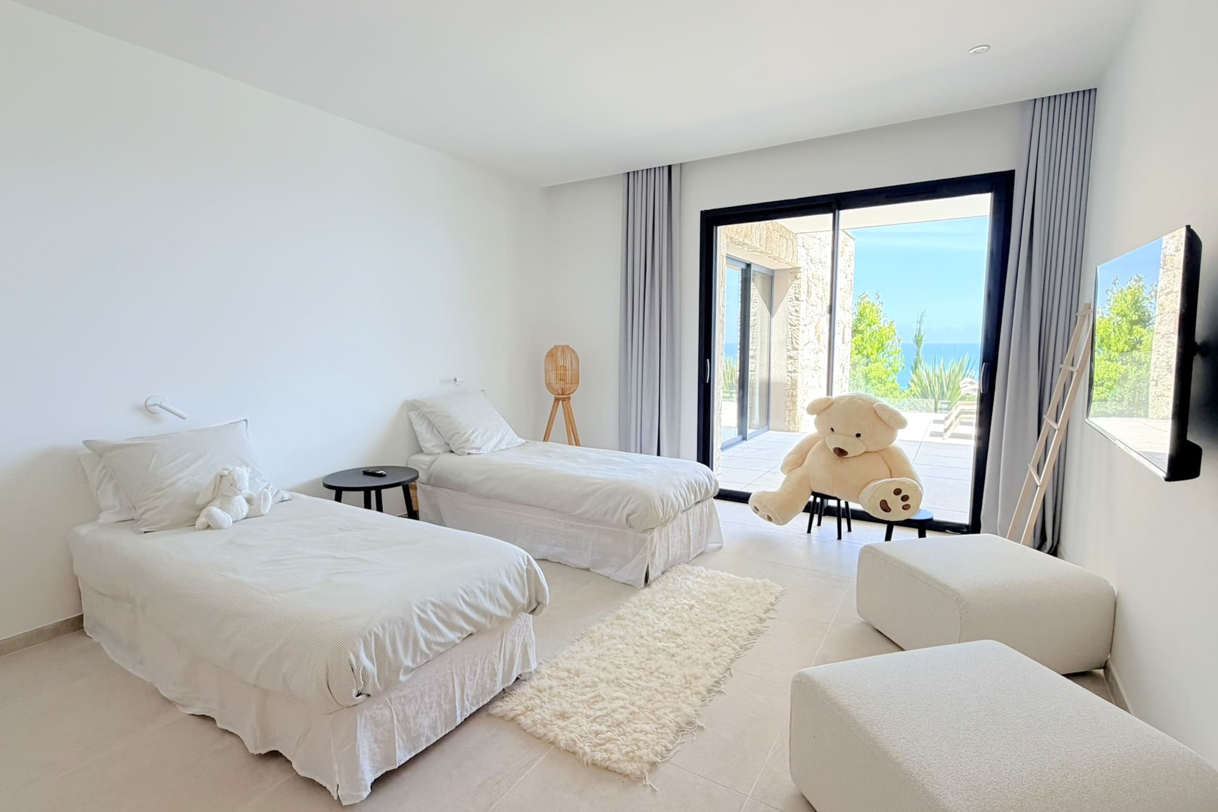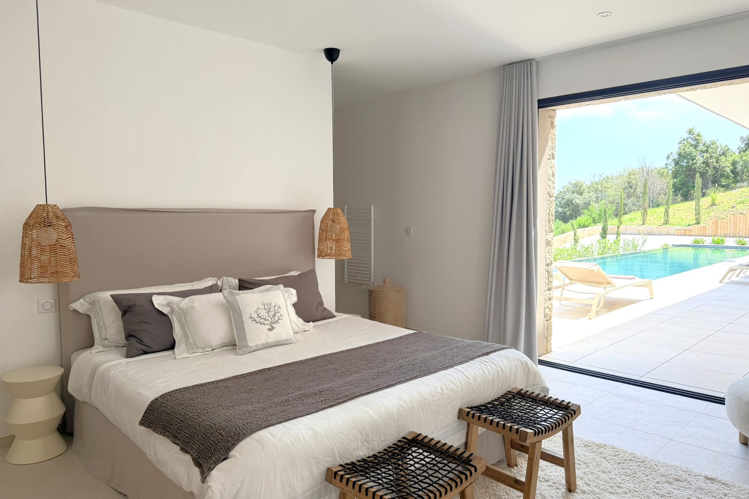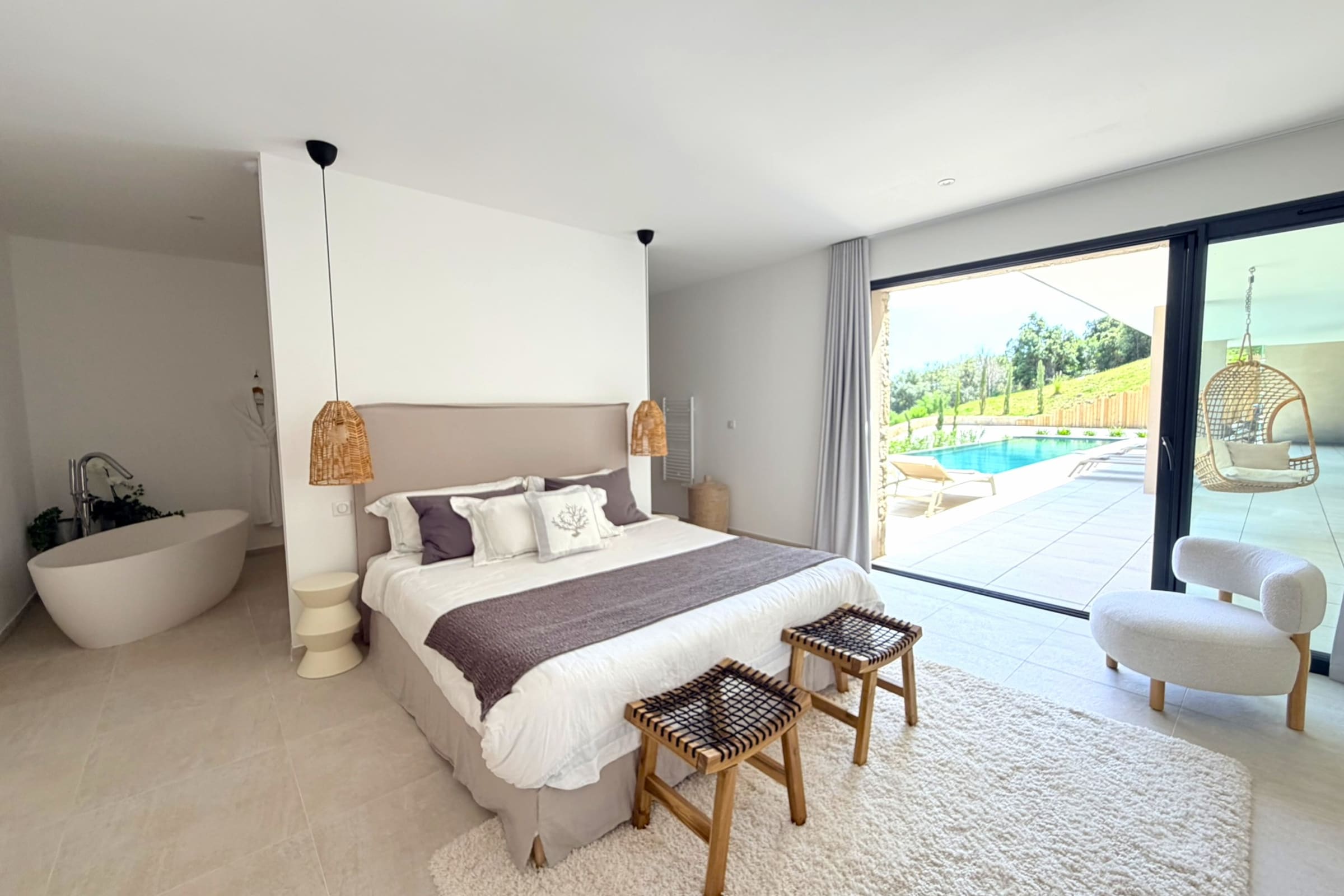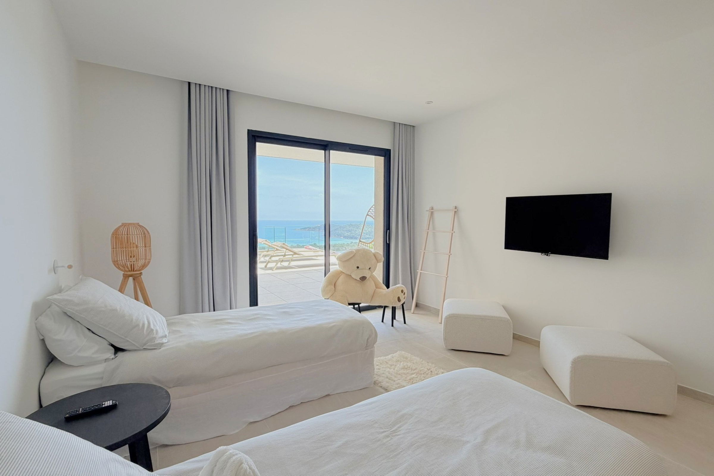 This sumptuous villa of 360 m2 offers an elegant and comfortable living environment, ideal for accommodating up to 12 people. The living areas are spacious and designed to combine conviviality and functionality. The fully equipped kitchen includes dishwasher, microwave, Nespresso coffee machine, filter coffee maker, kettle, toaster and SMEG kettle, filter jug, allowing you to easily prepare all meals while having the sea view. This villa has 6 carefully appointed and decorated bedrooms, including a sumptuous master suite equipped with a private bathroom with bathtub. (4 bedrooms on the ground floor of the swimming pool and 2 others upstairs on the level of the living rooms). The rooms offer a variety of beds (double beds, twin beds), perfectly adapted to families or groups of friends. Each room has its own shower room with toilet, guaranteeing privacy and comfort for all occupants. The villa thus has 6 bathrooms in total and 8 toilets (1 guest toilet on each level).