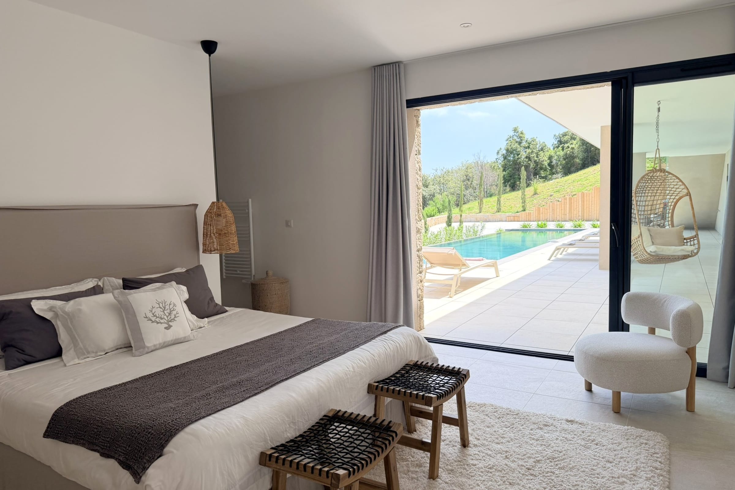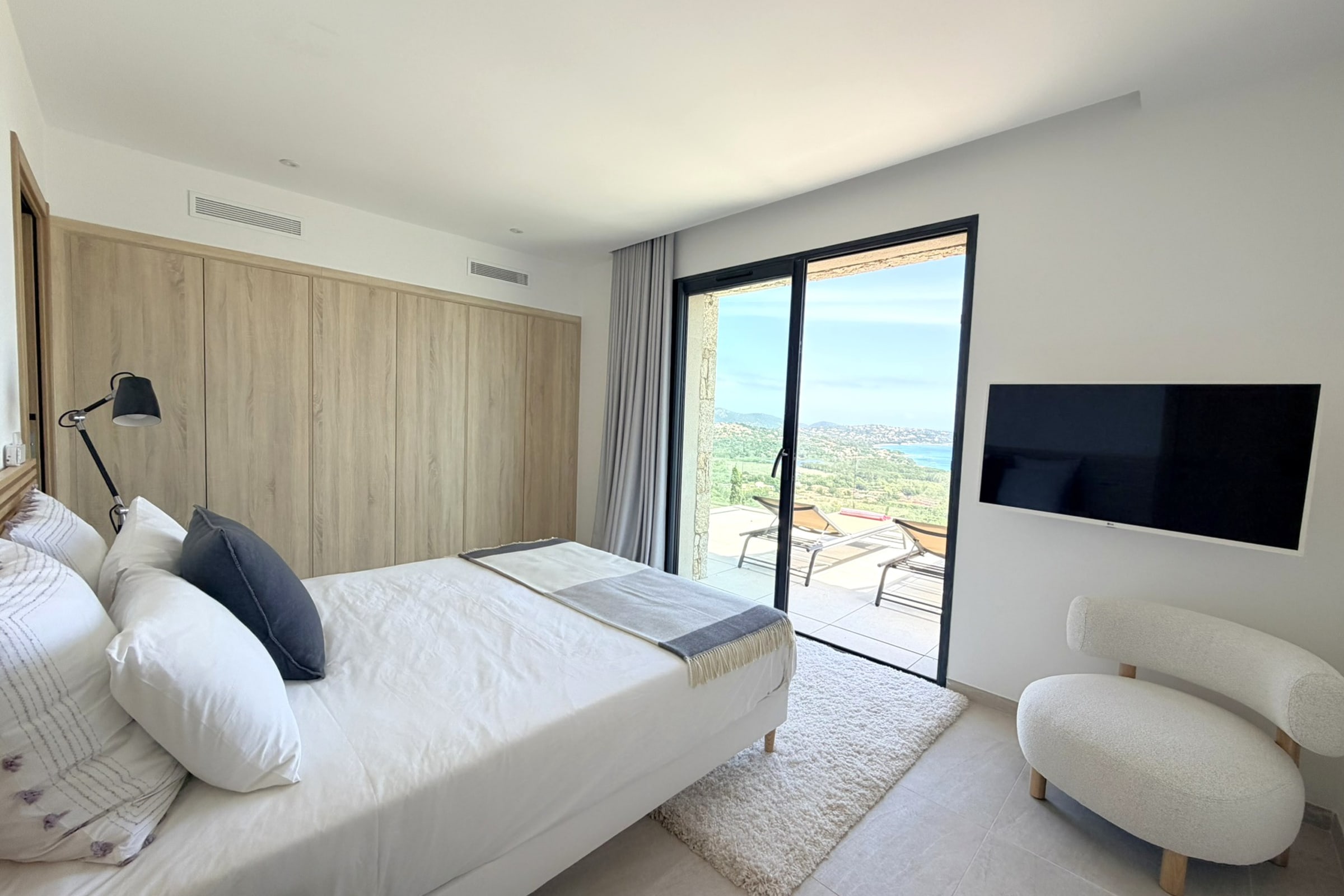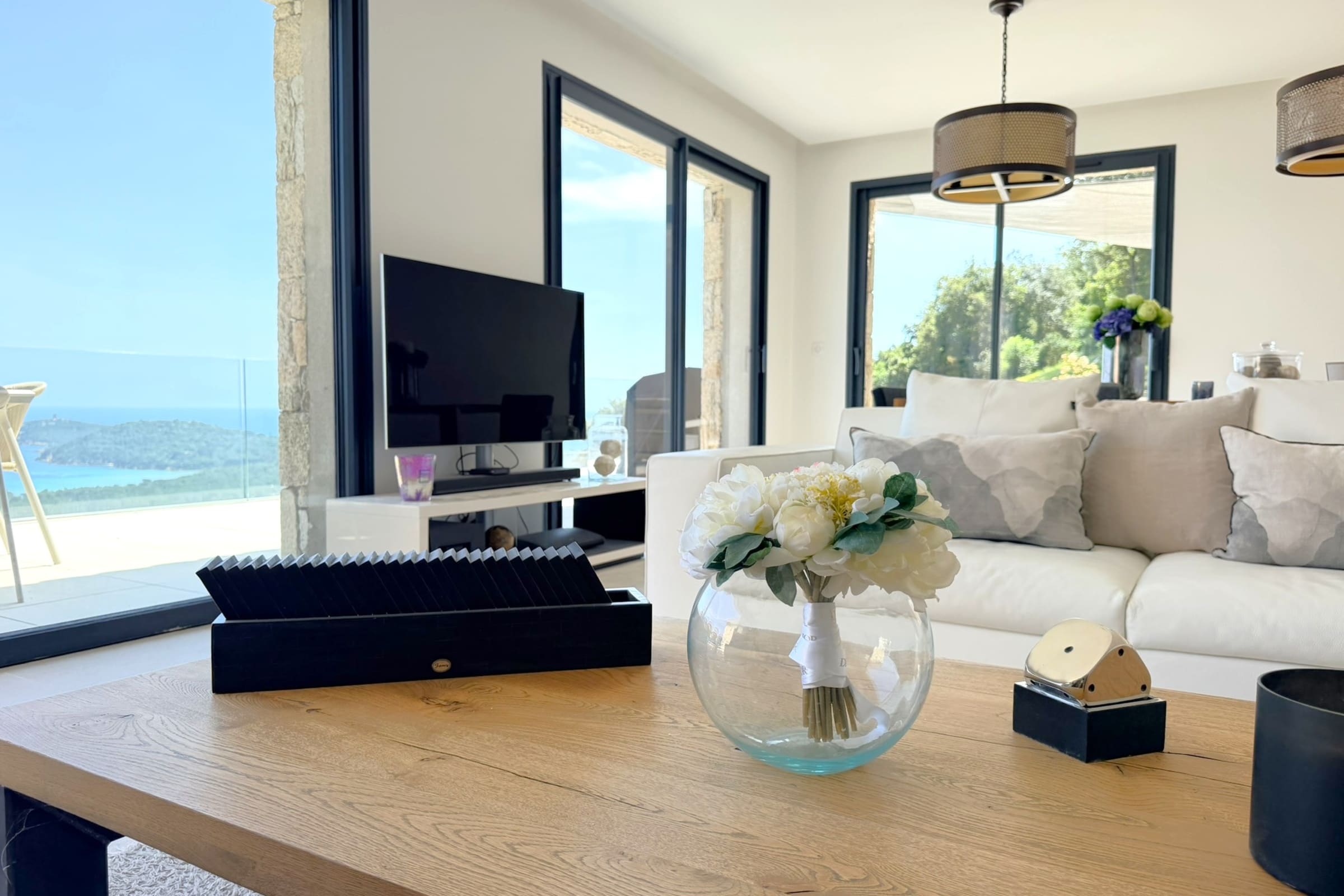 This sumptuous villa of 360 m2 offers an elegant and comfortable living environment, ideal for accommodating up to 12 people. The living areas are spacious and designed to combine conviviality and functionality. The fully equipped kitchen includes dishwasher, microwave, Nespresso coffee machine, filter coffee maker, kettle, toaster and SMEG kettle, filter jug, allowing you to easily prepare all meals while having the sea view. This villa has 6 carefully appointed and decorated bedrooms, including a sumptuous master suite equipped with a private bathroom with bathtub. (4 bedrooms on the ground floor of the swimming pool and 2 others upstairs on the level of the living rooms). The rooms offer a variety of beds (double beds, twin beds), perfectly adapted to families or groups of friends. Each room has its own shower room with toilet, guaranteeing privacy and comfort for all occupants. The villa thus has 6 bathrooms in total and 8 toilets (1 guest toilet on each level).