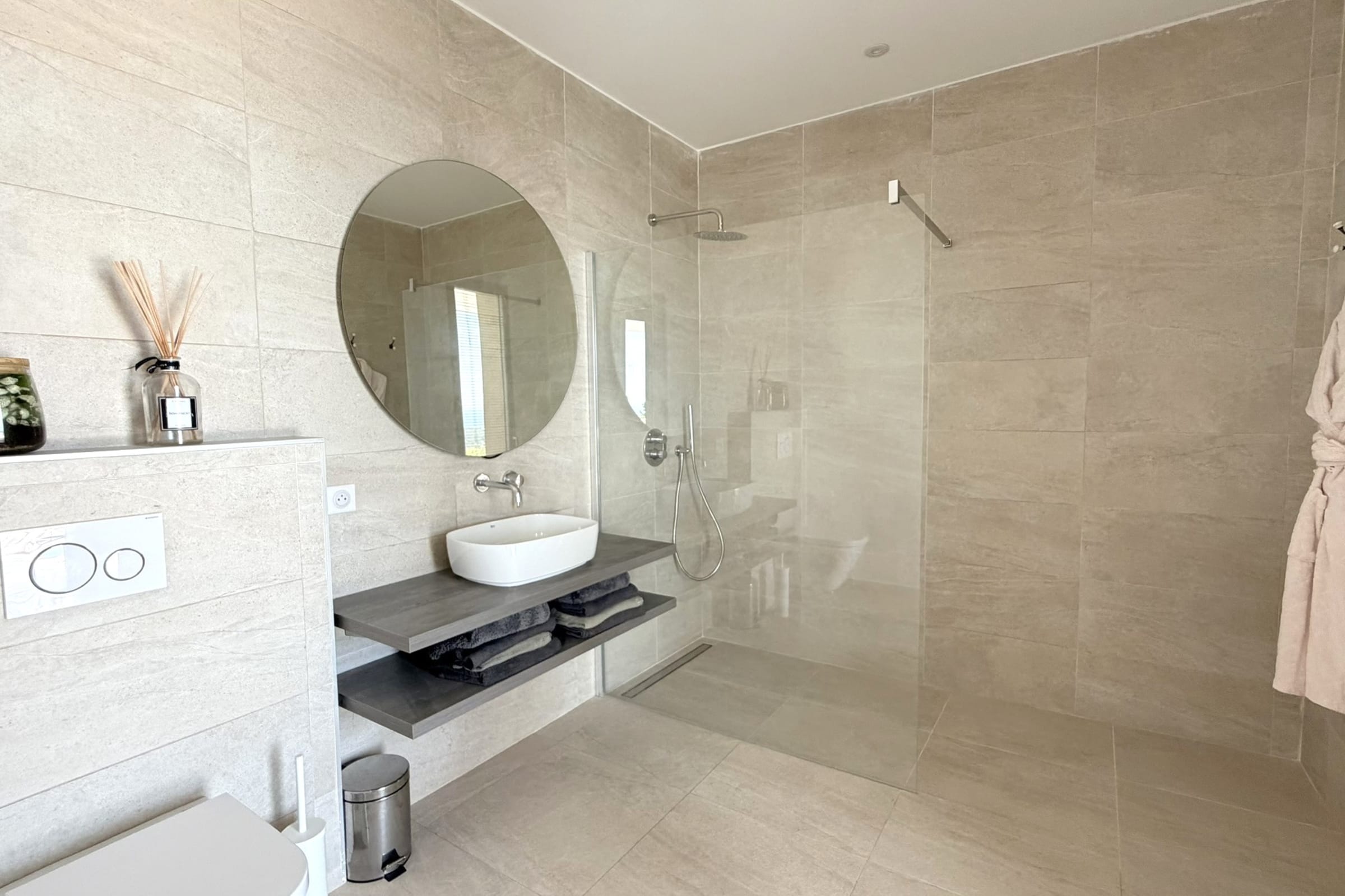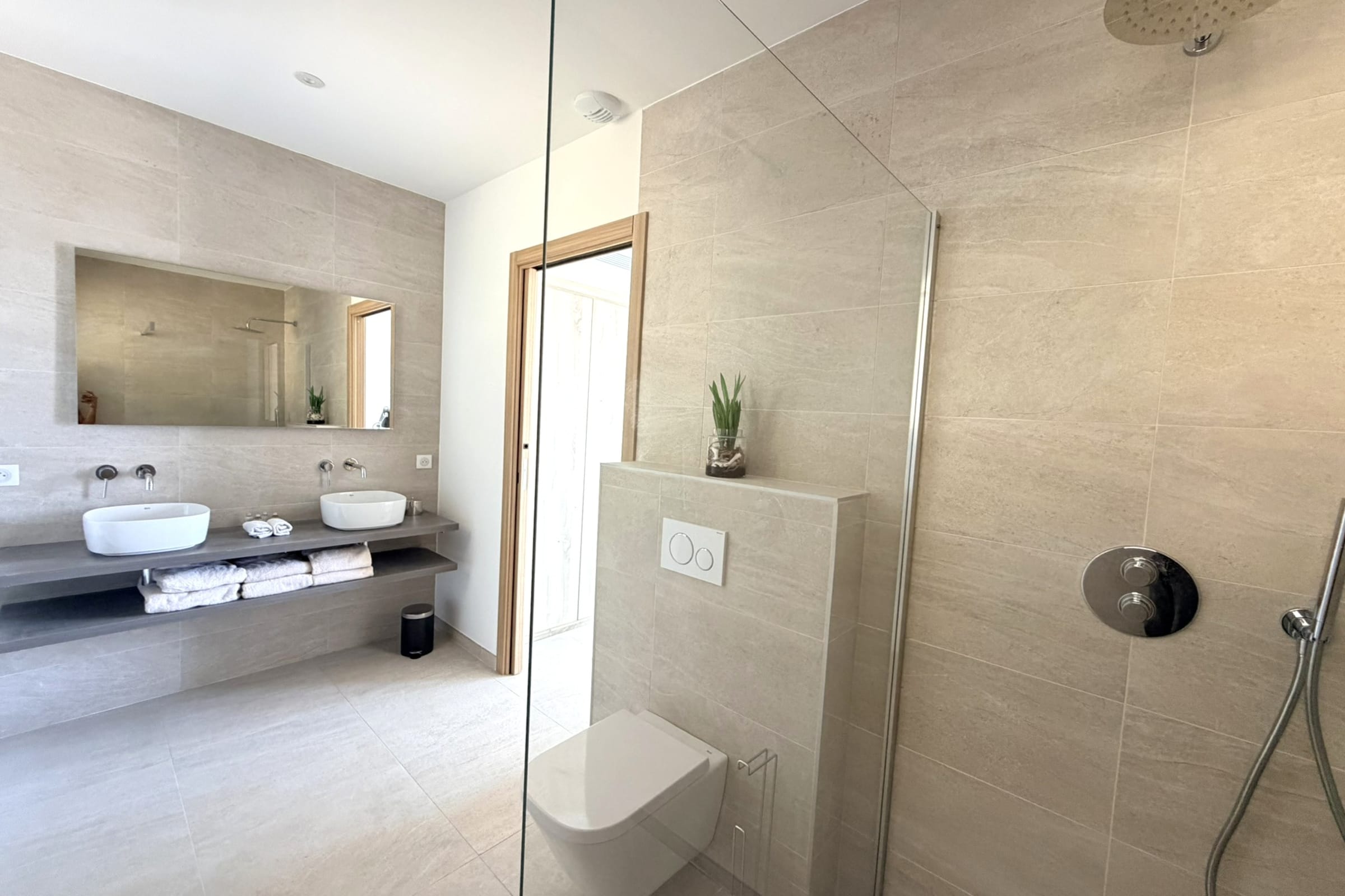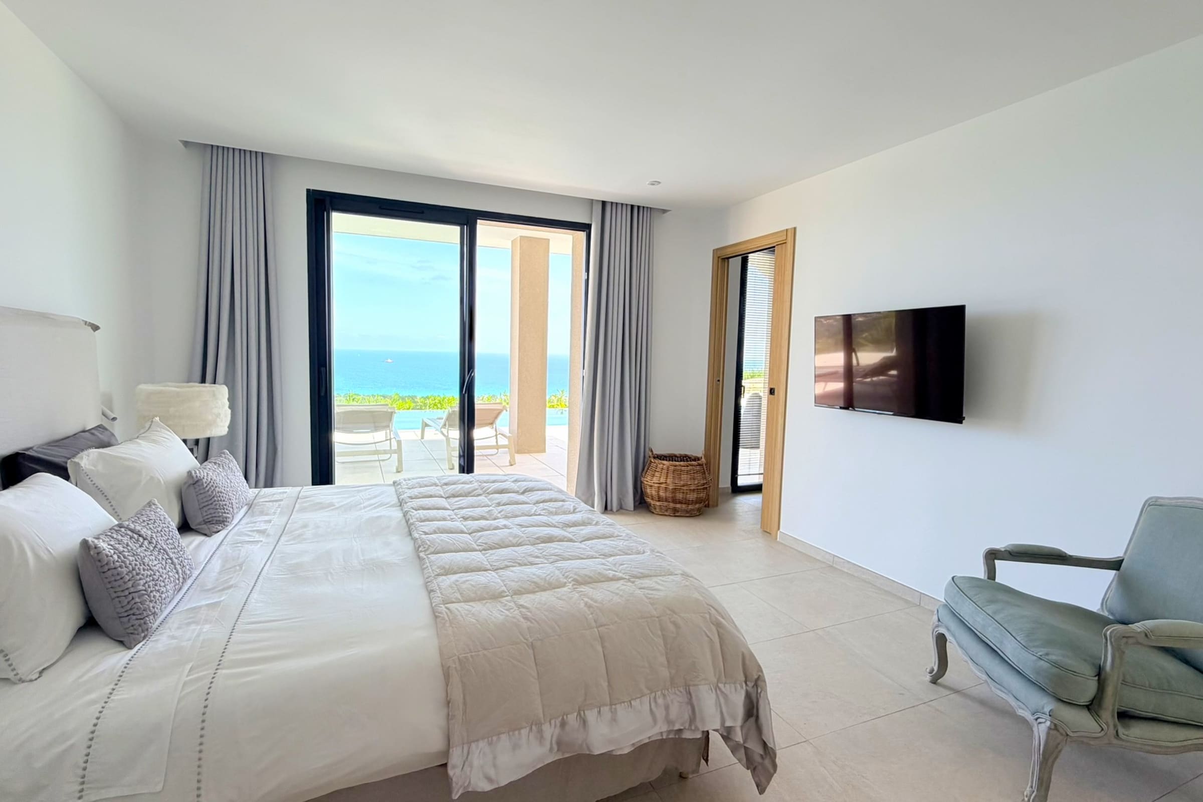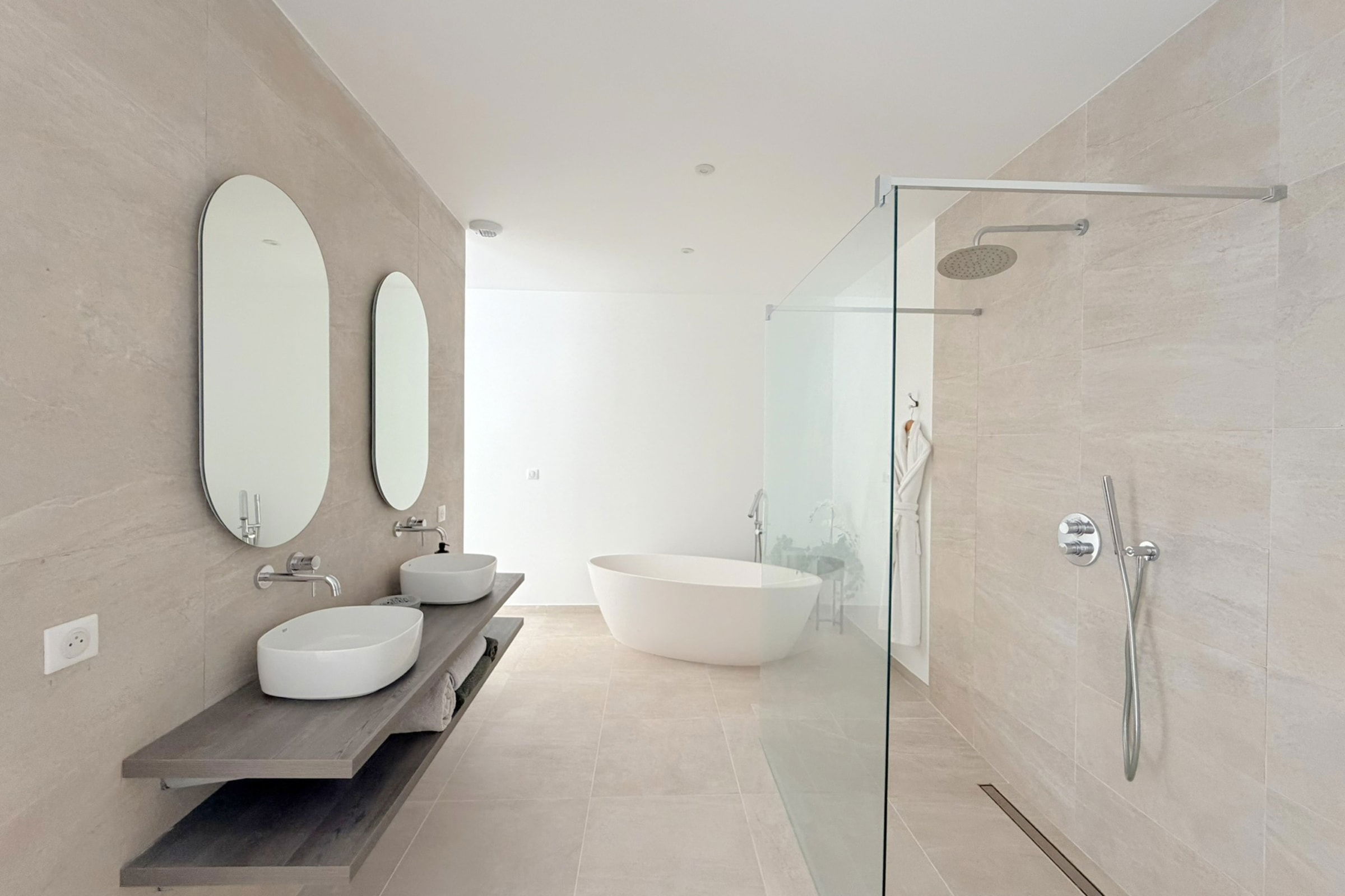 This sumptuous villa of 360 m2 offers an elegant and comfortable living environment, ideal for accommodating up to 12 people. The living areas are spacious and designed to combine conviviality and functionality. The fully equipped kitchen includes dishwasher, microwave, Nespresso coffee machine, filter coffee maker, kettle, toaster and SMEG kettle, filter jug, allowing you to easily prepare all meals while having the sea view. This villa has 6 carefully appointed and decorated bedrooms, including a sumptuous master suite equipped with a private bathroom with bathtub. (4 bedrooms on the ground floor of the swimming pool and 2 others upstairs on the level of the living rooms). The rooms offer a variety of beds (double beds, twin beds), perfectly adapted to families or groups of friends. Each room has its own shower room with toilet, guaranteeing privacy and comfort for all occupants. The villa thus has 6 bathrooms in total and 8 toilets (1 guest toilet on each level).